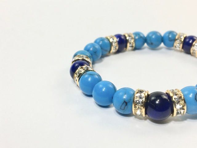 こちらは、8mm玉のターコイズとパープルタイガーアイを使ったパワーストーンブレスレットです。シンプルなデザインでどんなコーディネートにも合わせやすいデザインに仕上げています。サイズは内径約15cmです。気になる方は是非この機会にどうぞ。