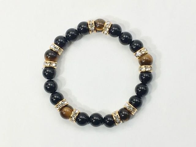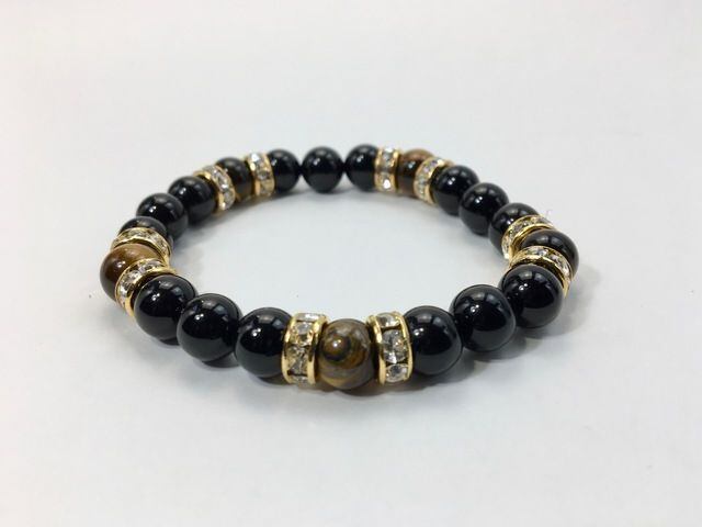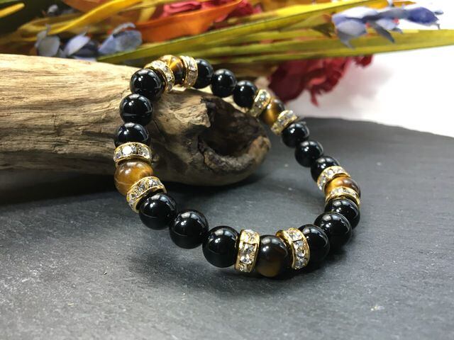 こちらは、8mm玉のオニキスとタイガーアイを使ったパワーストーンブレスレットです。シンプルなデザインでどんなコーディネートにも合わせやすいデザインに仕上げています。サイズは内周約15cmです。気になる方は是非この機会にどうぞ。