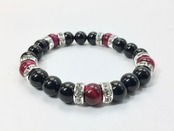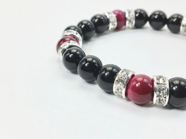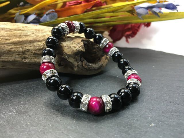 こちらは、8mm玉のオニキスとピンクタイガーアイを使ったパワーストーンブレスレットです。シンプルなデザインでどんなコーディネートにも合わせやすいデザインに仕上げています。サイズは内周約15cmです。気になる方は是非この機会にどうぞ。