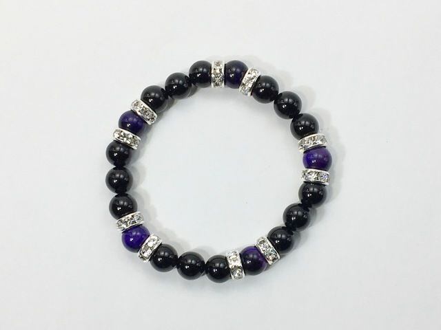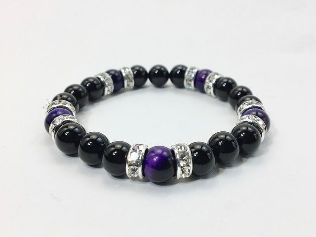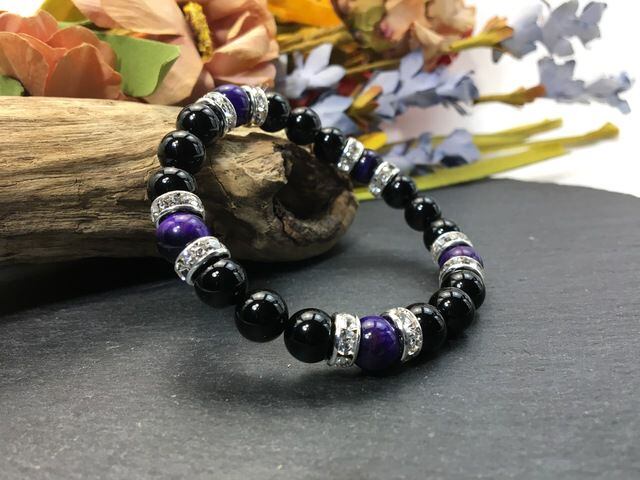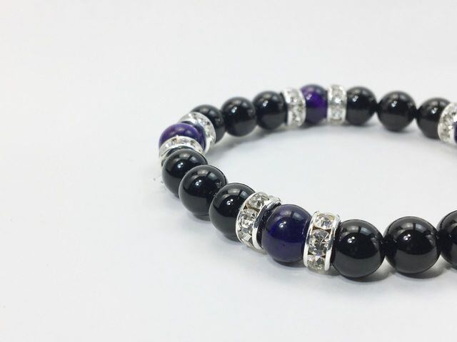 こちらは、8mm玉のオニキスとパープルタイガーアイを使ったパワーストーンブレスレットです。シンプルなデザインでどんなコーディネートにも合わせやすいデザインに仕上げています。サイズは内周約15cmです。気になる方は是非この機会にどうぞ。