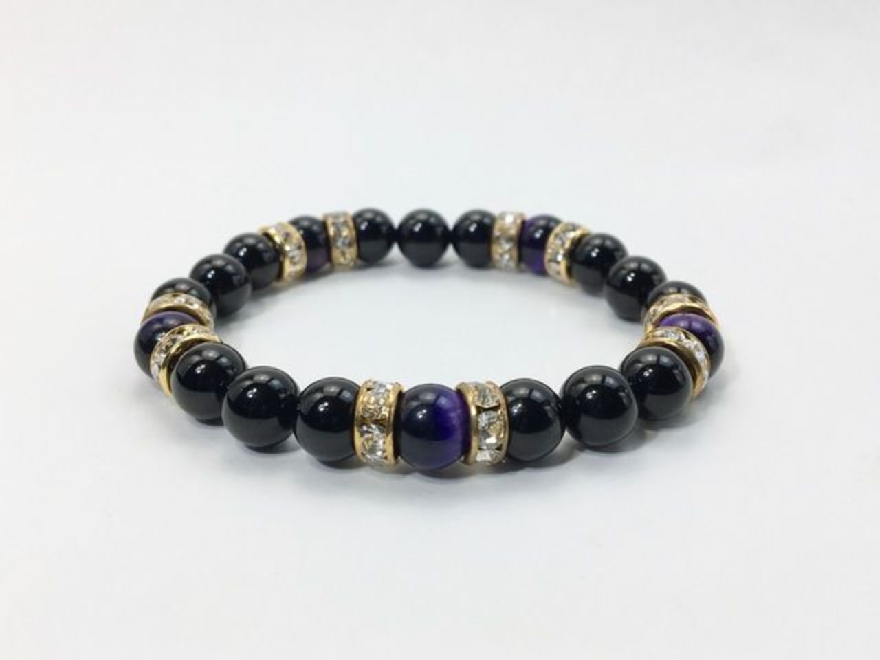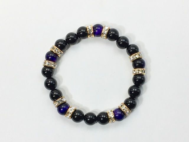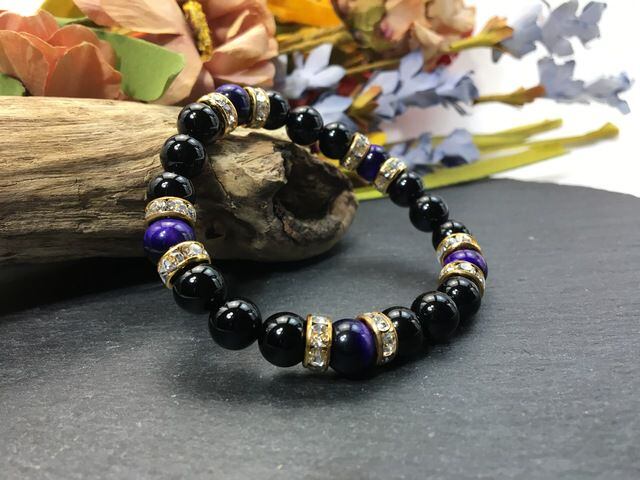 こちらは、8mm玉のオニキスとパープルタイガーアイを使ったパワーストーンブレスレットです。シンプルなデザインでどんなコーディネートにも合わせやすいデザインに仕上げています。サイズは内周約15cmです。気になる方は是非この機会にどうぞ。