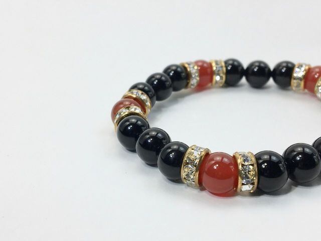 こちらは、8mm玉のオニキスと赤瑪瑙を使ったパワーストーンブレスレットです。シンプルなデザインでどんなコーディネートにも合わせやすいデザインに仕上げています。サイズは内周約15cmです。気になる方は是非この機会にどうぞ。
