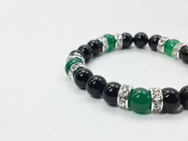 こちらは、8mm玉のオニキスと緑瑪瑙を使用した天然石ブレスレットです。間にはロンデルを挟み高級感ある仕上がりです。石大きさは腕にも馴染みやすいように8mm玉で内周約15cm(伸可能)です。気になる方は是非この機会にどうぞ。