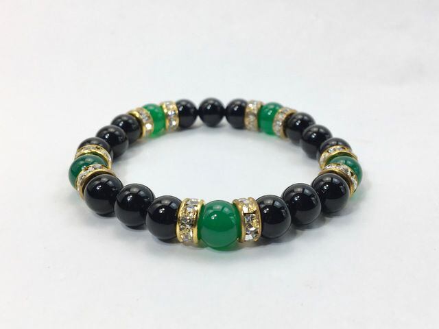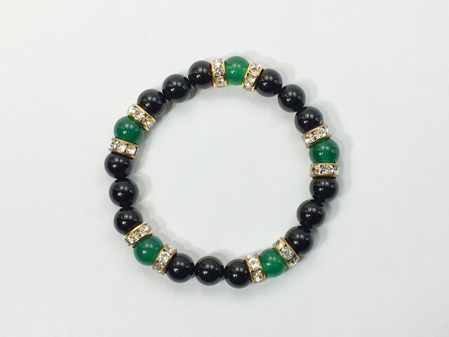 こちらは、8mm玉のオニキスと緑瑪瑙を使用した天然石ブレスレットです。間にはロンデルを挟み高級感ある仕上がりです。石大きさは腕にも馴染みやすいように8mm玉で内周約15cm(伸可能)です。気になる方は是非この機会にどうぞ。
