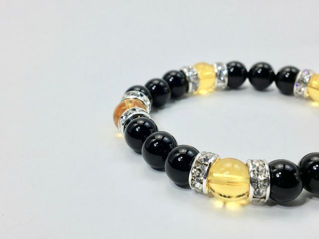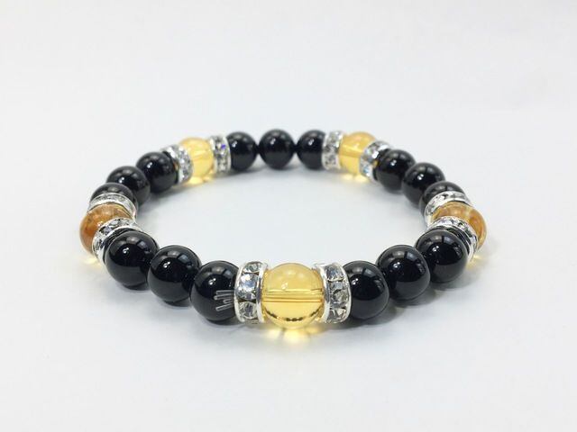 こちらは、8mm玉のオニキスとシトリンを使ったパワーストーンブレスレットです。シンプルなデザインでどんなコーディネートにも合わせやすいデザインに仕上げています。サイズは内周約15cmです。気になる方は是非この機会にどうぞ。