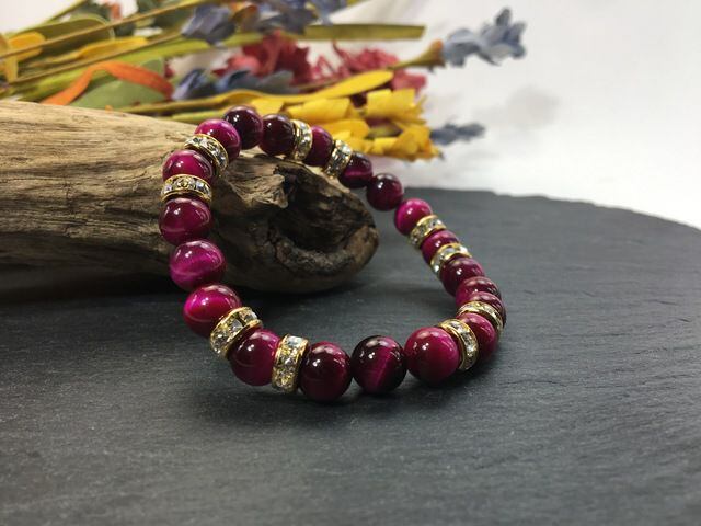 こちらは、8mm玉のピンクタイガーアイを使ったパワーストーンブレスレットです。シンプルなデザインでどんなコーディネートにも合わせやすいデザインに仕上げています。サイズは内周約15cmです。気になる方は是非この機会にどうぞ。