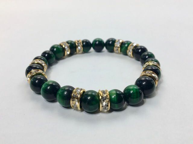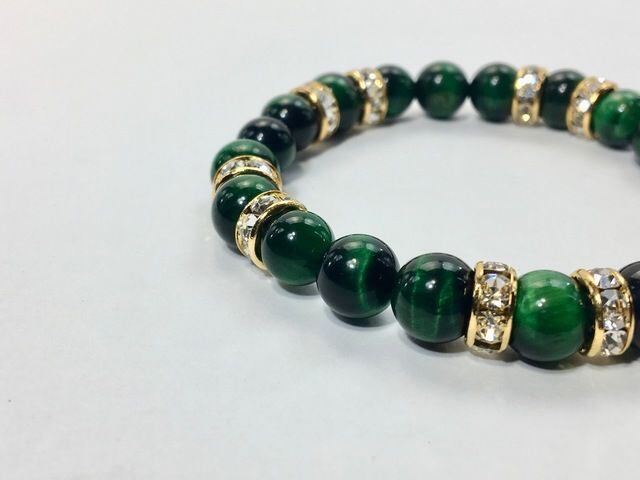 こちらは、8mm玉のグリーンタイガーアイを使ったパワーストーンブレスレットです。シンプルなデザインでどんなコーディネートにも合わせやすいデザインに仕上げています。サイズは内周約15cmです。気になる方は是非この機会にどうぞ。