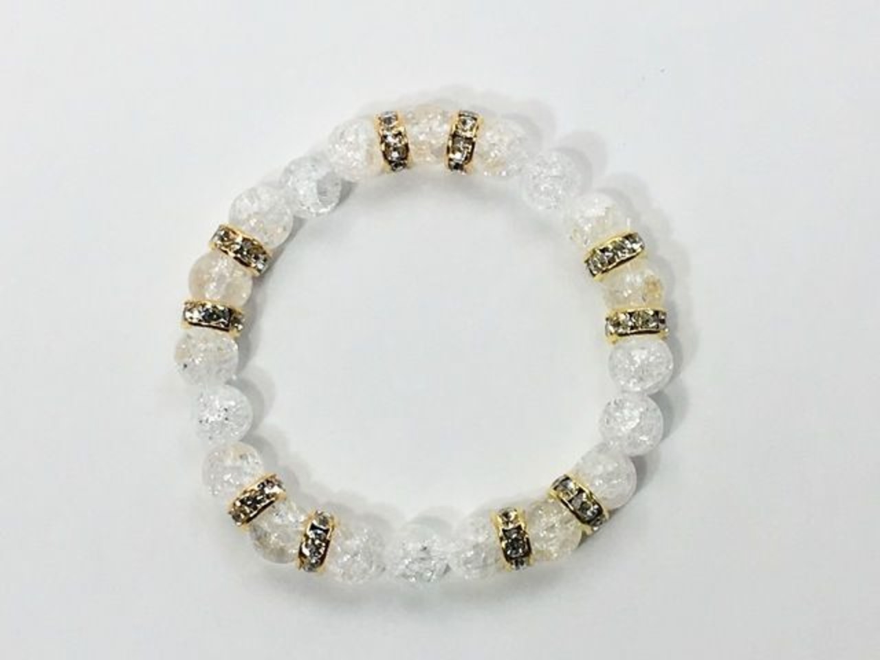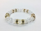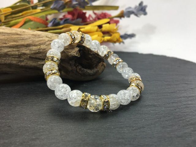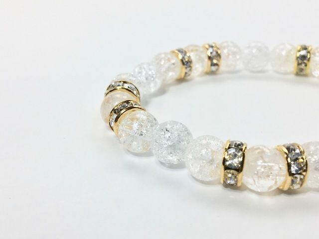 こちらは、8mm玉のクラック水晶を使ったパワーストーンブレスレットです。シンプルなデザインでどんなコーディネートにも合わせやすいデザインに仕上げています。サイズは内周約15cmです。気になる方は是非この機会にどうぞ。