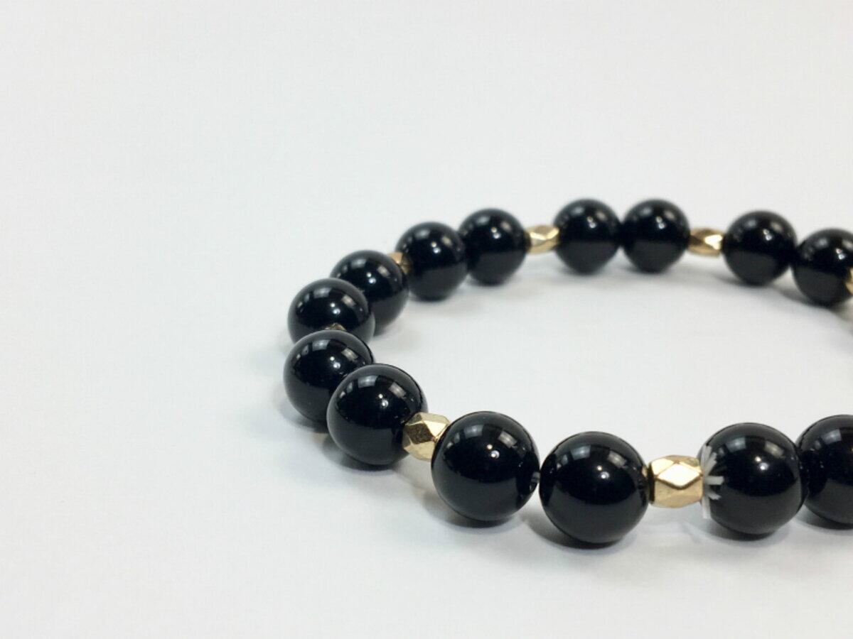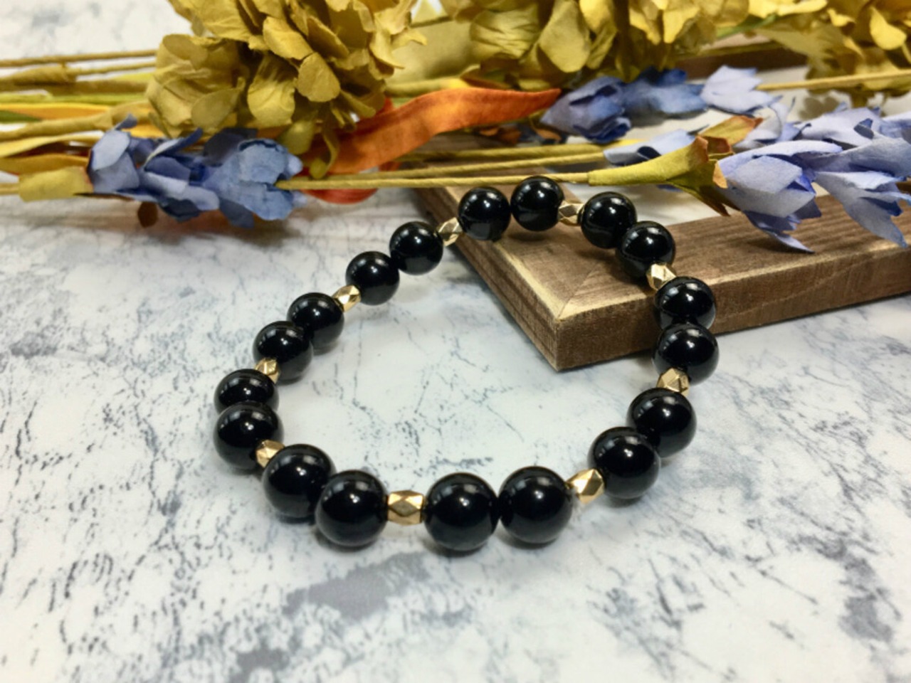 こちらのブレスレットは、ブラックオニキスを使用したブレスレットです。石との間に多面体のゴールドのパーツを挟み上品な印象を演出しております。シンプルなデザインでどんなコーディネートにも合わせやすいデザインです。石大きさは腕にも馴染みやすいように8mm玉を使用、内周 約15cm(伸可能)です。気になる方は是非この機会にどうぞ。