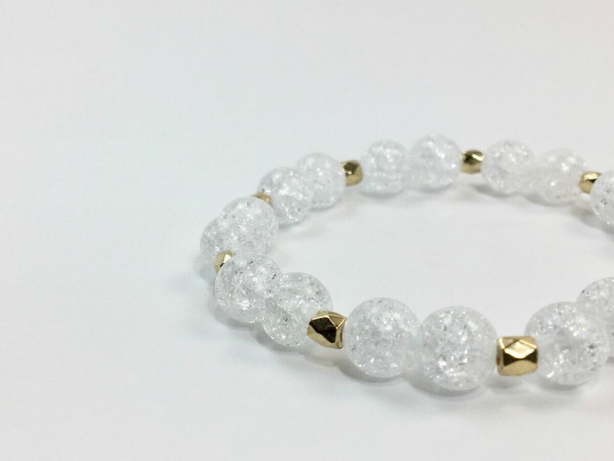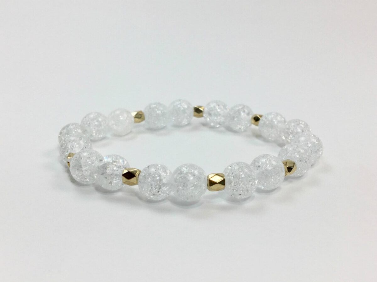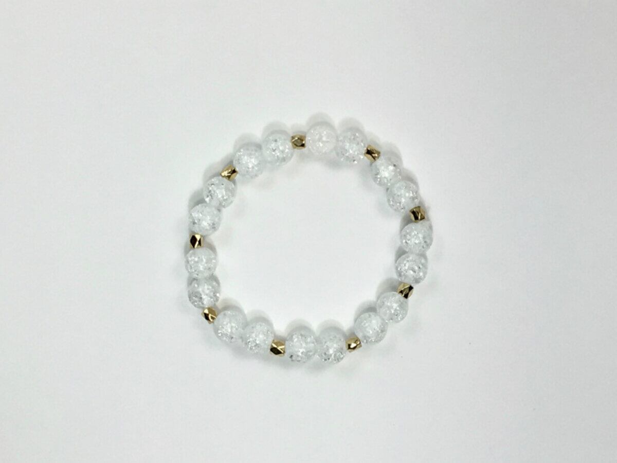 こちらのブレスレットは、クラック水晶を使用したブレスレットです。石との間に多面体のゴールドのパーツを挟み上品な印象を演出しております。シンプルなデザインでどんなコーディネートにも合わせやすいデザインです。石大きさは腕にも馴染みやすいように8mm玉を使用、内周 約15cm(伸可能)です。気になる方は是非この機会にどうぞ。