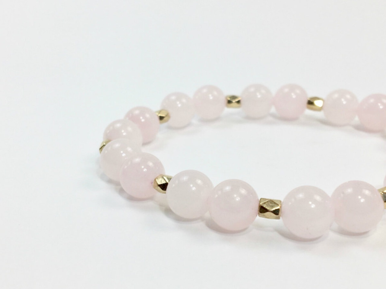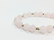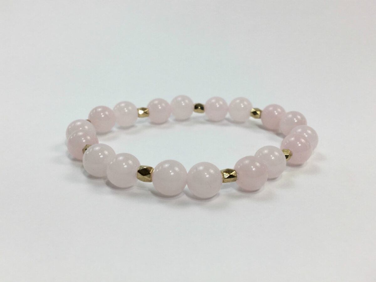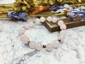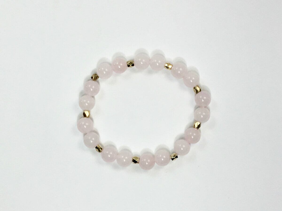 こちらのブレスレットは、ローズクォーツを使用したブレスレットです。石との間に多面体のゴールドのパーツを挟み上品な印象を演出しております。シンプルなデザインでどんなコーディネートにも合わせやすいデザインです。石大きさは腕にも馴染みやすいように8mm玉を使用、内周 約15cm(伸可能)です。気になる方は是非この機会にどうぞ。
