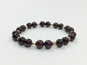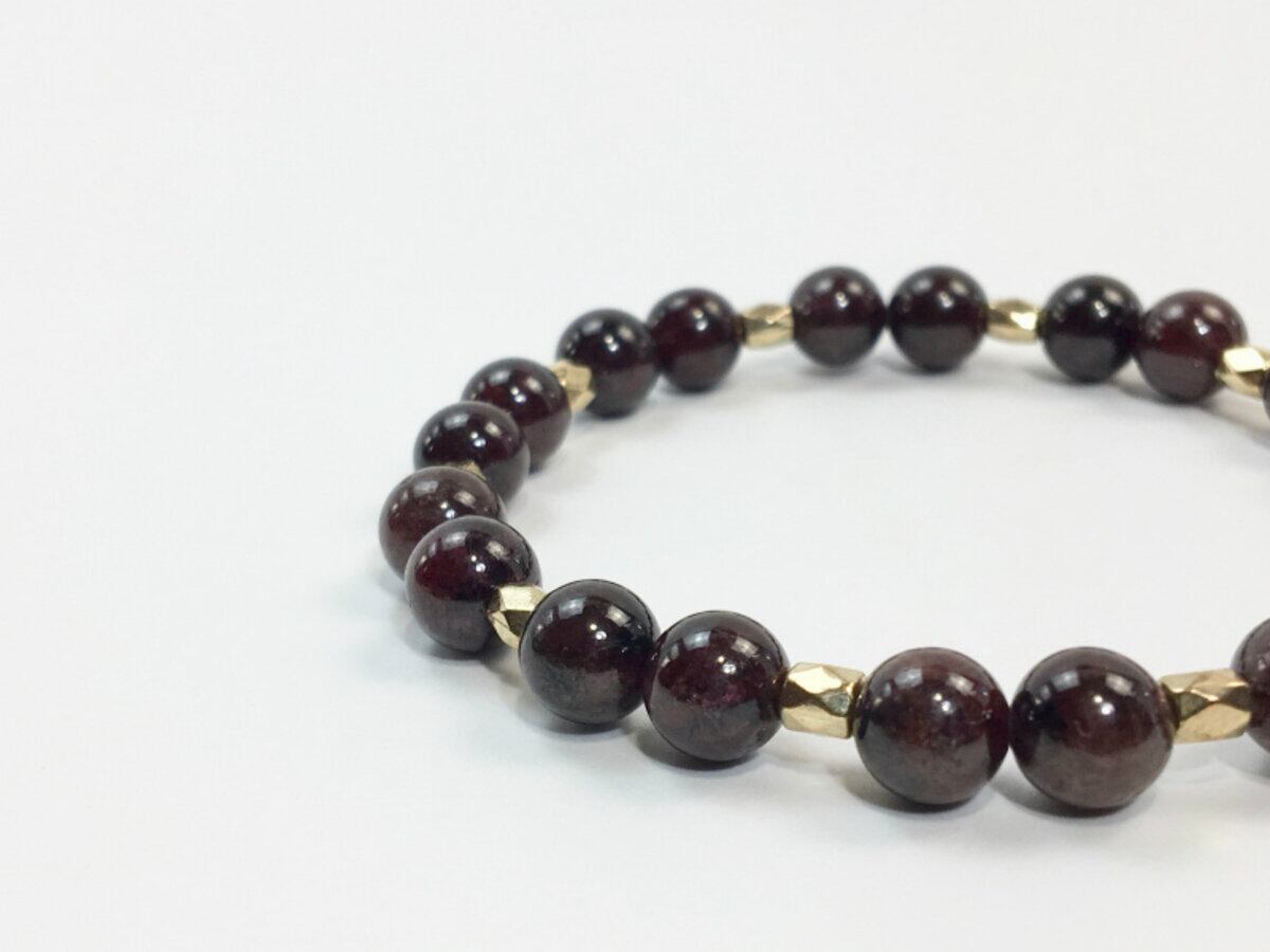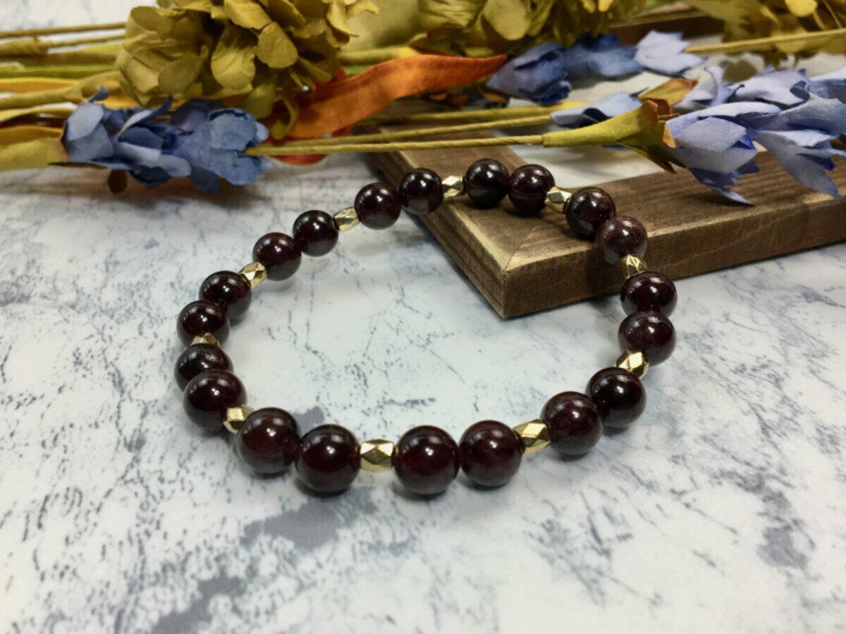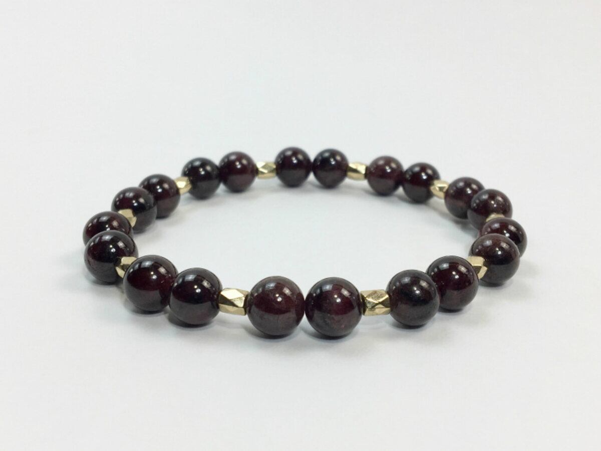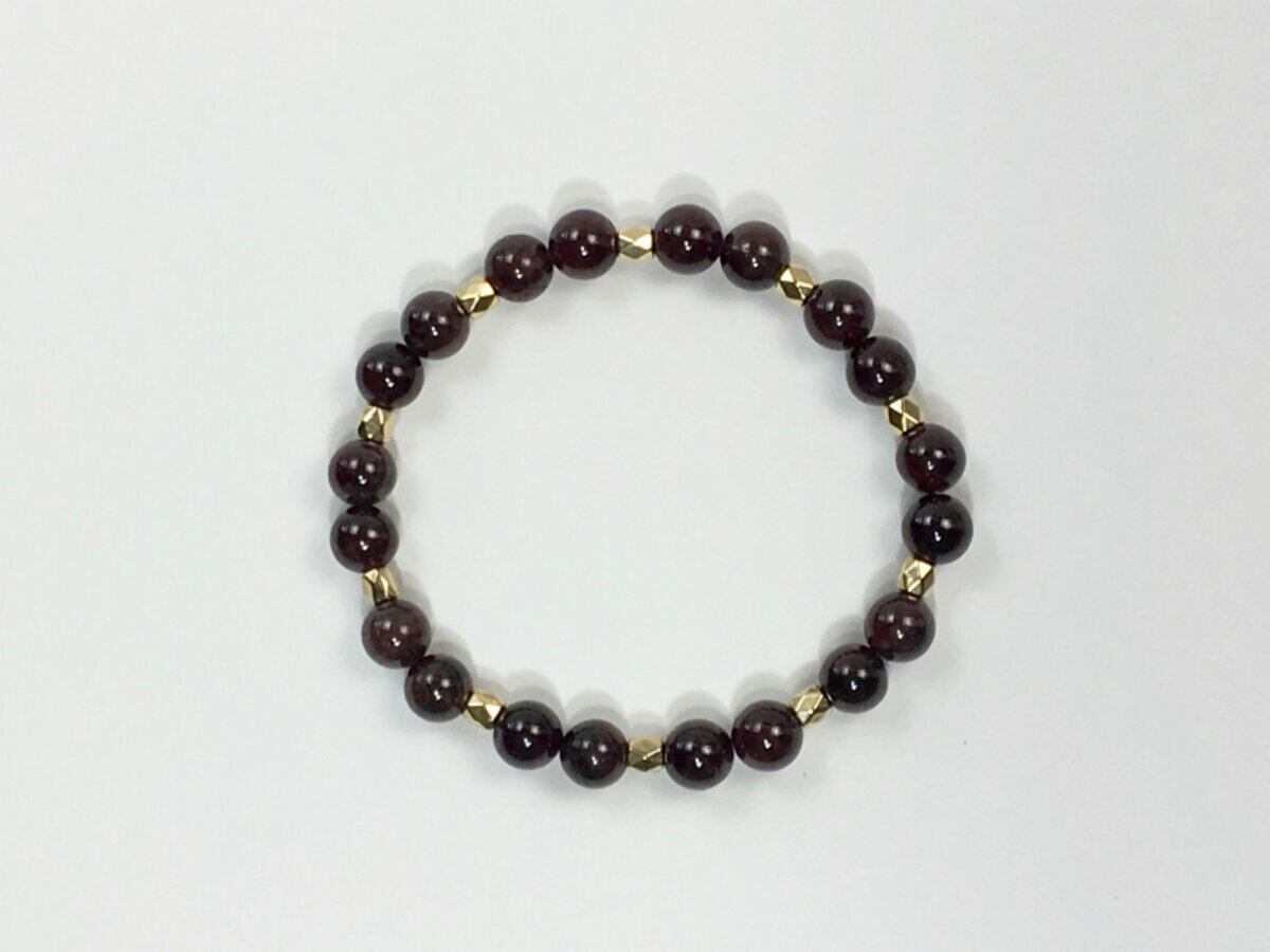 こちらのブレスレットは、ガーネットを使用したブレスレットです。石との間に多面体のゴールドのパーツを挟み上品な印象を演出しております。シンプルなデザインでどんなコーディネートにも合わせやすいデザインです。石大きさは腕にも馴染みやすいように8mm玉を使用、内周 約15cm(伸可能)です。気になる方は是非この機会にどうぞ。