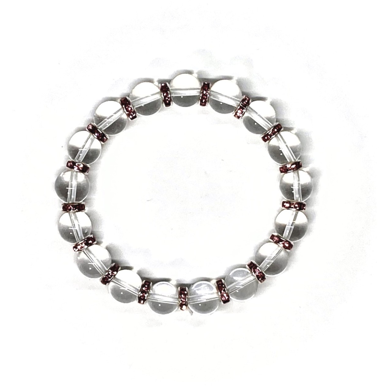 こちらは、水晶の8mm玉を使用したパワーストーンブレスレットです。石との間にはロンデルを挟み高級感を演出しております。シンプルなデザインは、シーン問わずどんなコーディネートとも合わせ易いブレスレットです。サイズは内周約15cm (手首周りを測り少し余裕をもってお買い求めくださいませ。)です。当社の中でも一番人気の実績があるデザインとなっております。気になる方はお早めにどうぞ。