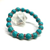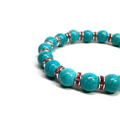 こちらは、ターコイズの8mm玉を使用したパワーストーンブレスレットです。石との間にはロンデルを挟み高級感を演出しております。シンプルなデザインは、シーン問わずどんなコーディネートとも合わせ易いブレスレットです。サイズは内周約15cm (手首周りを測り少し余裕をもってお買い求めくださいませ。)です。当社の中でも一番人気の実績があるデザインとなっております。気になる方はお早めにどうぞ。
