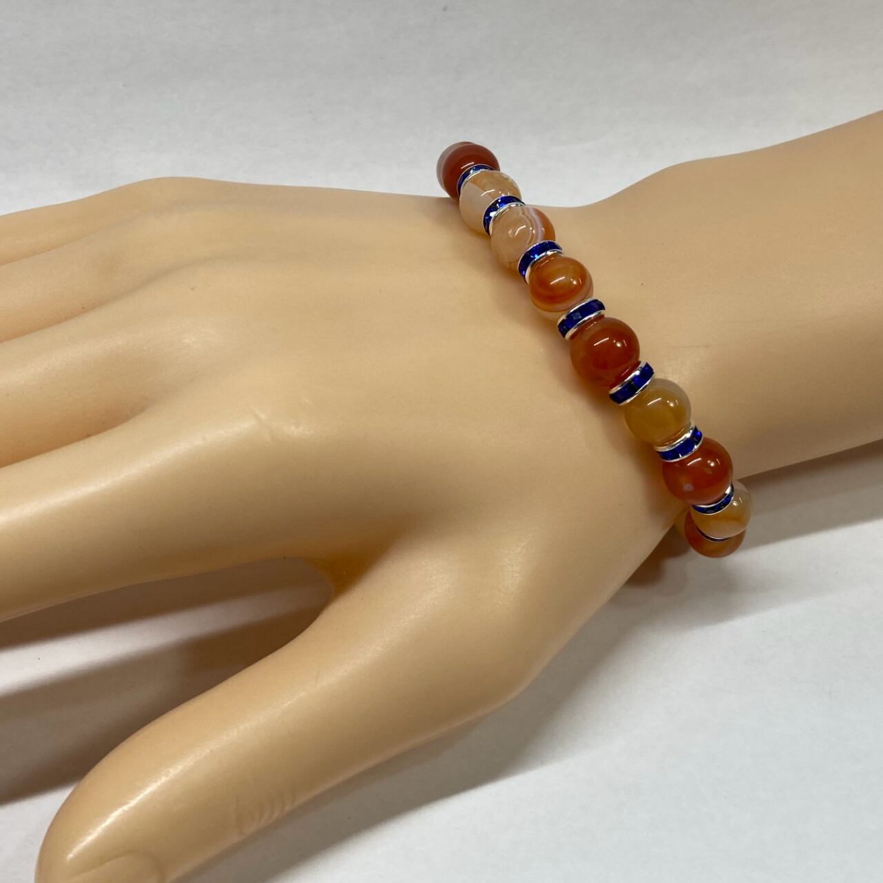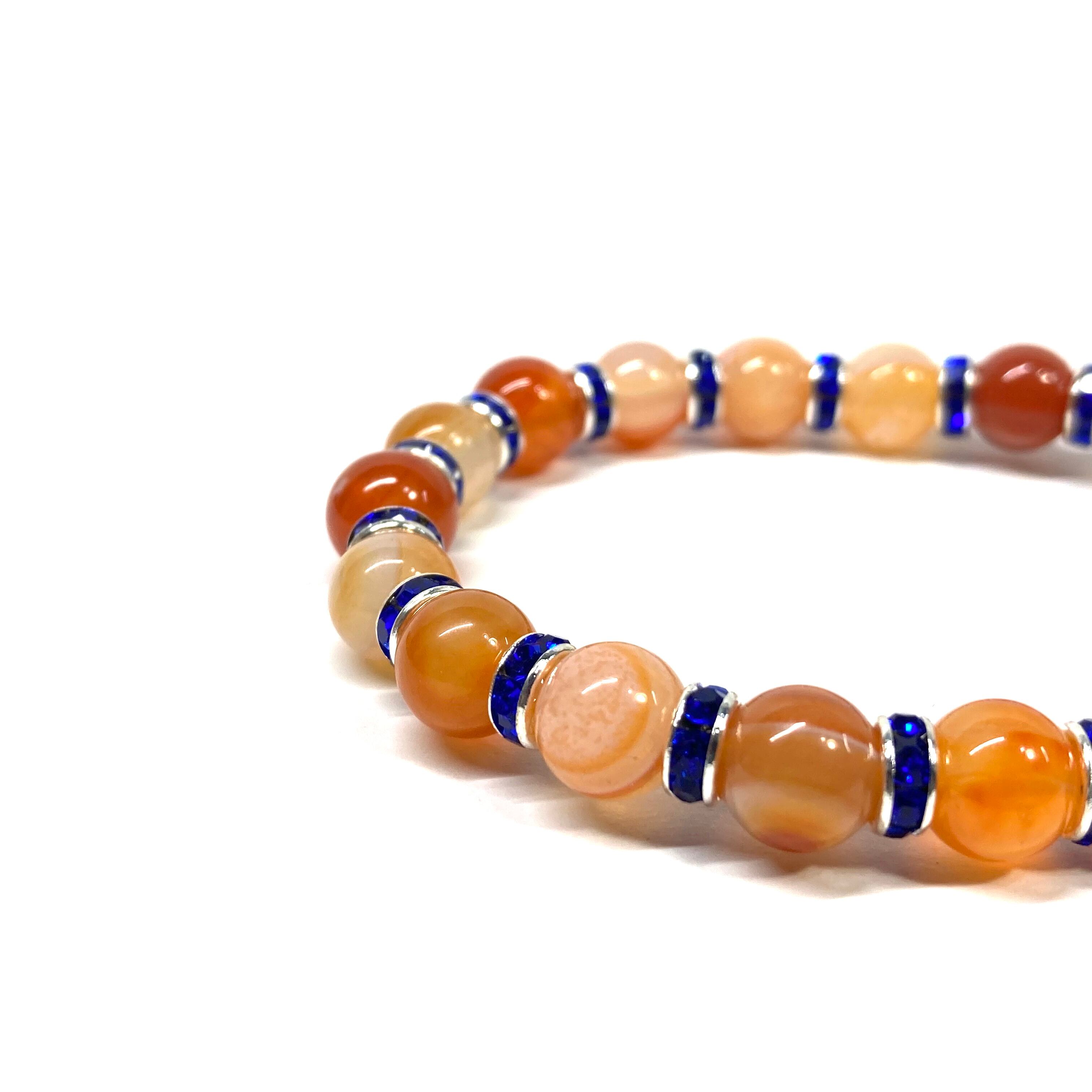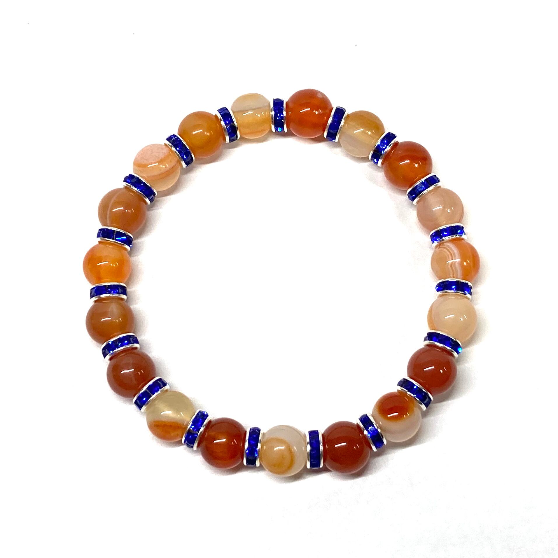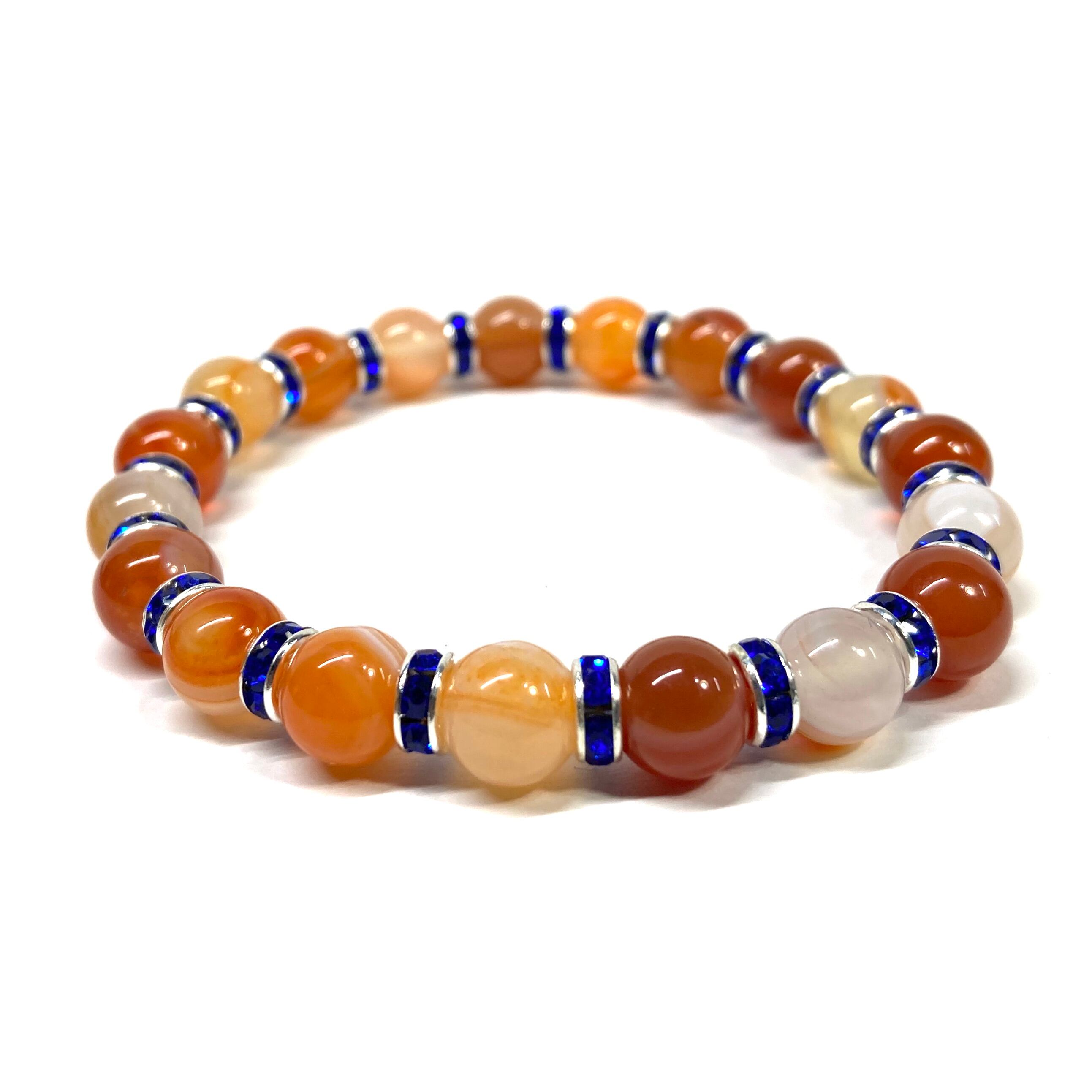 こちらは、カーネリアン・サードニクスの8mm玉を使用したパワーストーンブレスレットです。石との間にはロンデルを挟み高級感を演出しております。シンプルなデザインは、シーン問わずどんなコーディネートとも合わせ易いブレスレットです。サイズは内周約15cm (手首周りを測り少し余裕をもってお買い求めくださいませ。)です。当社の中でも一番人気の実績があるデザインとなっております。気になる方はお早めにどうぞ。
