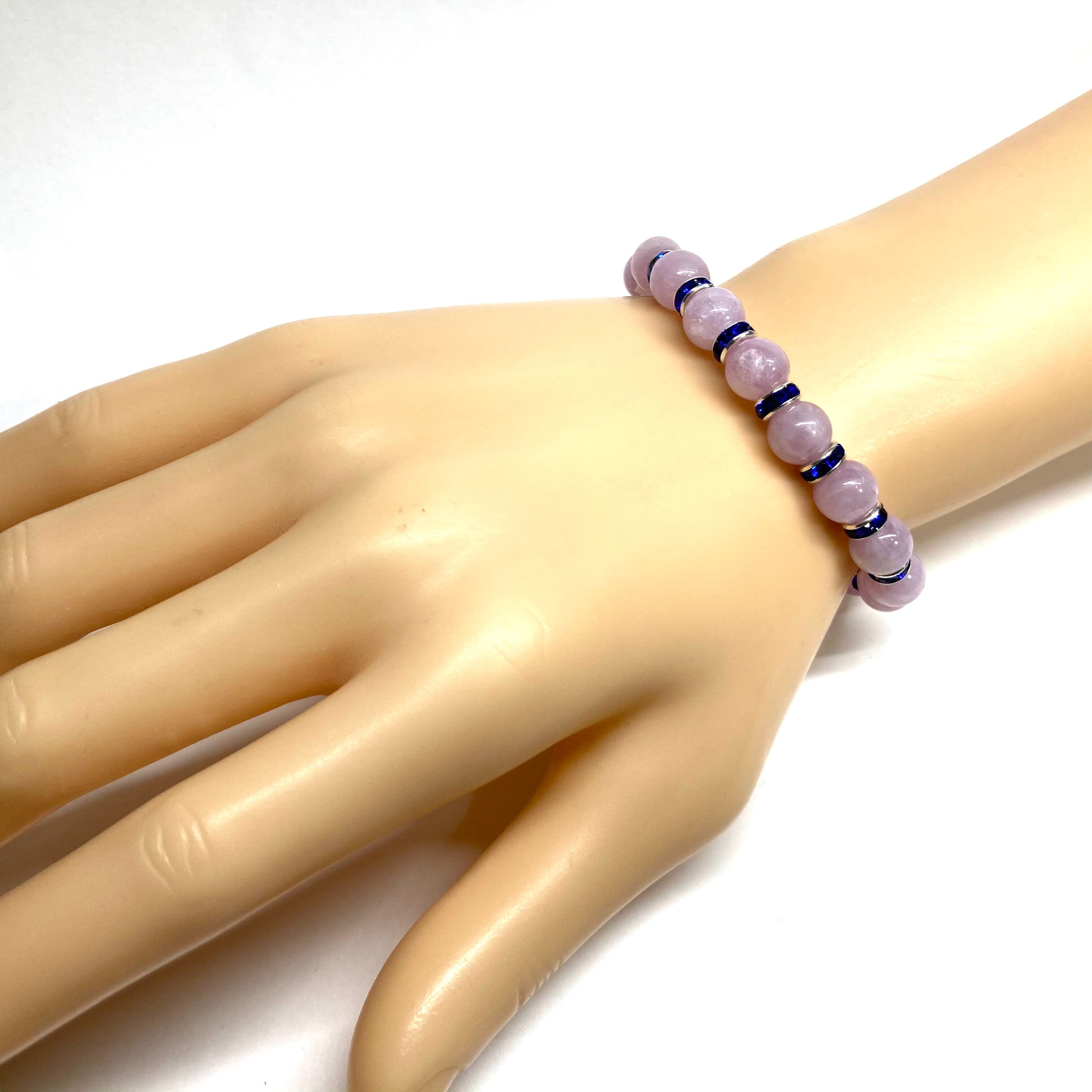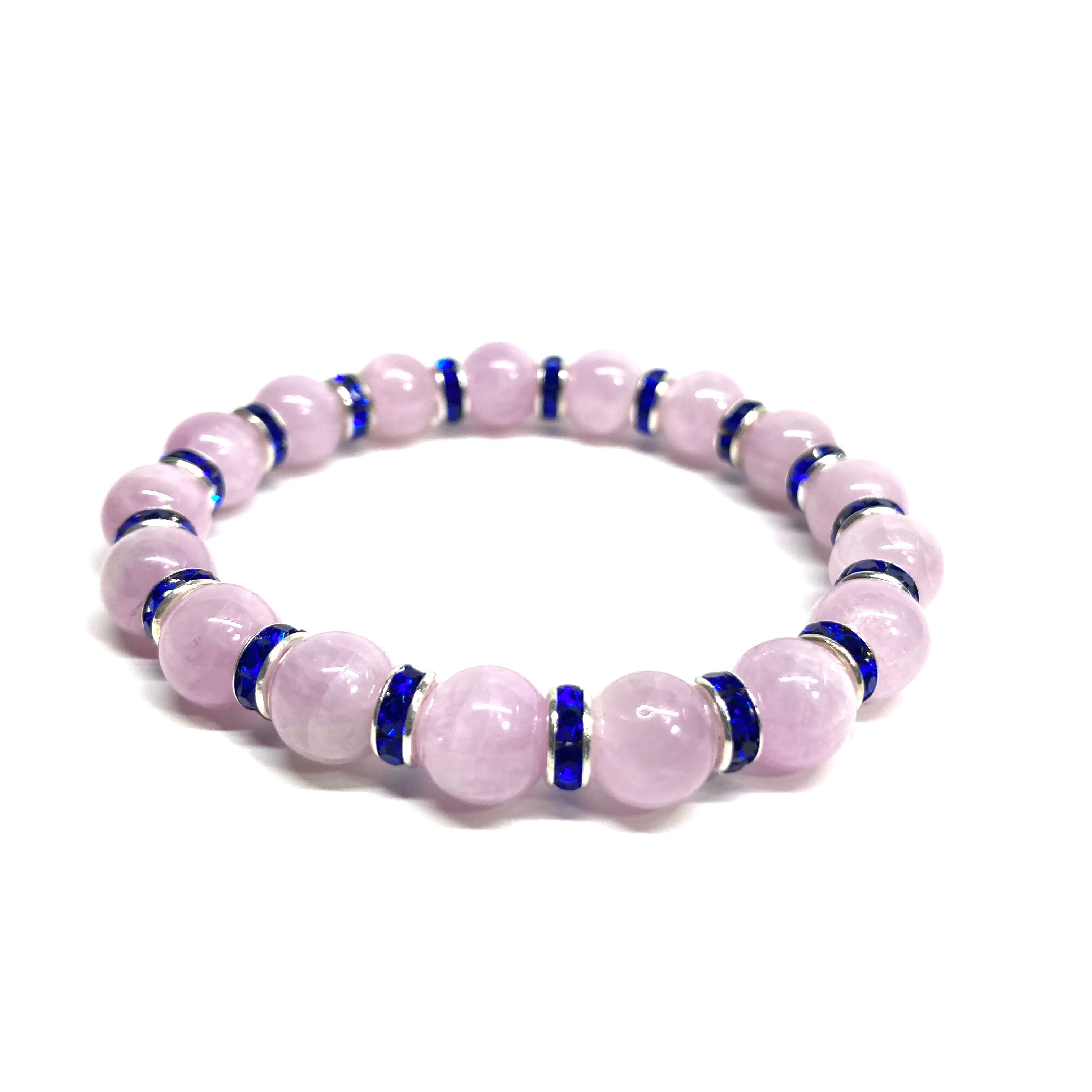 こちらは、クンツァイトの8mm玉を使用したパワーストーンブレスレットです。石との間にはロンデルを挟み高級感を演出しております。シンプルなデザインは、シーン問わずどんなコーディネートとも合わせ易いブレスレットです。サイズは内周約15cm (手首周りを測り少し余裕をもってお買い求めくださいませ。)です。当社の中でも一番人気の実績があるデザインとなっております。気になる方はお早めにどうぞ。