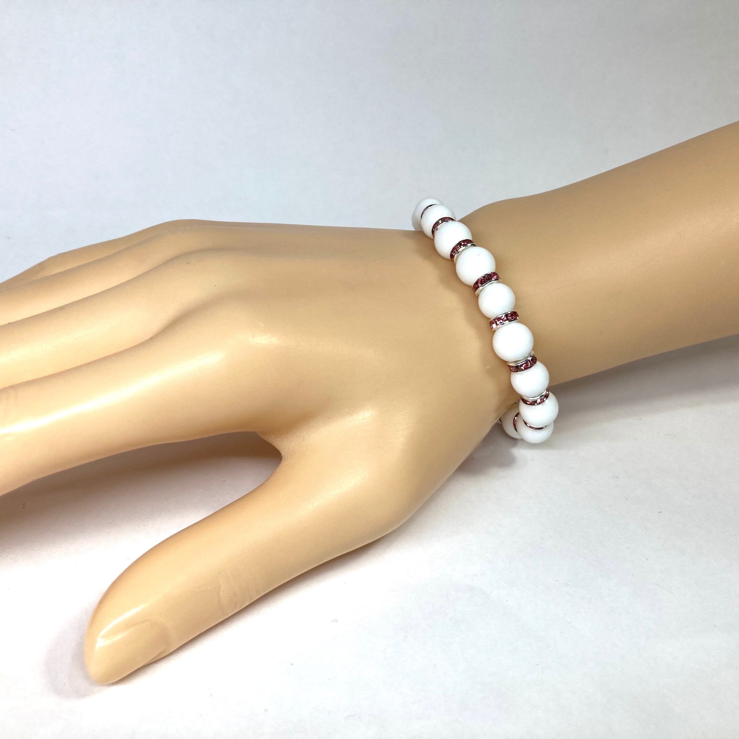 こちらは、ホワイトオニキスの8mm玉を使用したパワーストーンブレスレットです。石との間にはロンデルを挟み高級感を演出しております。シンプルなデザインは、シーン問わずどんなコーディネートとも合わせ易いブレスレットです。サイズは内周約15cm (手首周りを測り少し余裕をもってお買い求めくださいませ。)です。当社の中でも一番人気の実績があるデザインとなっております。気になる方はお早めにどうぞ。