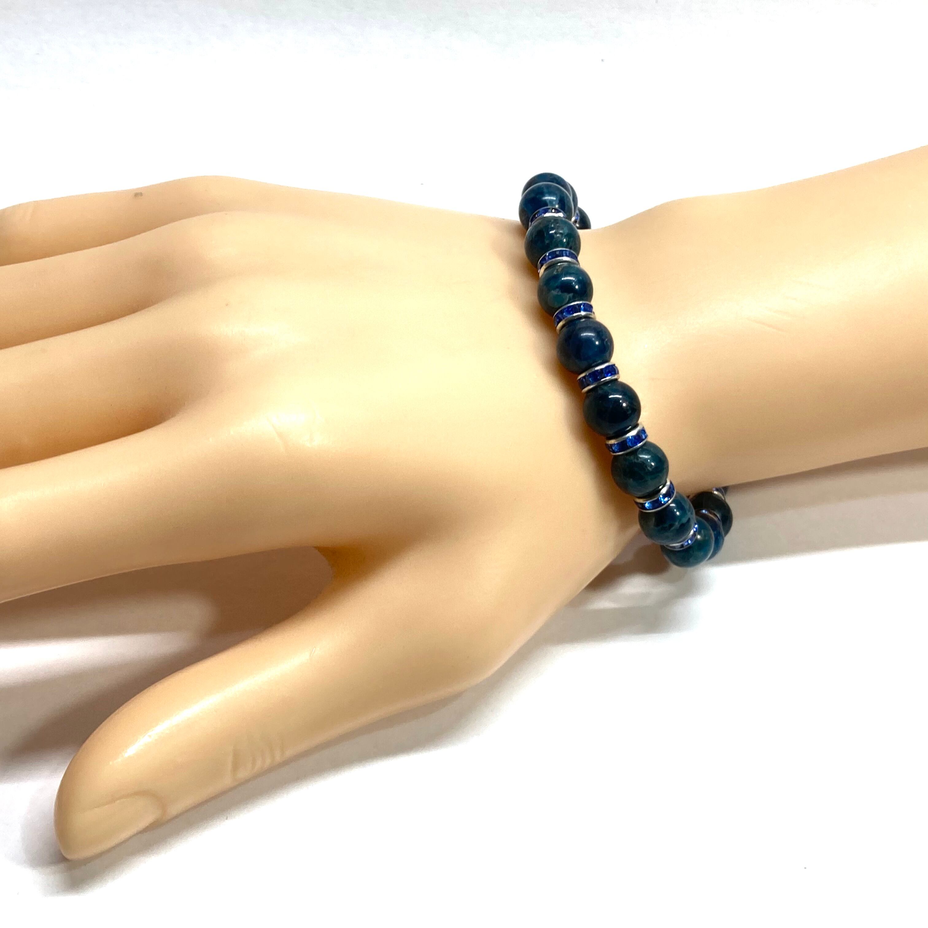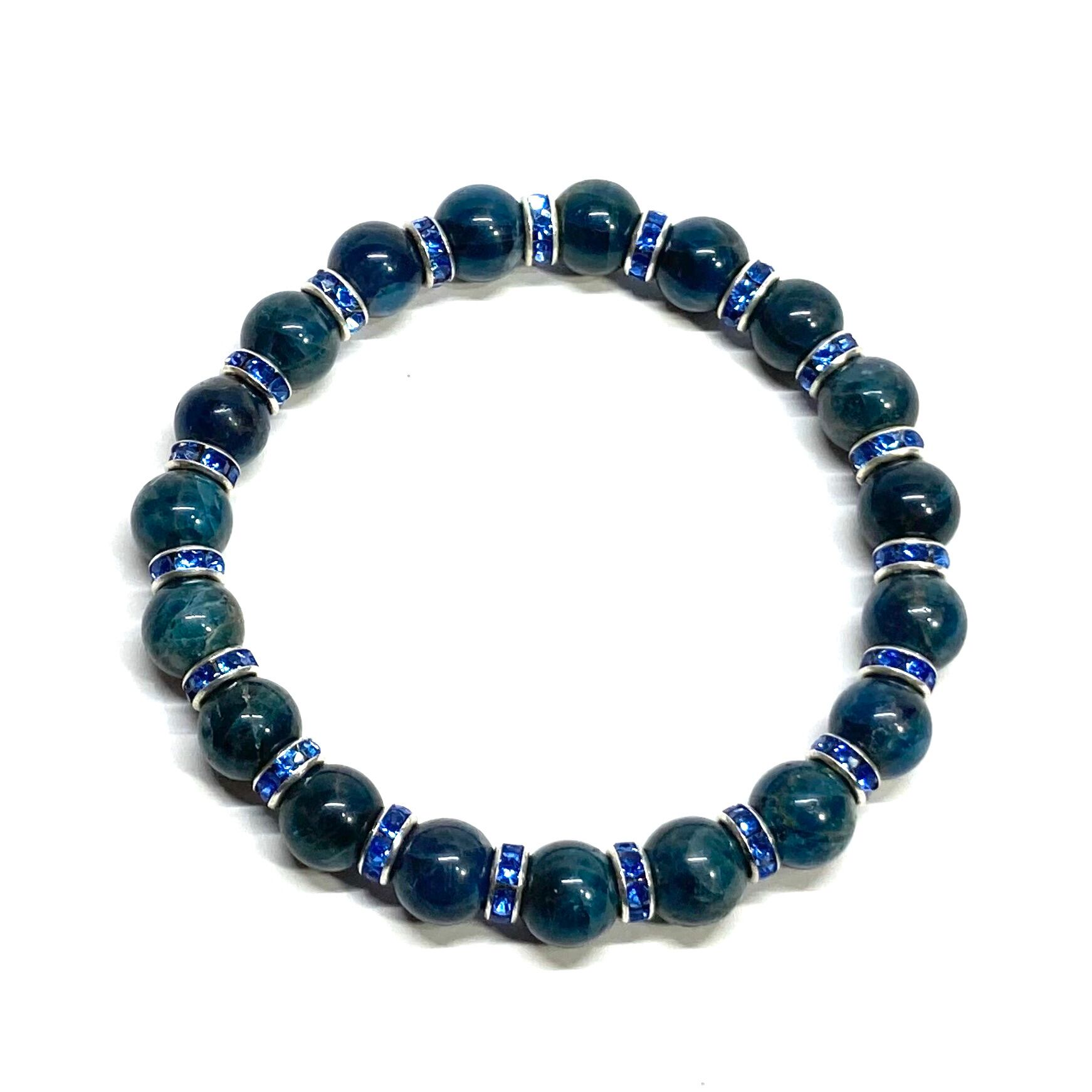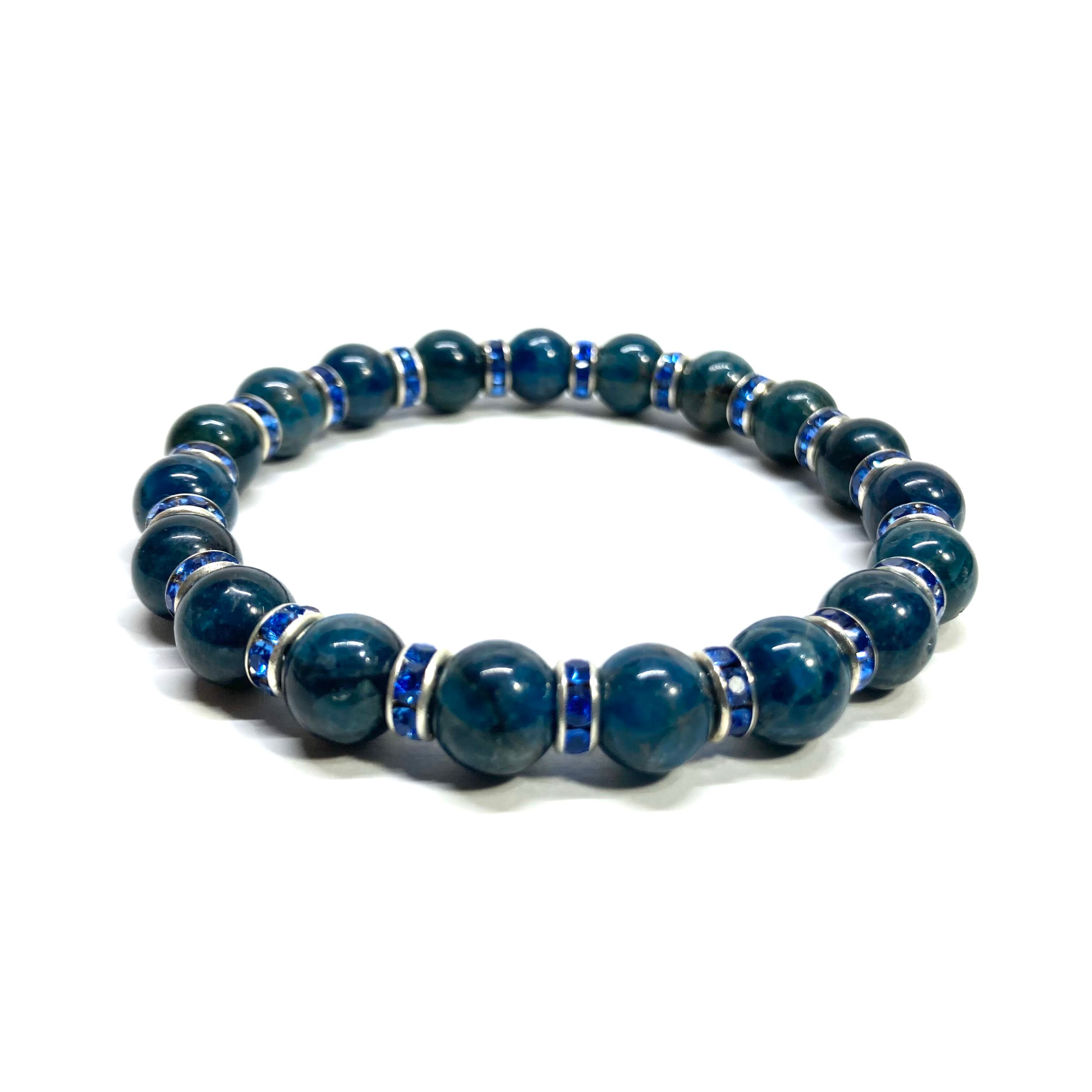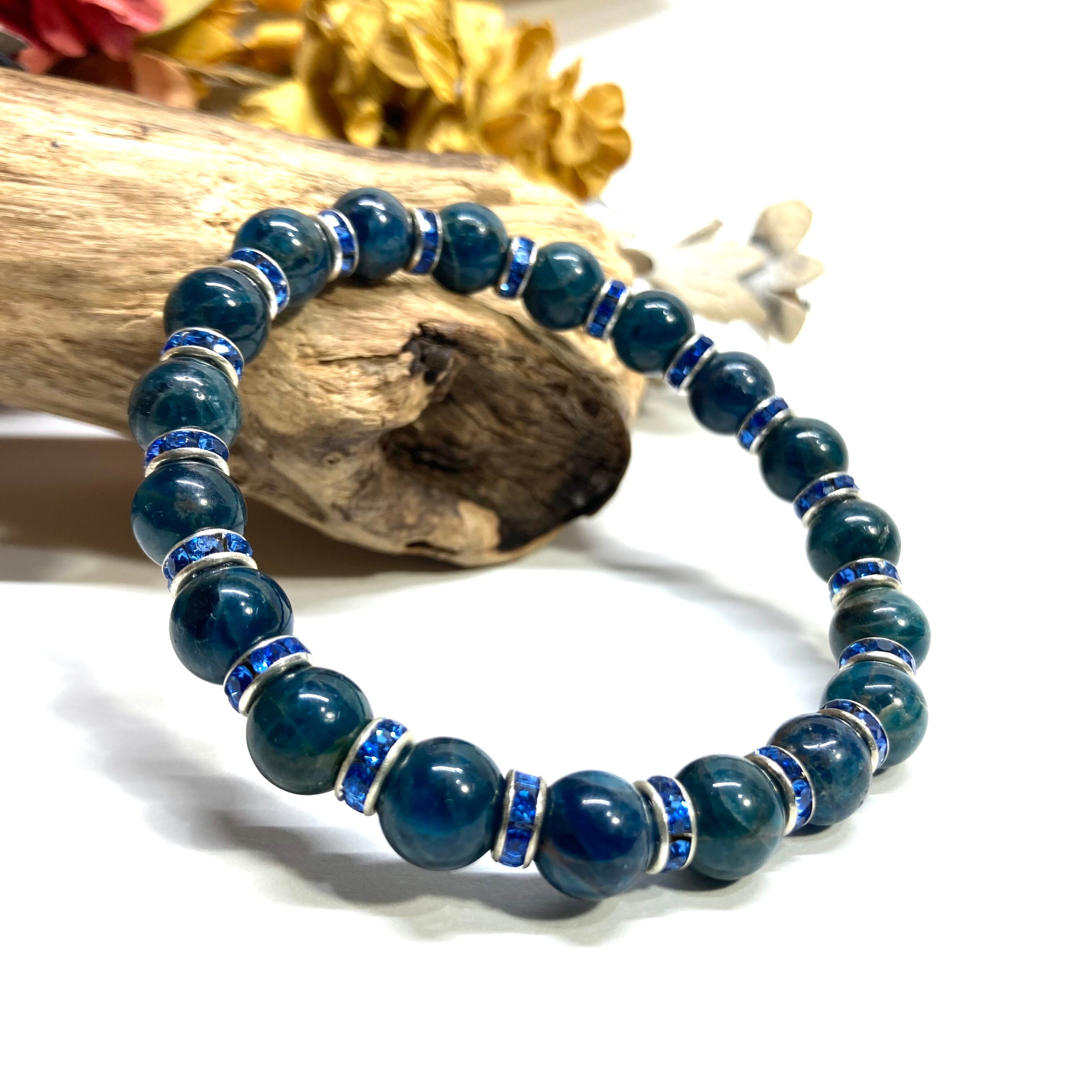 こちらは、アパタイトの8mm玉を使用したパワーストーンブレスレットです。石との間にはロンデルを挟み高級感を演出しております。シンプルなデザインは、シーン問わずどんなコーディネートとも合わせ易いブレスレットです。サイズは内周約15cm (手首周りを測り少し余裕をもってお買い求めくださいませ。)です。当社の中でも一番人気の実績があるデザインとなっております。気になる方はお早めにどうぞ。