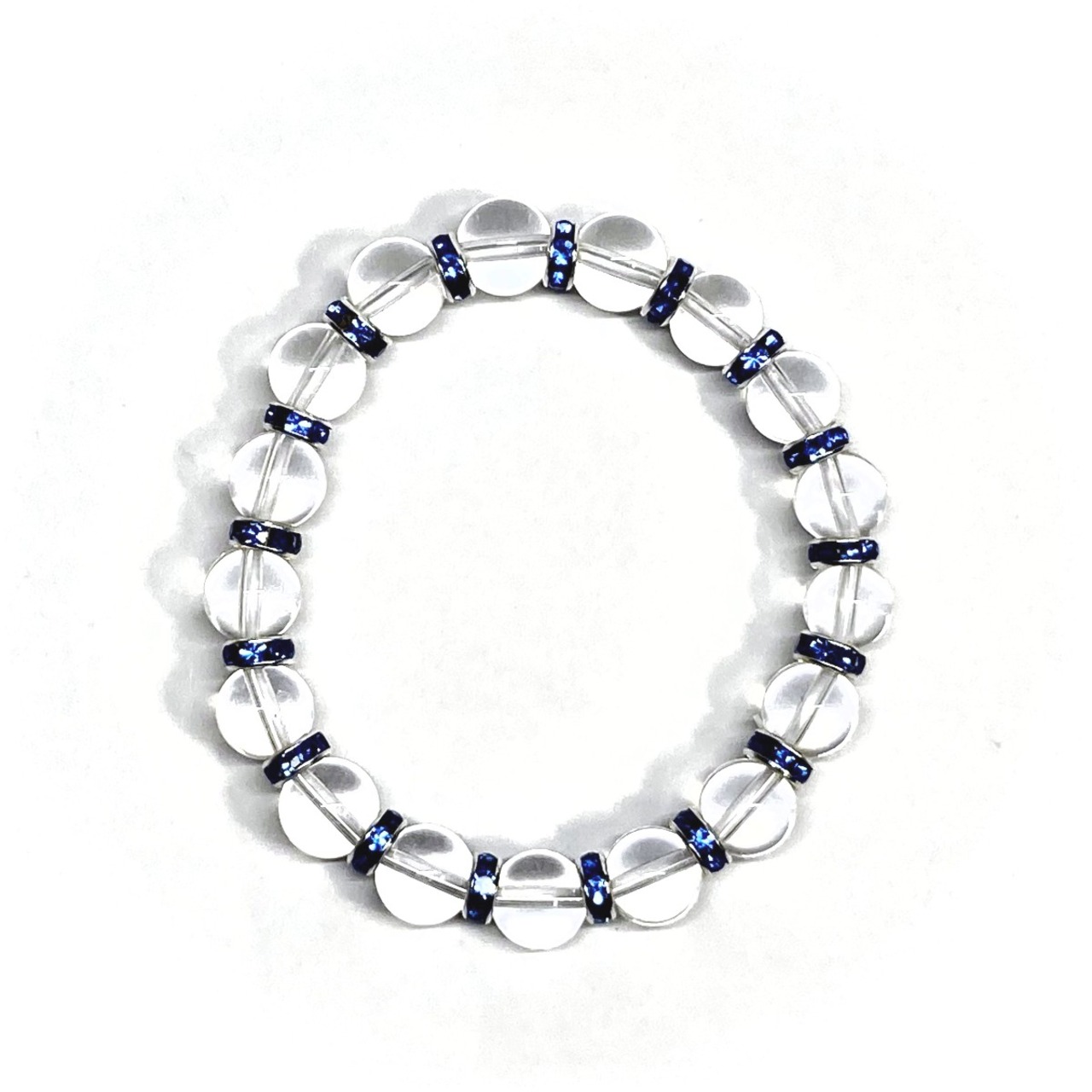 こちらは、水晶の8mm玉を使用したパワーストーンブレスレットです。石との間にはロンデルを挟み高級感を演出しております。シンプルなデザインは、シーン問わずどんなコーディネートとも合わせ易いブレスレットです。サイズは内周約15cm (手首周りを測り少し余裕をもってお買い求めくださいませ。)です。当社の中でも一番人気の実績があるデザインとなっております。気になる方はお早めにどうぞ。
