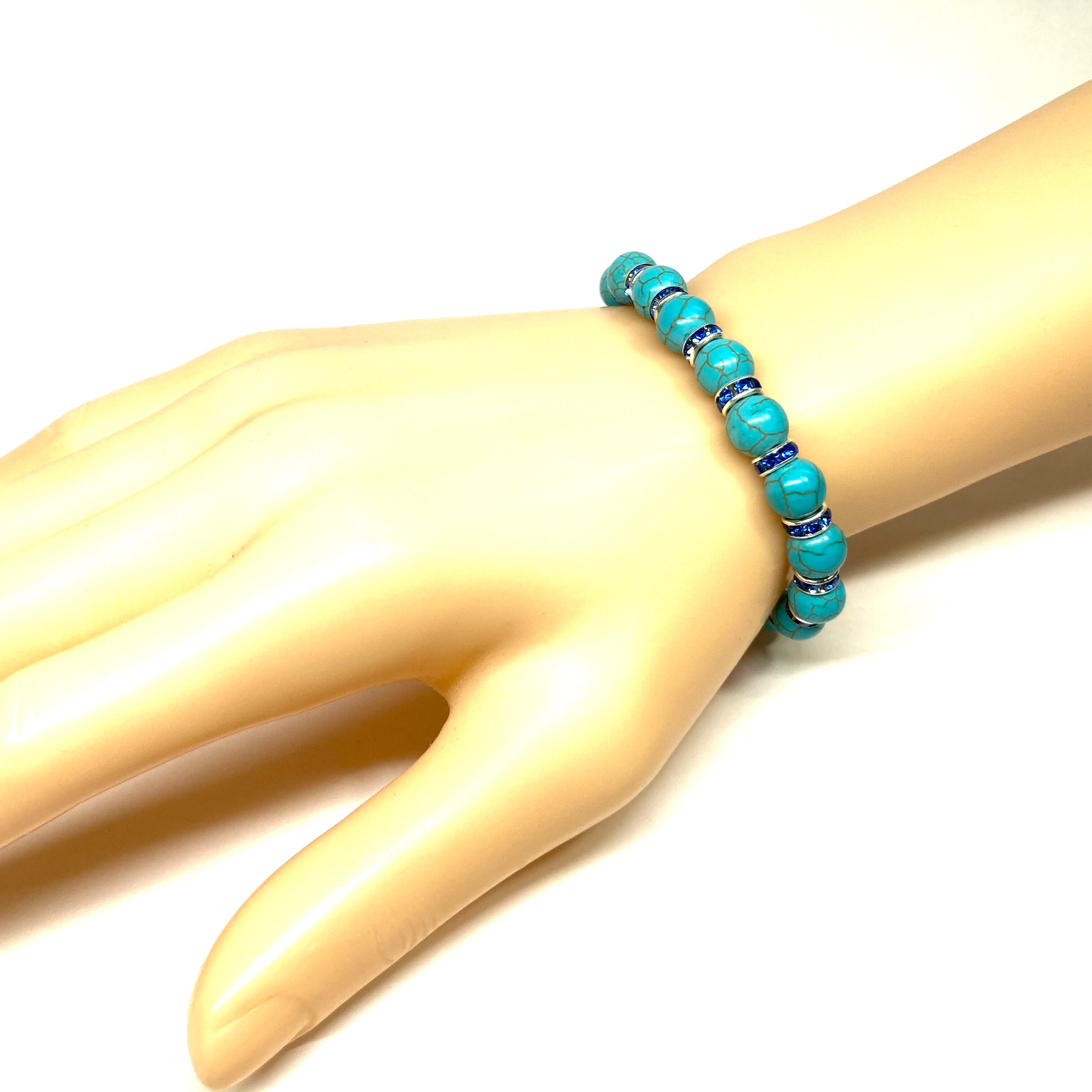 こちらは、ターコイズの8mm玉を使用したパワーストーンブレスレットです。石との間にはロンデルを挟み高級感を演出しております。シンプルなデザインは、シーン問わずどんなコーディネートとも合わせ易いブレスレットです。サイズは内周約15cm (手首周りを測り少し余裕をもってお買い求めくださいませ。)です。当社の中でも一番人気の実績があるデザインとなっております。気になる方はお早めにどうぞ。