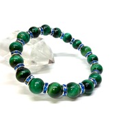 こちらは、グリーンタイガーアイの8mm玉を使用したパワーストーンブレスレットです。石との間にはロンデルを挟み高級感を演出しております。シンプルなデザインは、シーン問わずどんなコーディネートとも合わせ易いブレスレットです。サイズは内周約15cm (手首周りを測り少し余裕をもってお買い求めくださいませ。)です。当社の中でも一番人気の実績があるデザインとなっております。気になる方はお早めにどうぞ。