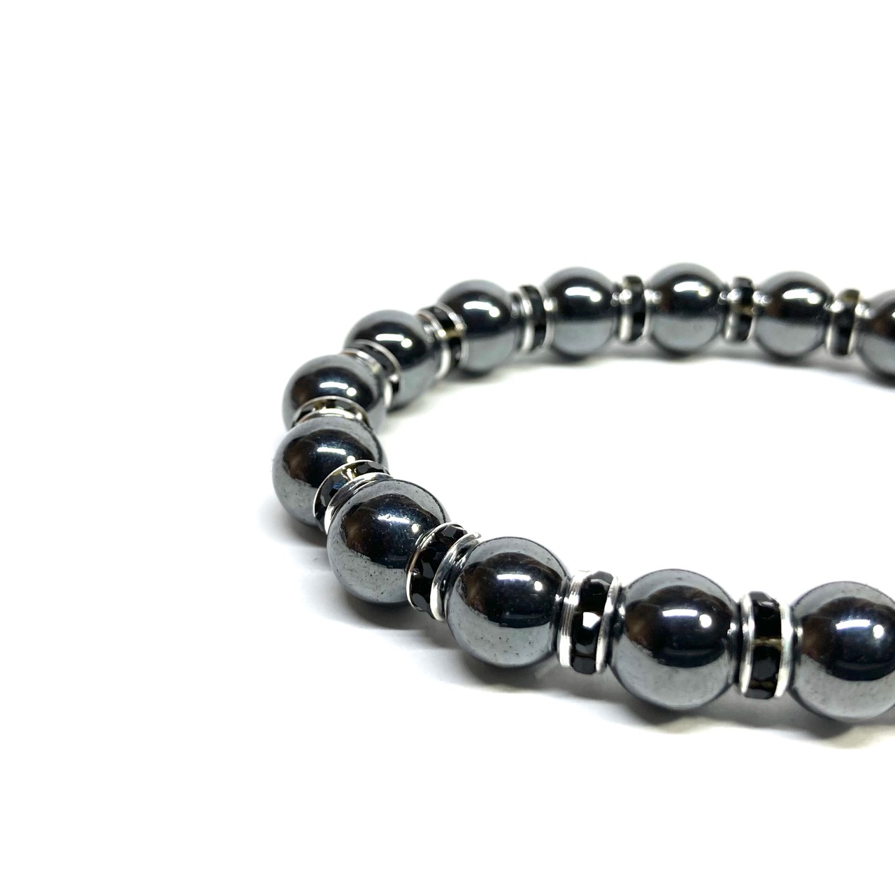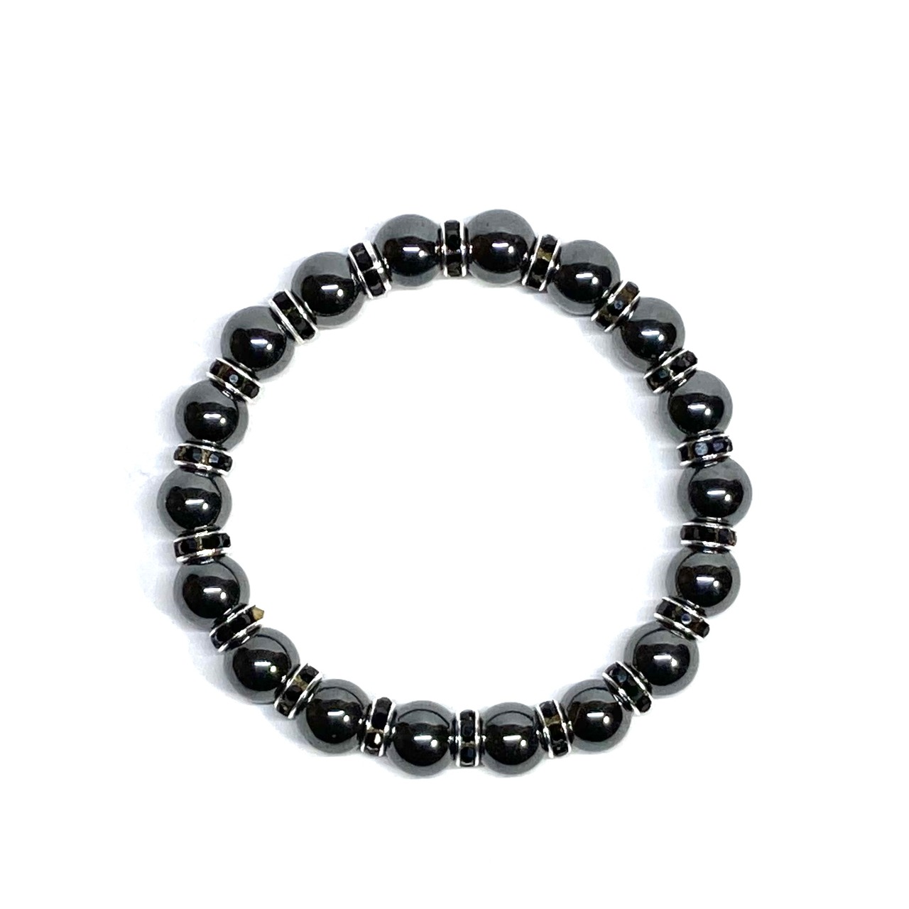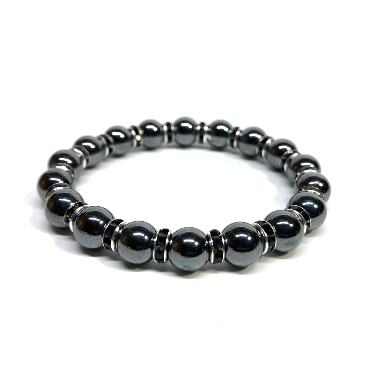 こちらは、ヘマタイトの8mm玉を使用したパワーストーンブレスレットです。石との間にはロンデルを挟み高級感を演出しております。シンプルなデザインは、シーン問わずどんなコーディネートとも合わせ易いブレスレットです。サイズは内周約15cm (手首周りを測り少し余裕をもってお買い求めくださいませ。)です。当社の中でも一番人気の実績があるデザインとなっております。気になる方はお早めにどうぞ。