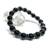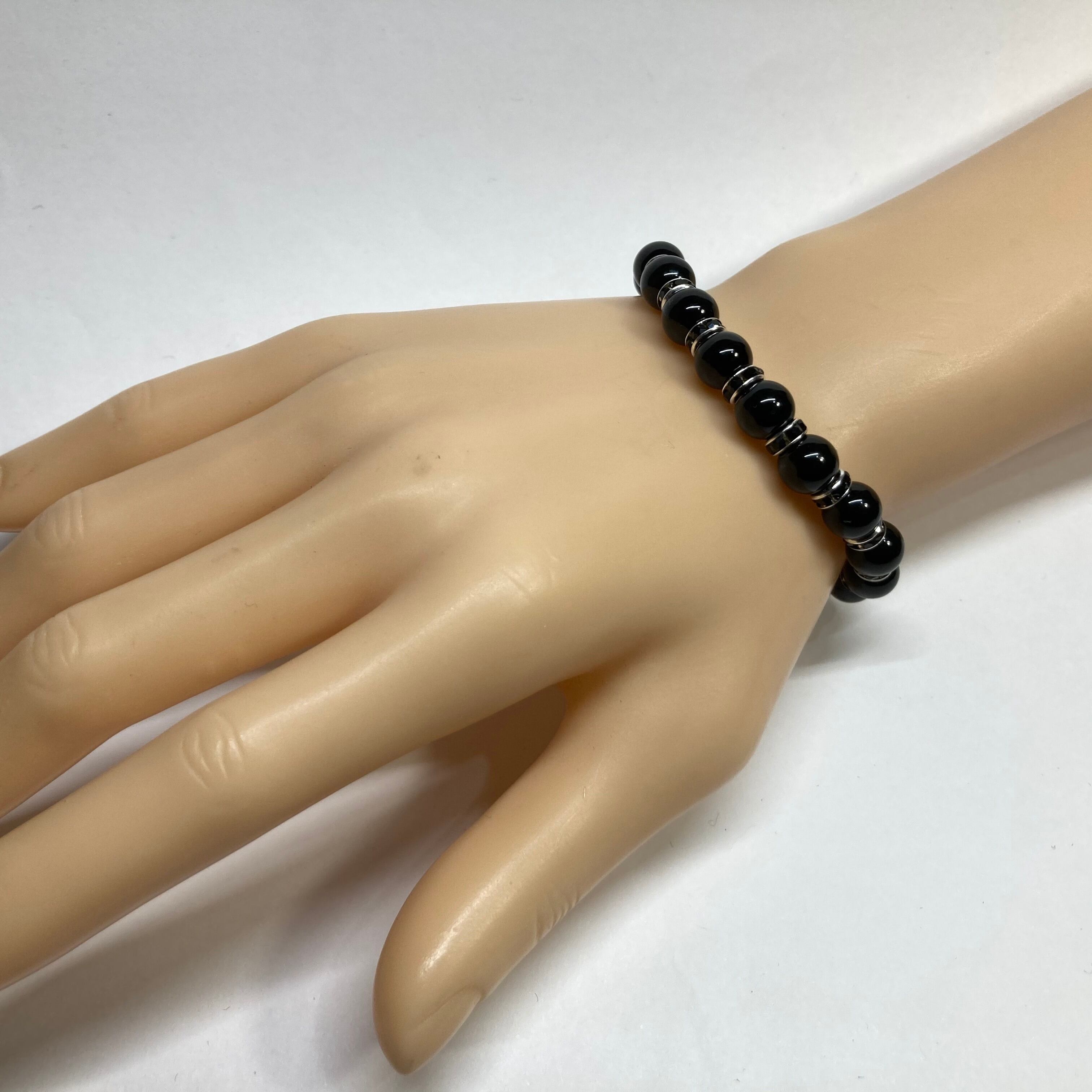 こちらは、オニキスの8mm玉を使用したパワーストーンブレスレットです。石との間にはロンデルを挟み高級感を演出しております。シンプルなデザインは、シーン問わずどんなコーディネートとも合わせ易いブレスレットです。サイズは内周約15cm (手首周りを測り少し余裕をもってお買い求めくださいませ。)です。当社の中でも一番人気の実績があるデザインとなっております。気になる方はお早めにどうぞ。