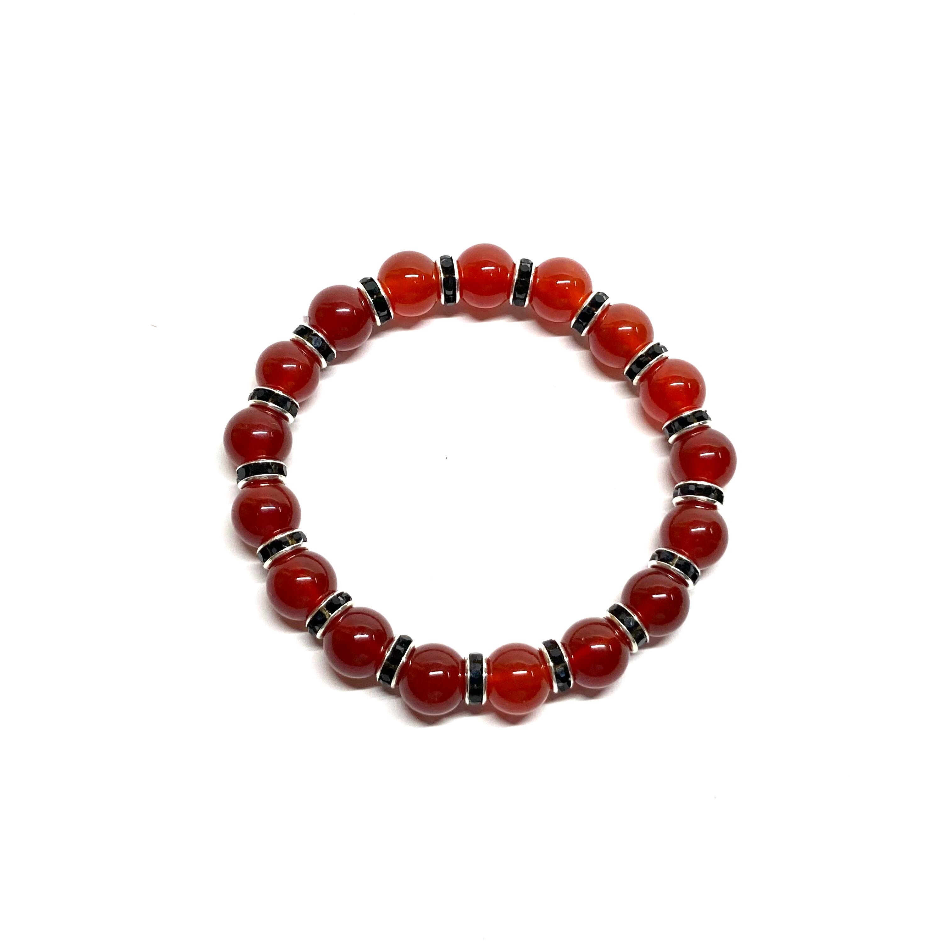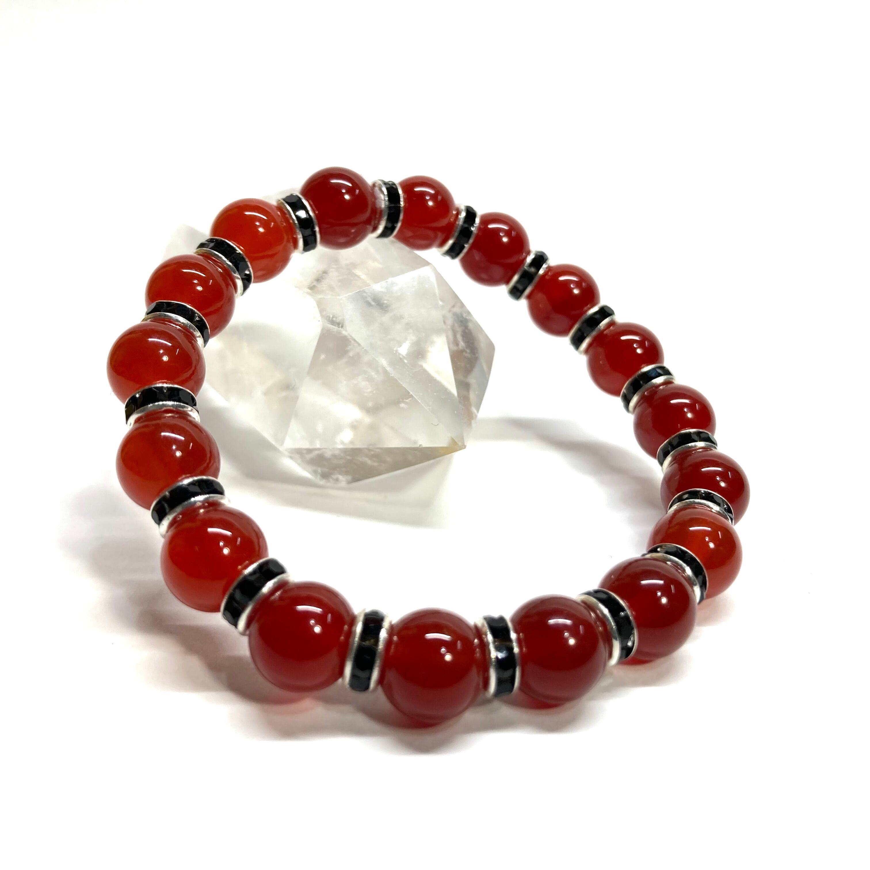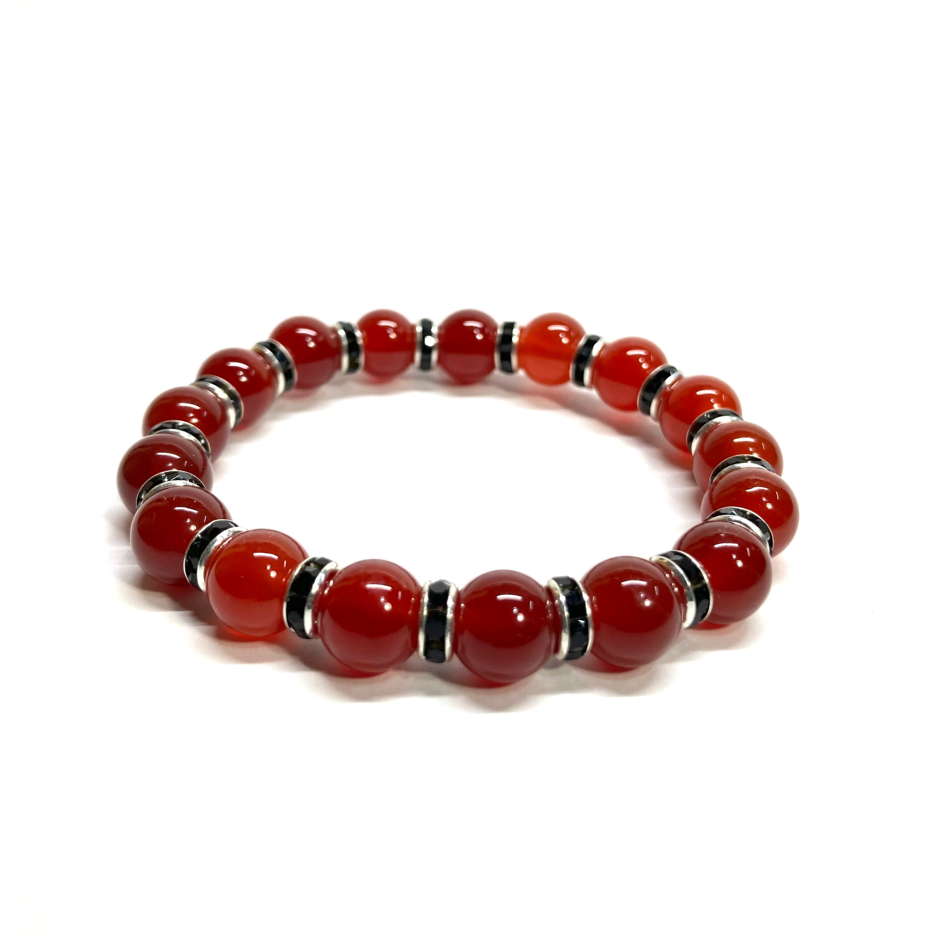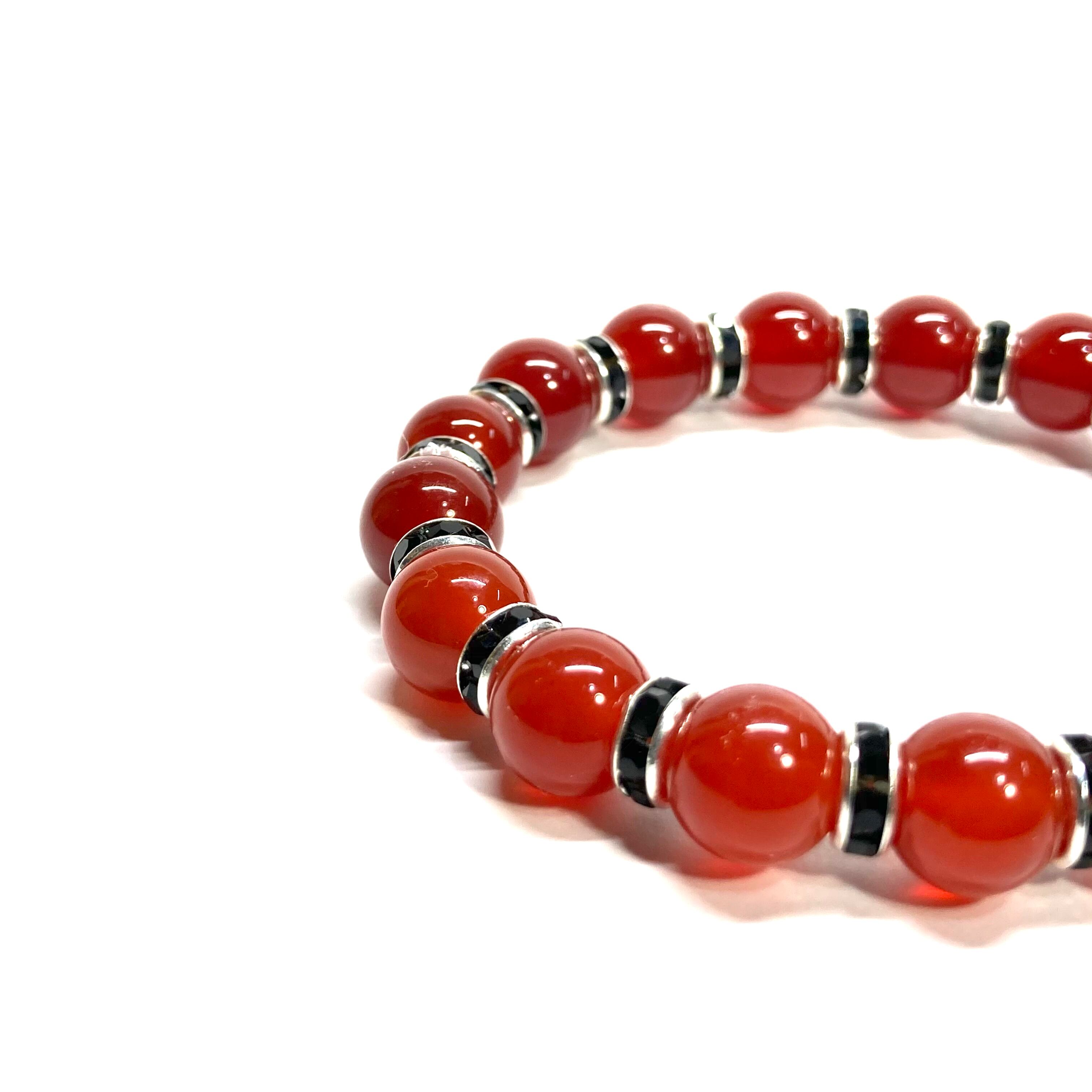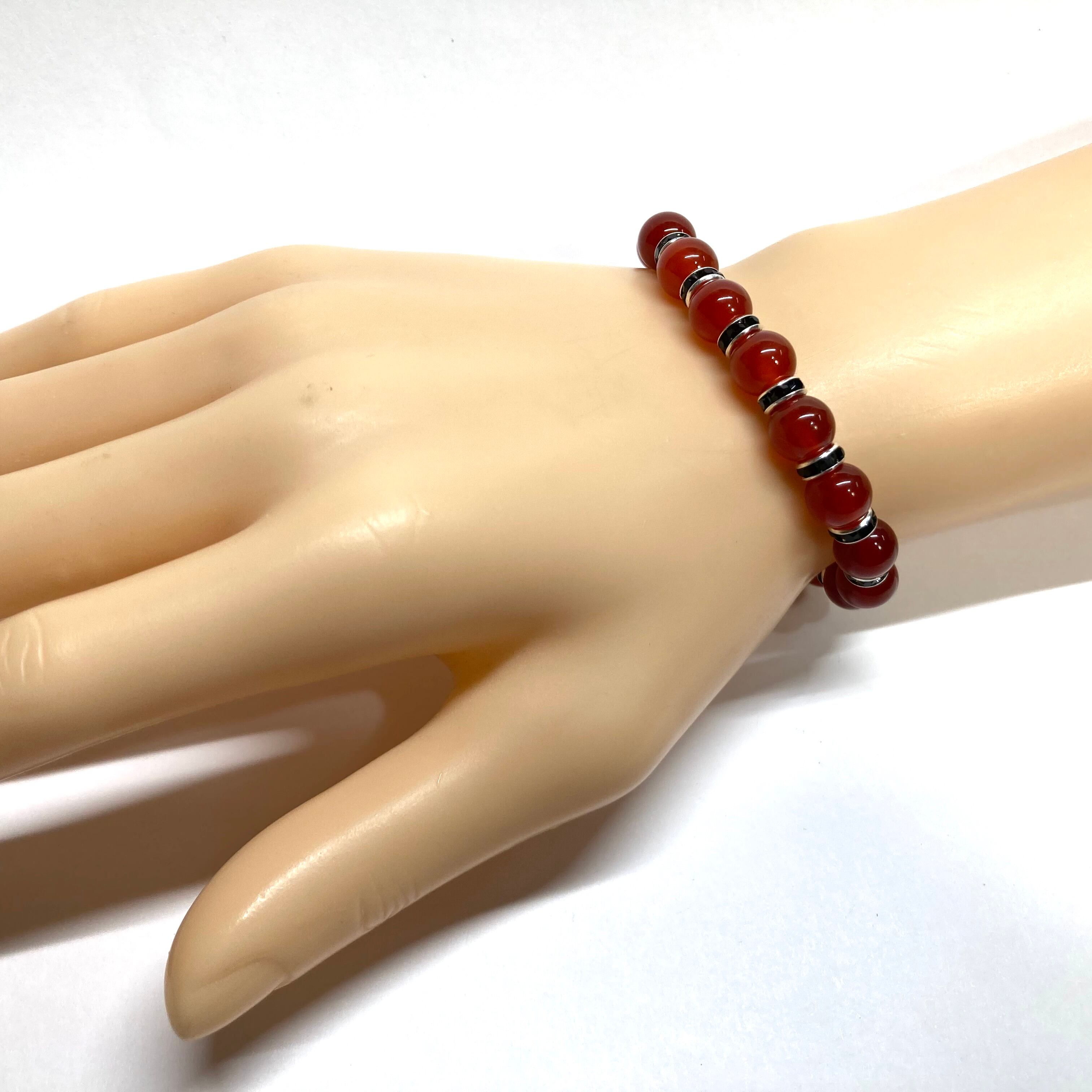 こちらは、赤瑪瑙の8mm玉を使用したパワーストーンブレスレットです。石との間にはロンデルを挟み高級感を演出しております。シンプルなデザインは、シーン問わずどんなコーディネートとも合わせ易いブレスレットです。サイズは内周約15cm (手首周りを測り少し余裕をもってお買い求めくださいませ。)です。当社の中でも一番人気の実績があるデザインとなっております。気になる方はお早めにどうぞ。