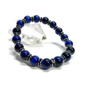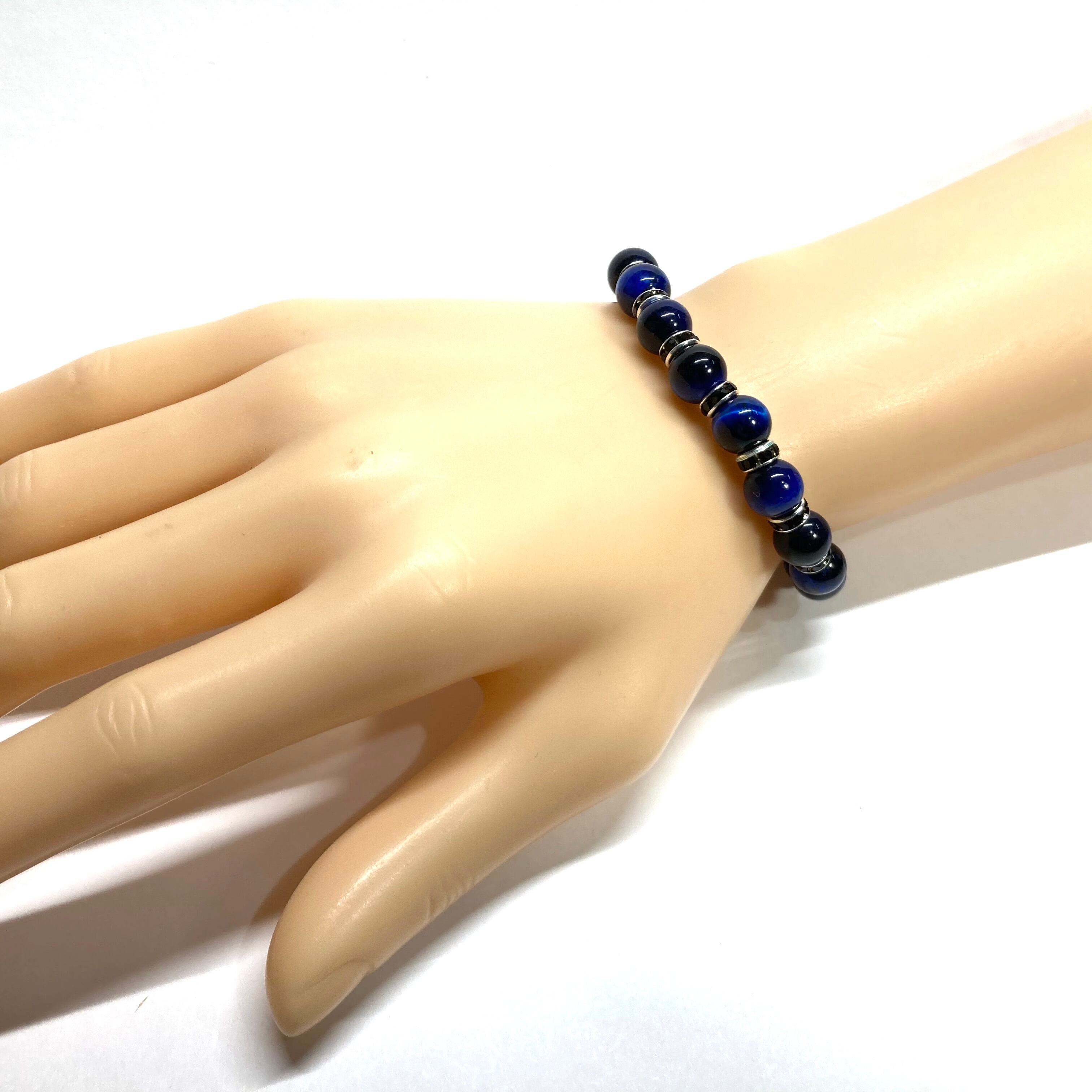 こちらは、ブルータイガーアイ の8mm玉を使用したパワーストーンブレスレットです。石との間にはロンデルを挟み高級感を演出しております。シンプルなデザインは、シーン問わずどんなコーディネートとも合わせ易いブレスレットです。サイズは内周約15cm (手首周りを測り少し余裕をもってお買い求めくださいませ。)です。当社の中でも一番人気の実績があるデザインとなっております。気になる方はお早めにどうぞ。