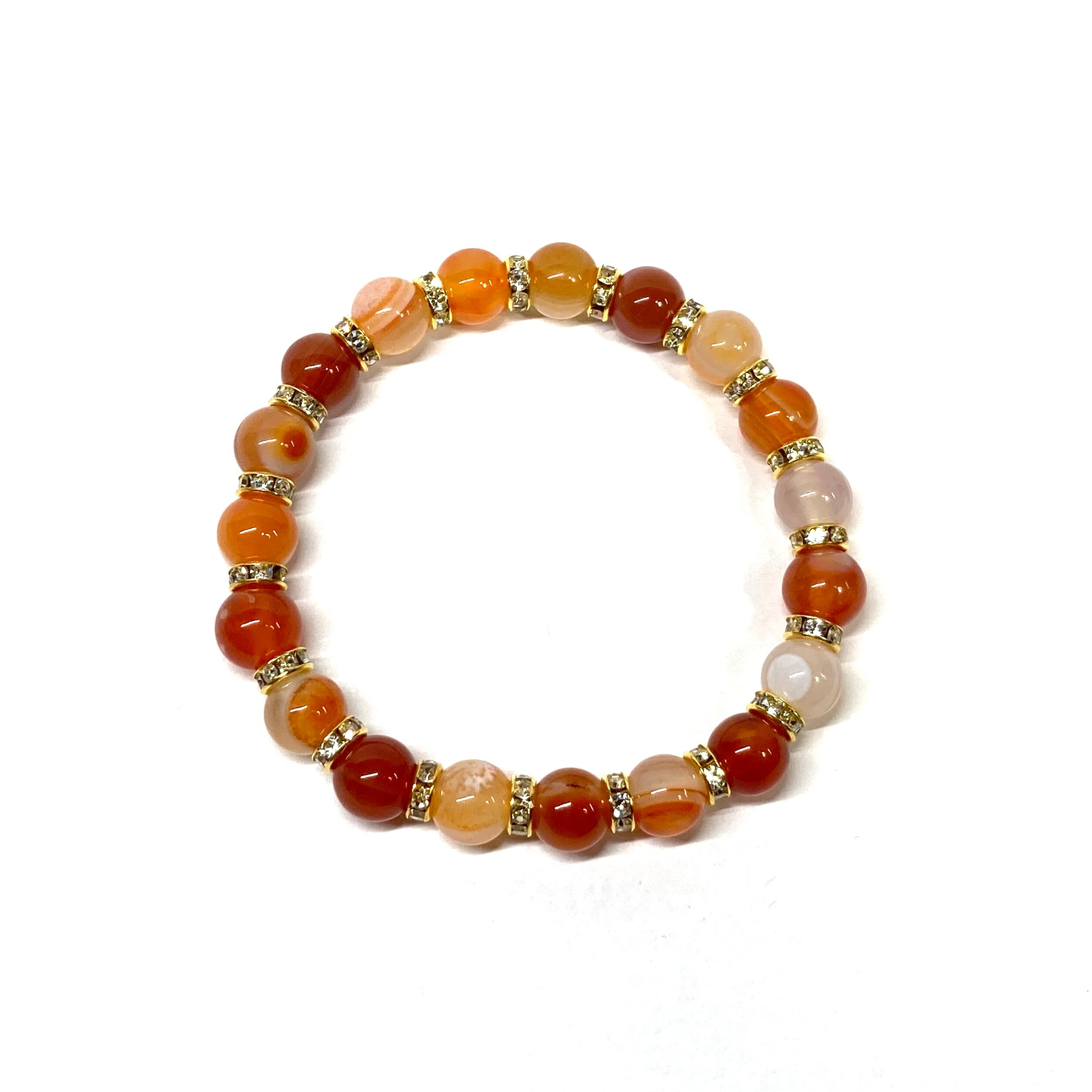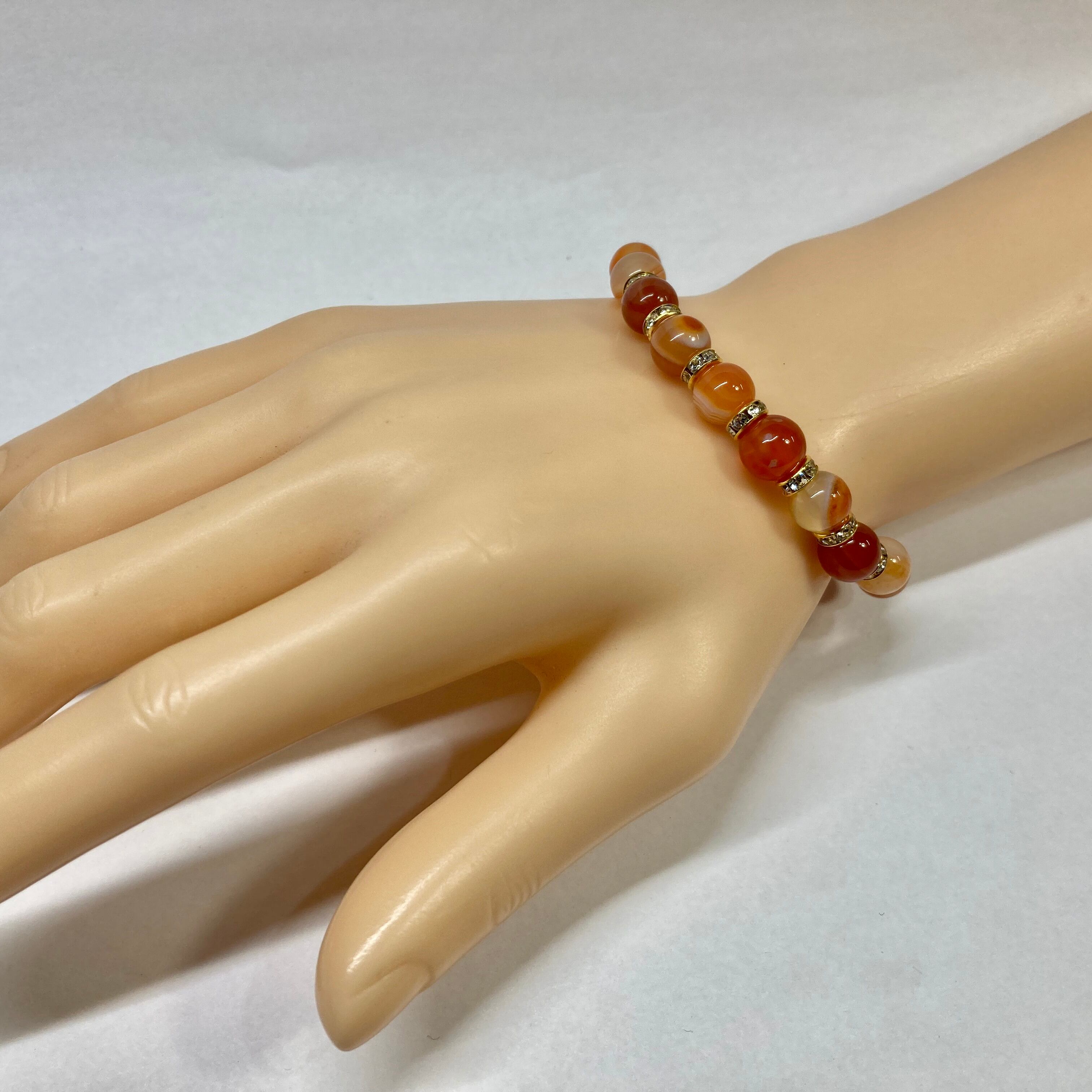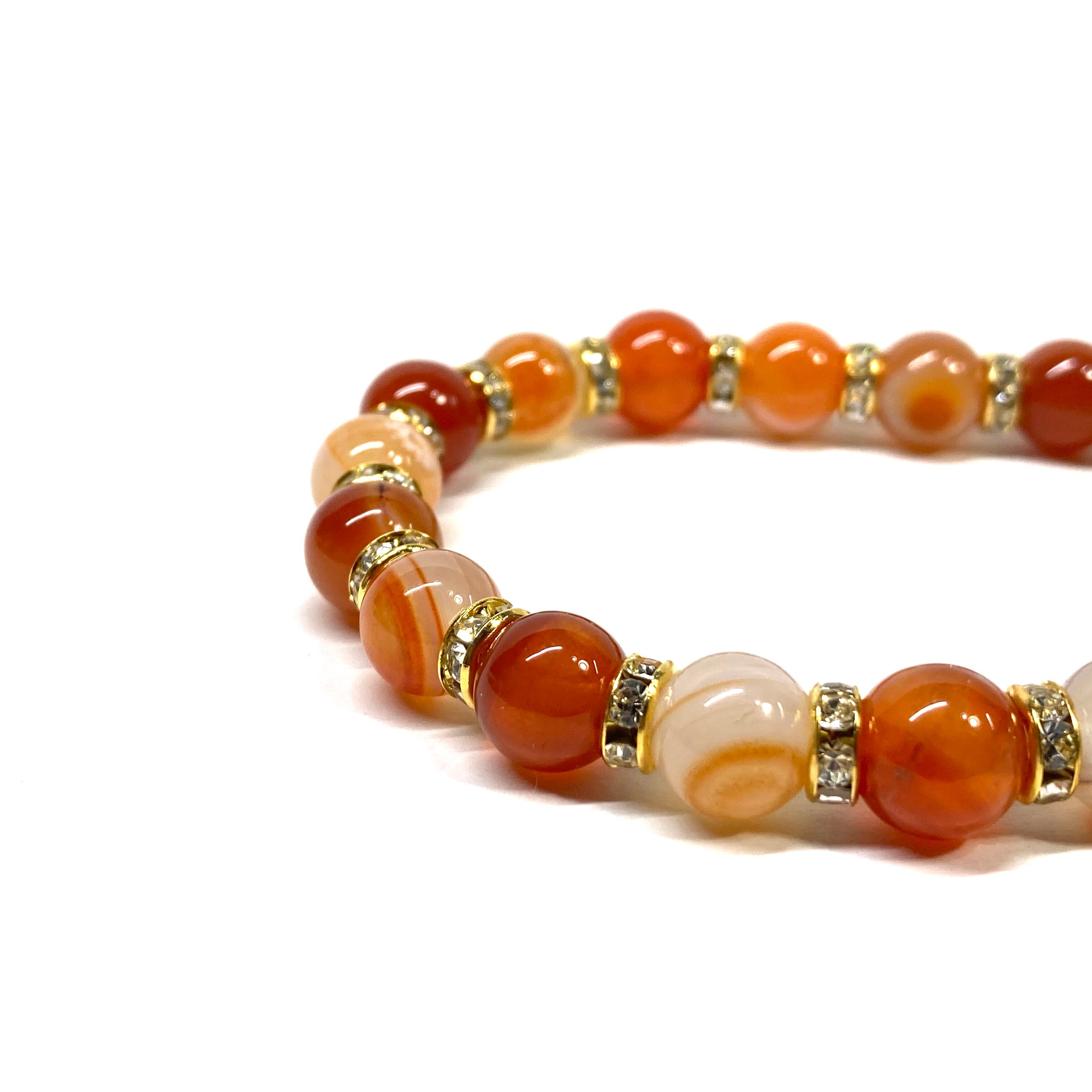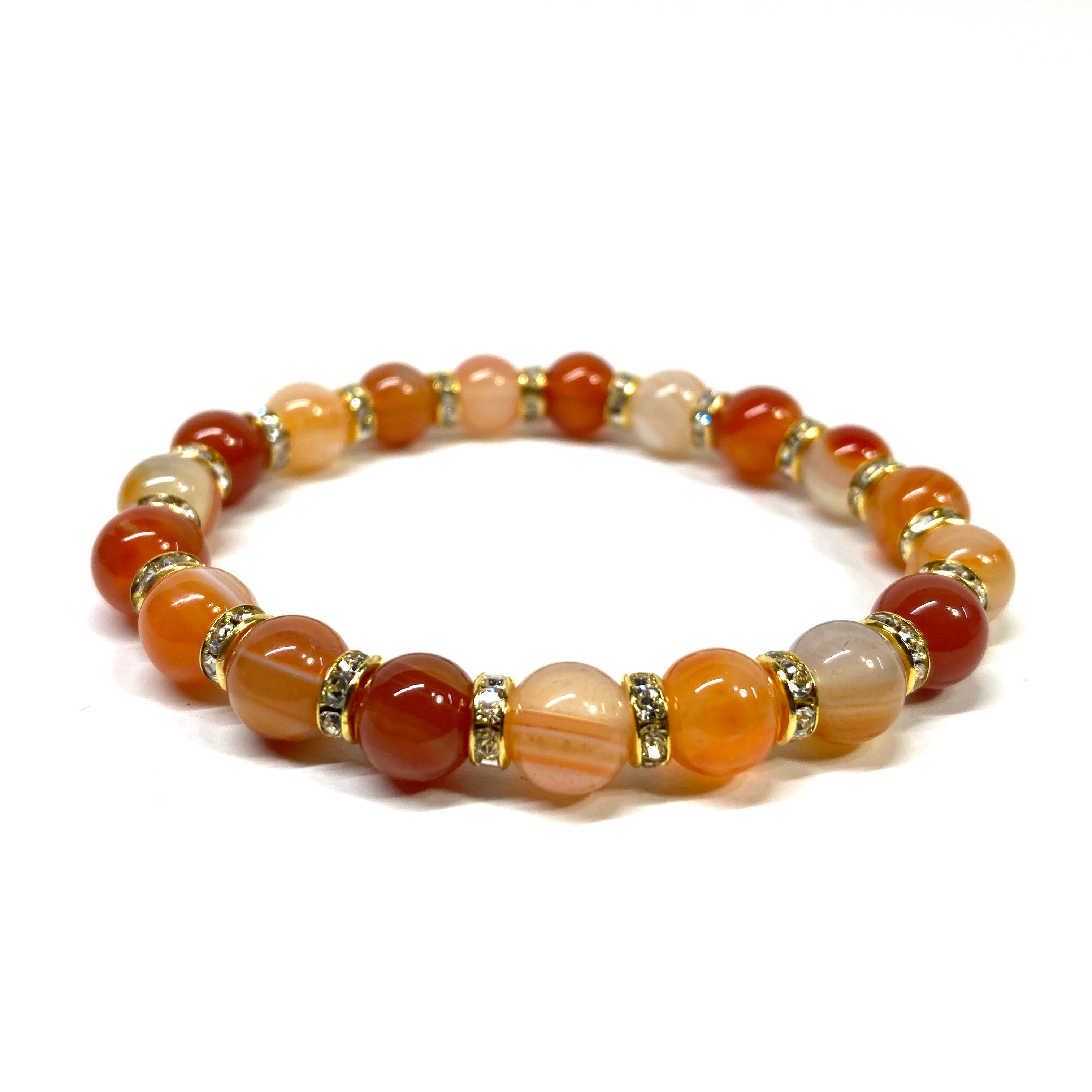 こちらは、カーネリアン・サードニクスの8mm玉を使用したパワーストーンブレスレットです。石との間にはロンデルを挟み高級感を演出しております。シンプルなデザインは、シーン問わずどんなコーディネートとも合わせ易いブレスレットです。サイズは内周約15cm (手首周りを測り少し余裕をもってお買い求めくださいませ。)です。当社の中でも一番人気の実績があるデザインとなっております。気になる方はお早めにどうぞ。
