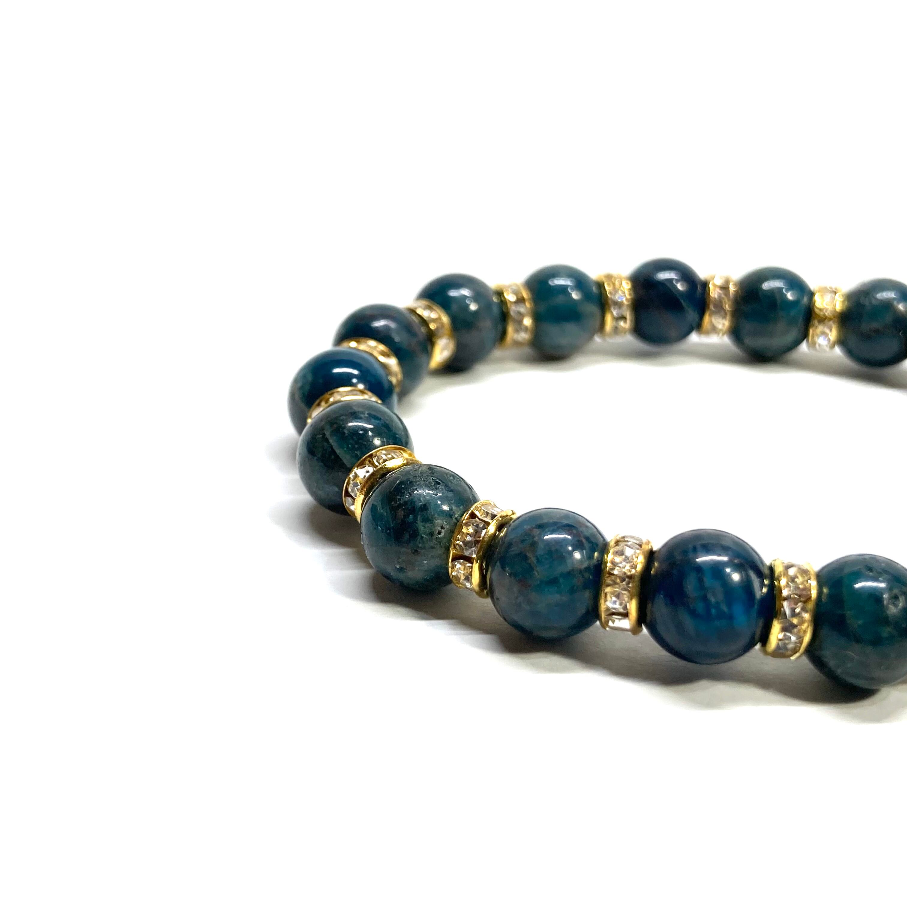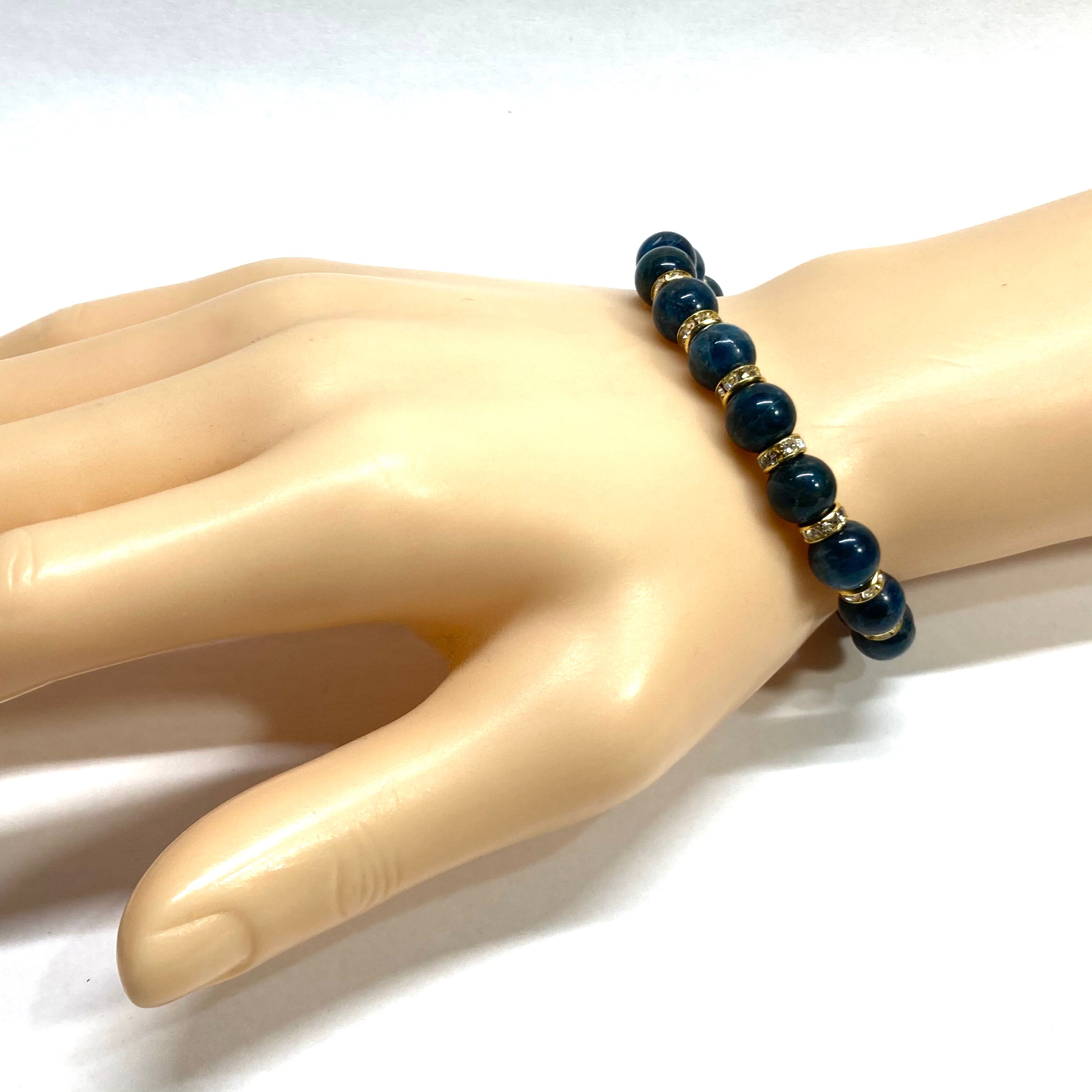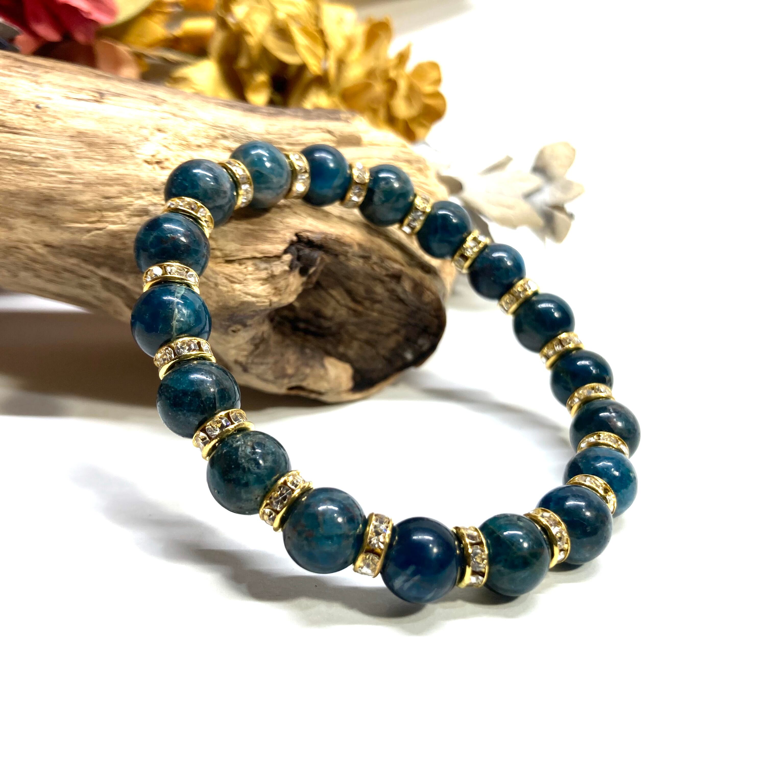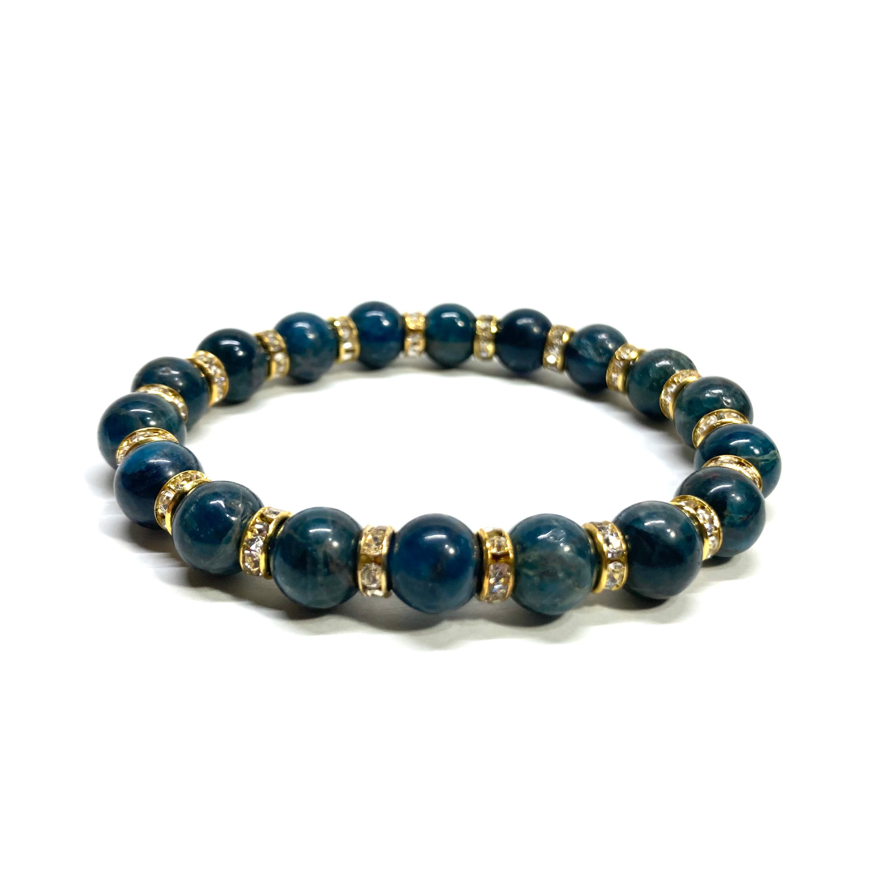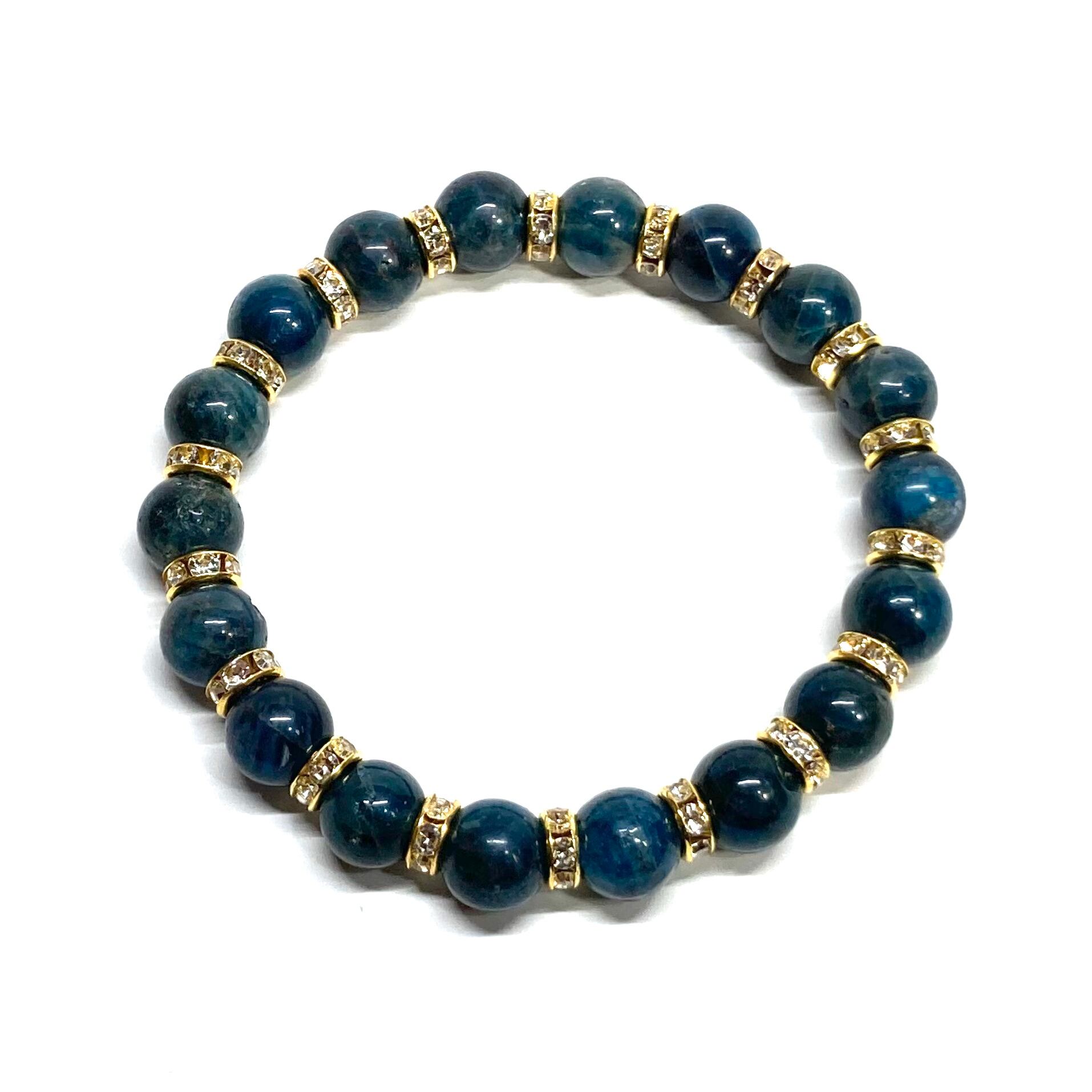 こちらは、アパタイトの8mm玉を使用したパワーストーンブレスレットです。石との間にはロンデルを挟み高級感を演出しております。シンプルなデザインは、シーン問わずどんなコーディネートとも合わせ易いブレスレットです。サイズは内周約15cm (手首周りを測り少し余裕をもってお買い求めくださいませ。)です。当社の中でも一番人気の実績があるデザインとなっております。気になる方はお早めにどうぞ。