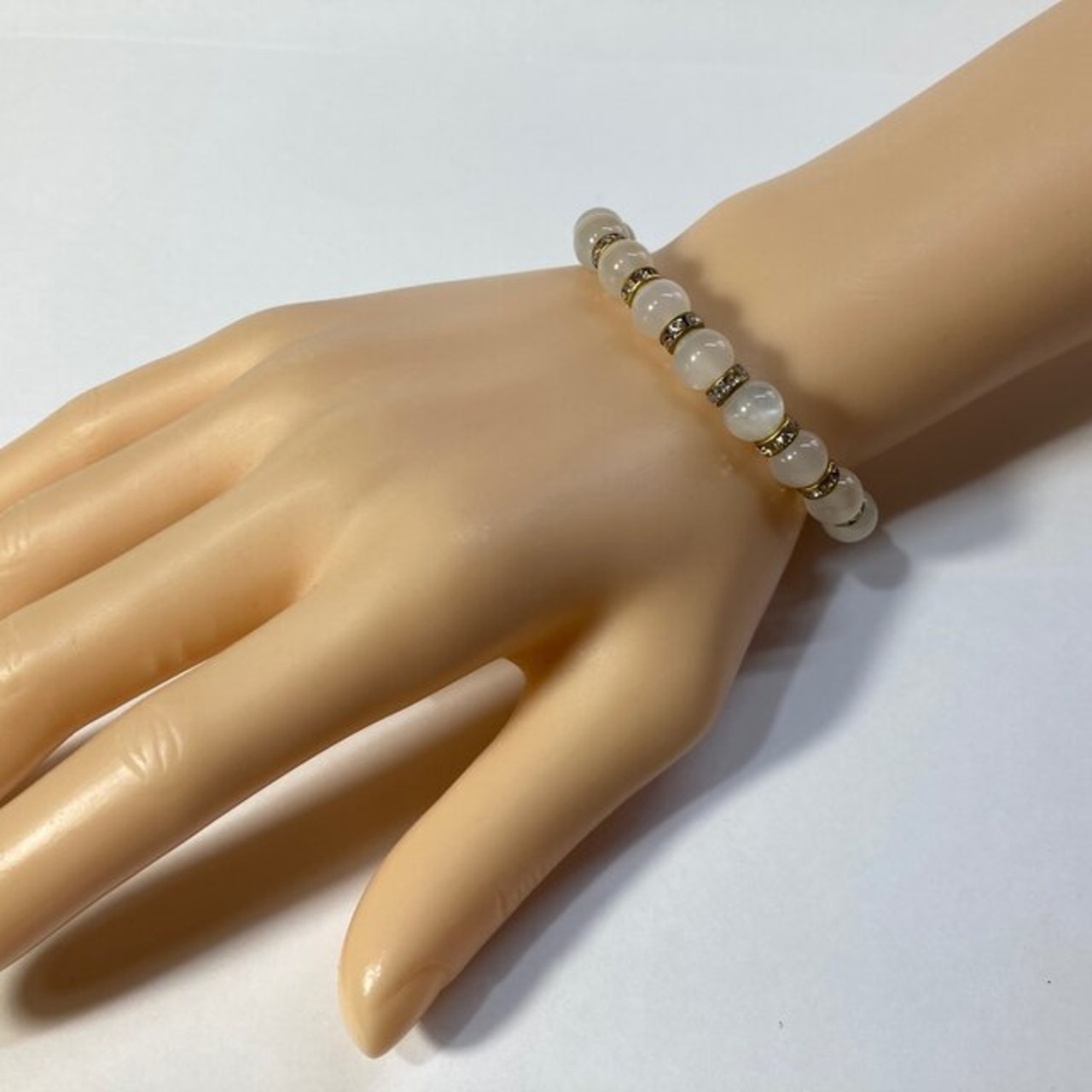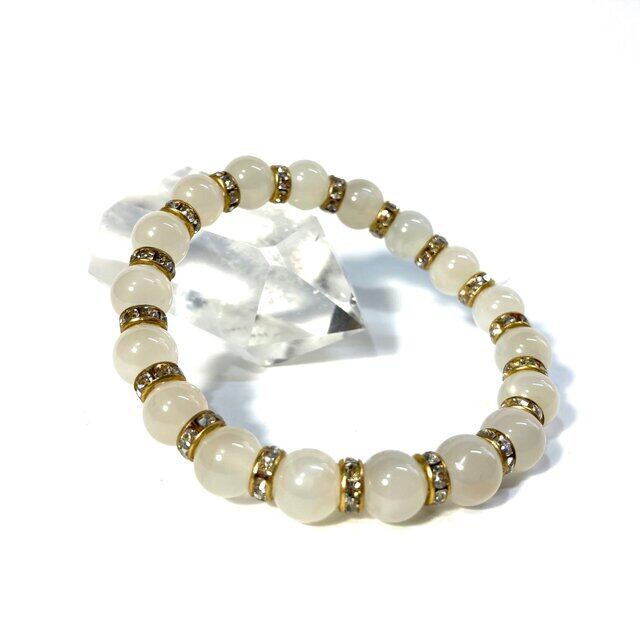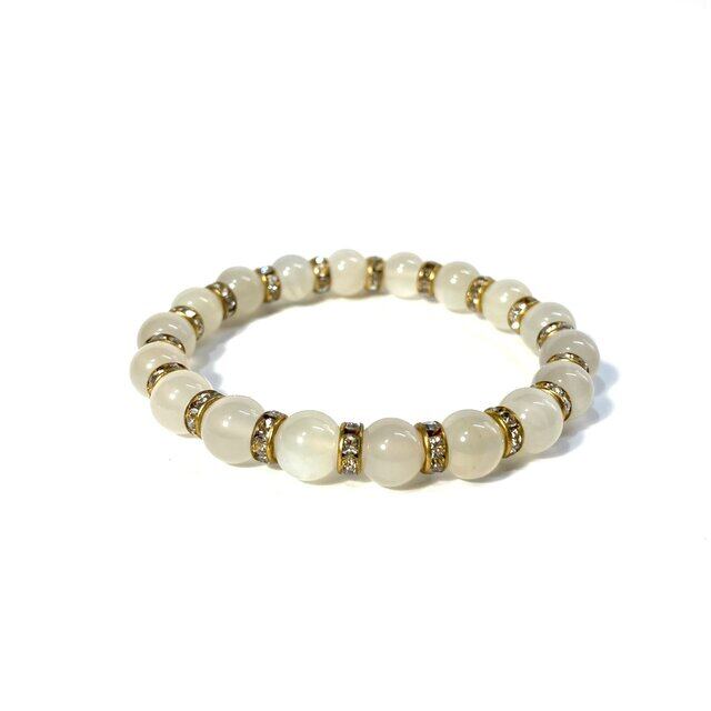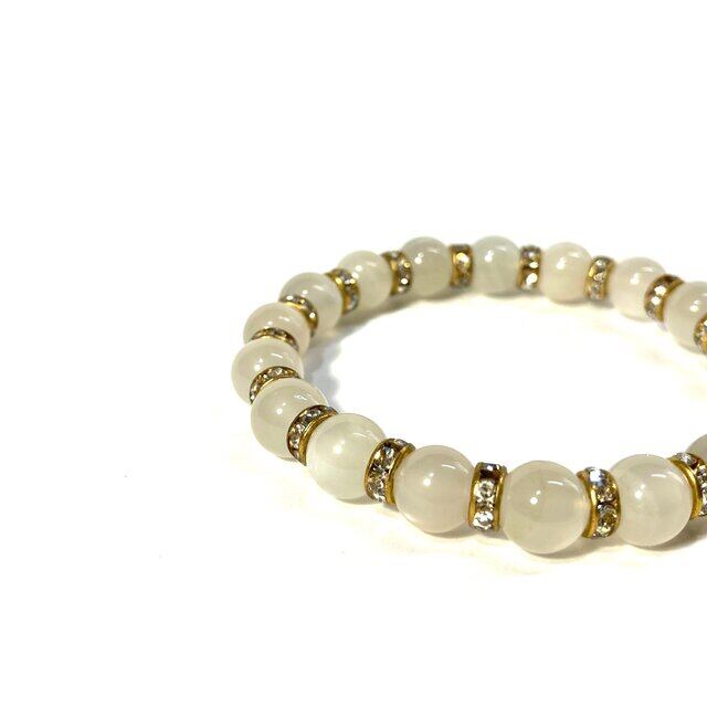 こちらは、ムーンストーンの8mm玉を使用したパワーストーンブレスレットです。石との間にはロンデルを挟み高級感を演出しております。シンプルなデザインは、シーン問わずどんなコーディネートとも合わせ易いブレスレットです。サイズは内周約15cm (手首周りを測り少し余裕をもってお買い求めくださいませ。)です。当社の中でも一番人気の実績があるデザインとなっております。気になる方はお早めにどうぞ。