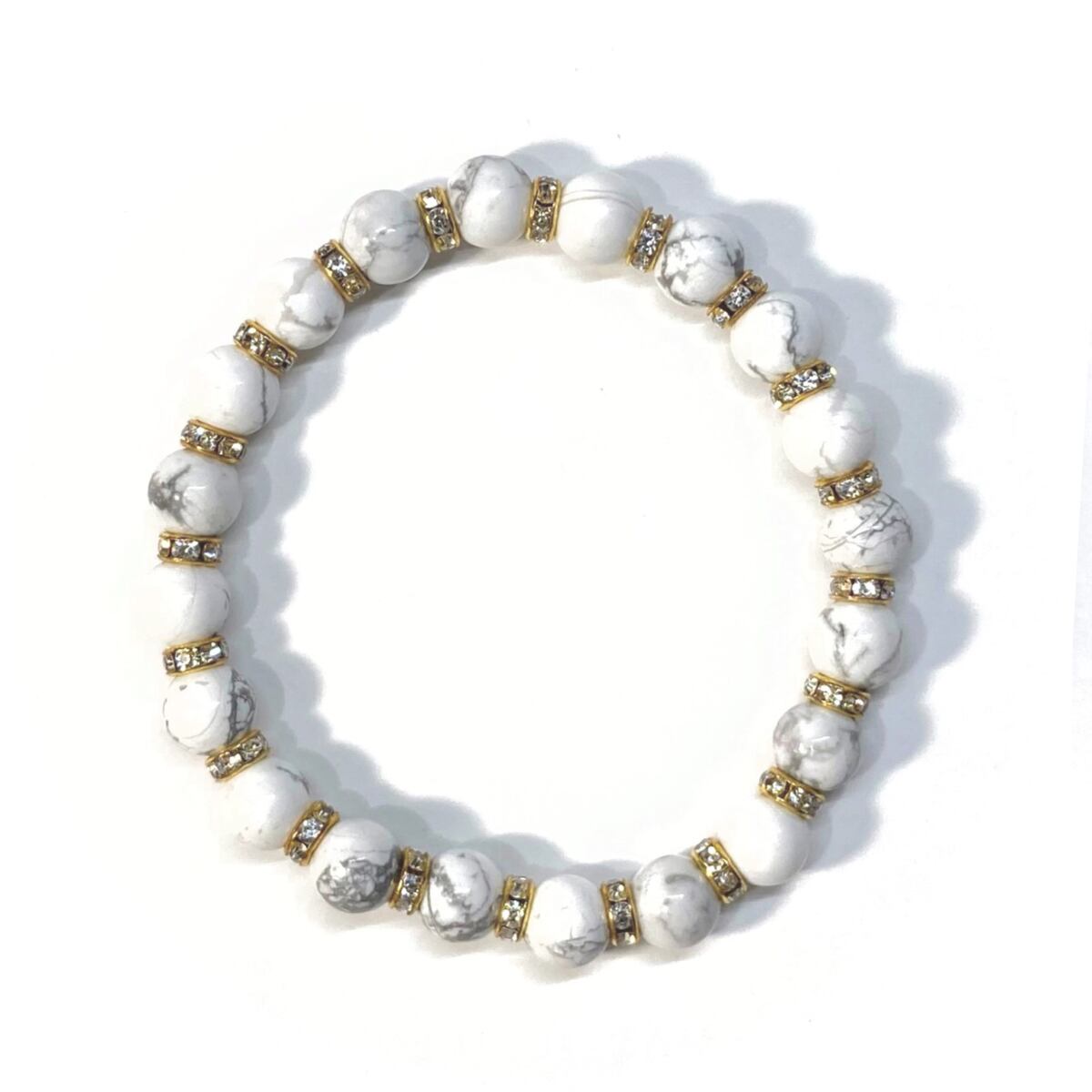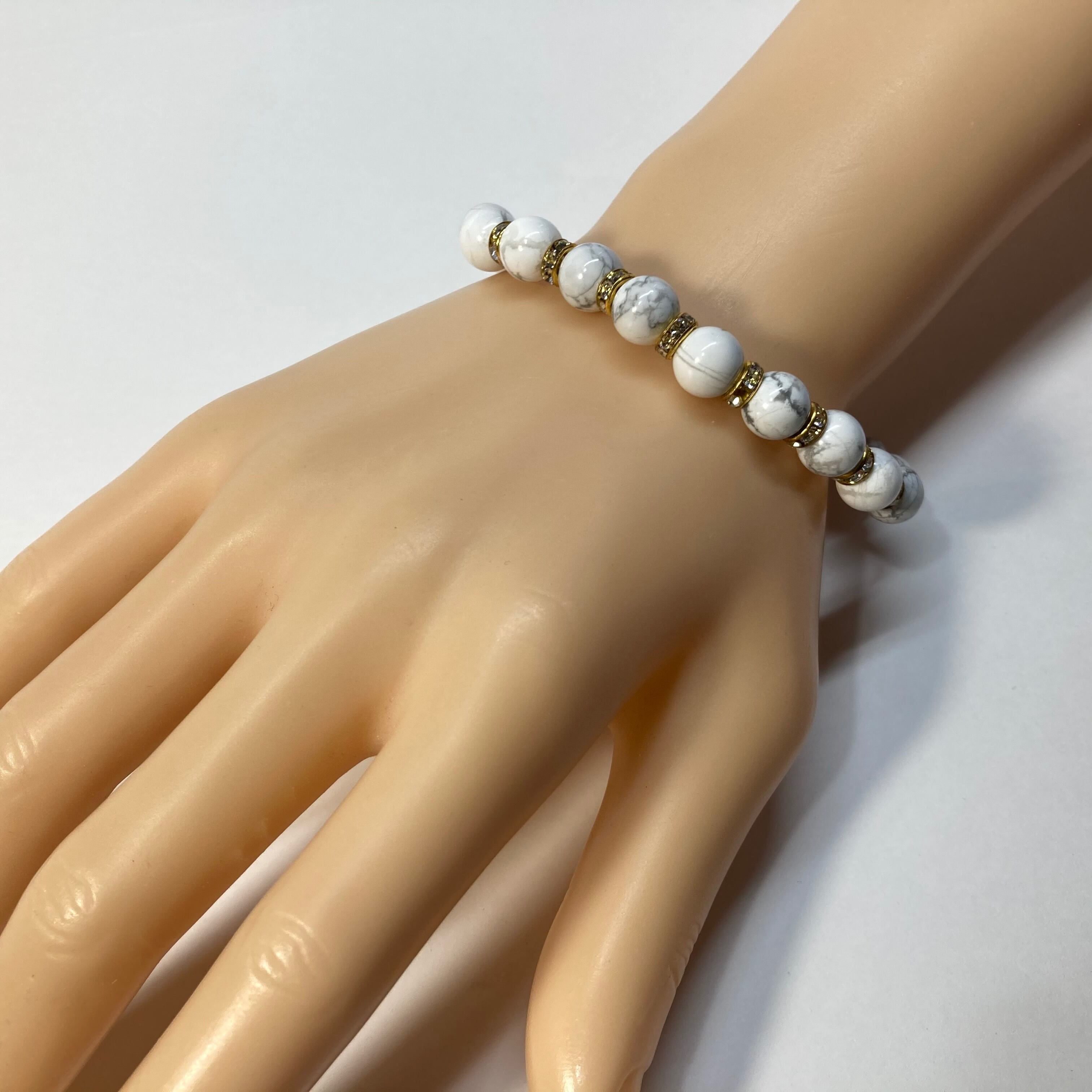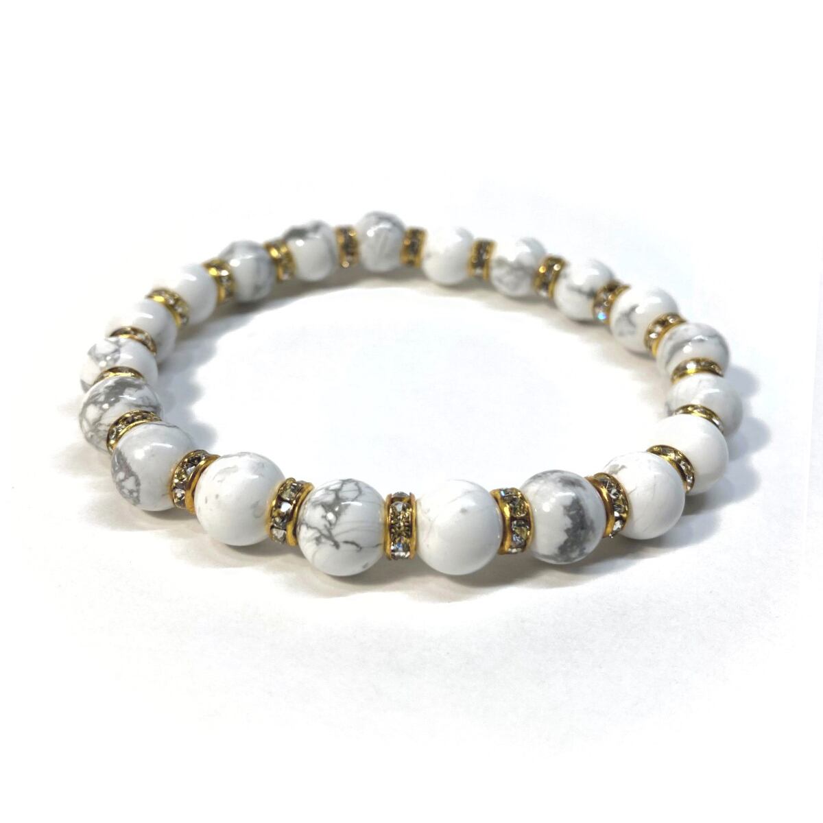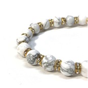 こちらは、ハウライトの8mm玉を使用したパワーストーンブレスレットです。石との間にはロンデルを挟み高級感を演出しております。シンプルなデザインは、シーン問わずどんなコーディネートとも合わせ易いブレスレットです。サイズは内周約15cm (手首周りを測り少し余裕をもってお買い求めくださいませ。)です。当社の中でも一番人気の実績があるデザインとなっております。気になる方はお早めにどうぞ。