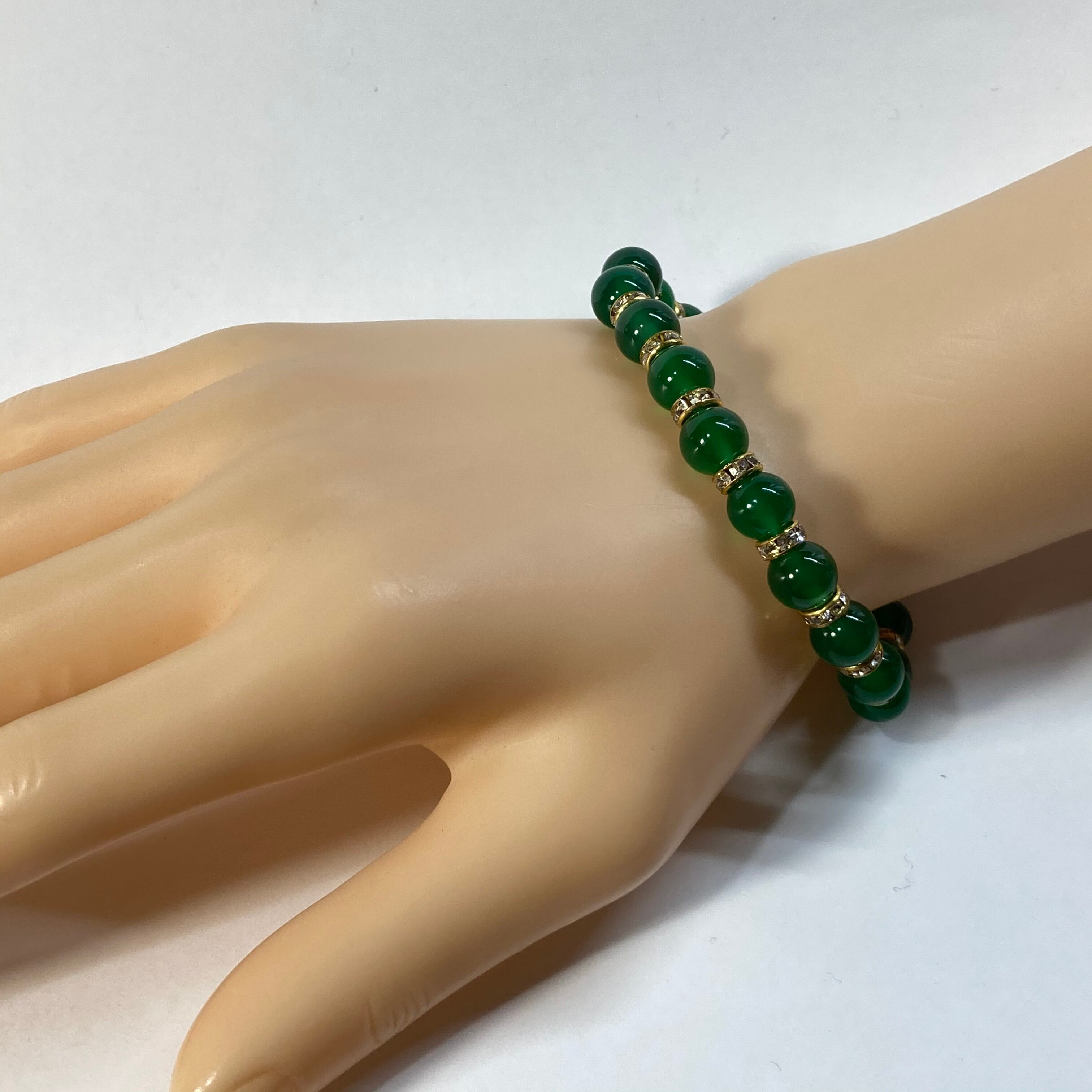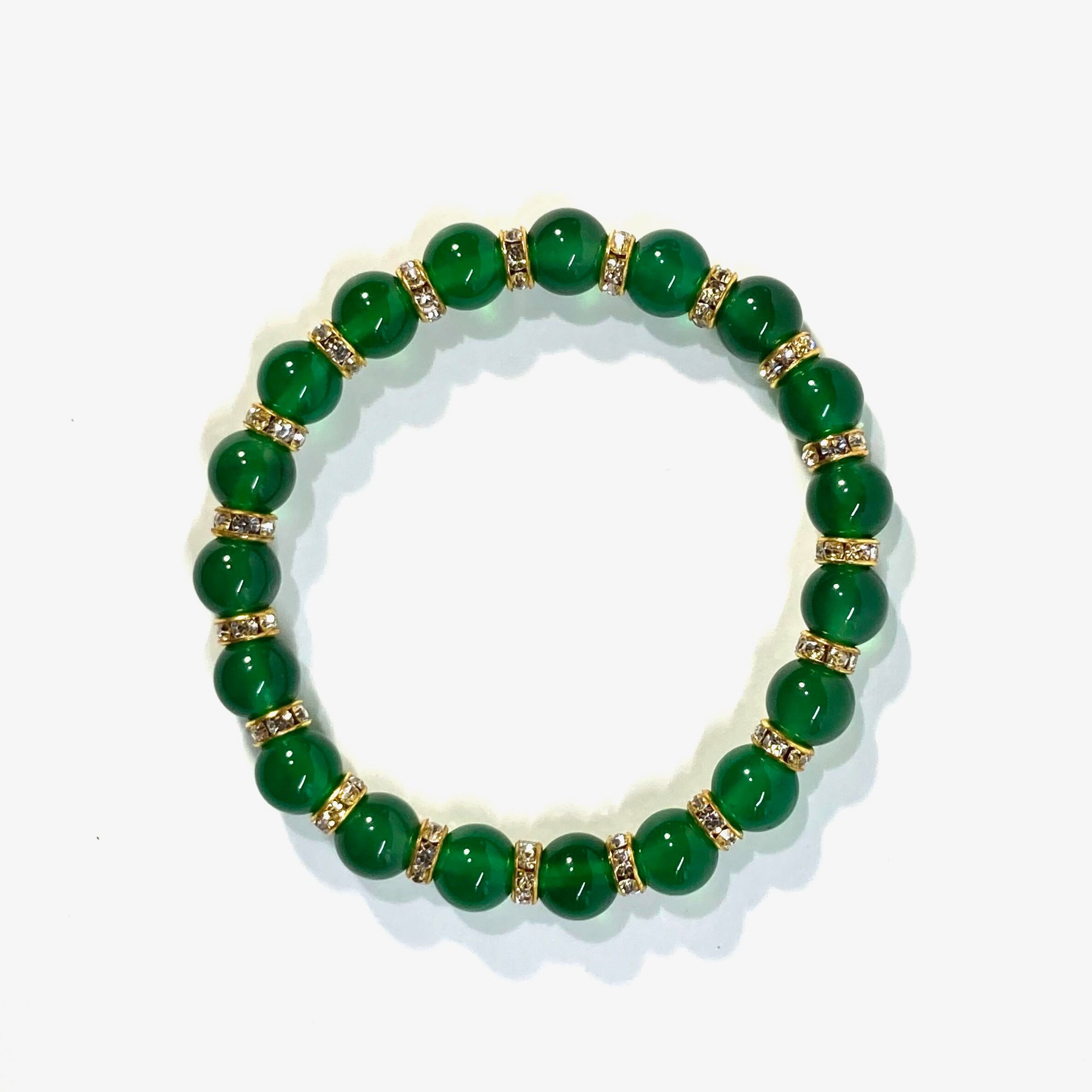 こちらは、緑瑪瑙の8mm玉を使用したパワーストーンブレスレットです。石との間にはロンデルを挟み高級感を演出しております。シンプルなデザインは、シーン問わずどんなコーディネートとも合わせ易いブレスレットです。サイズは内周約15cm (手首周りを測り少し余裕をもってお買い求めくださいませ。)です。当社の中でも一番人気の実績があるデザインとなっております。気になる方はお早めにどうぞ。