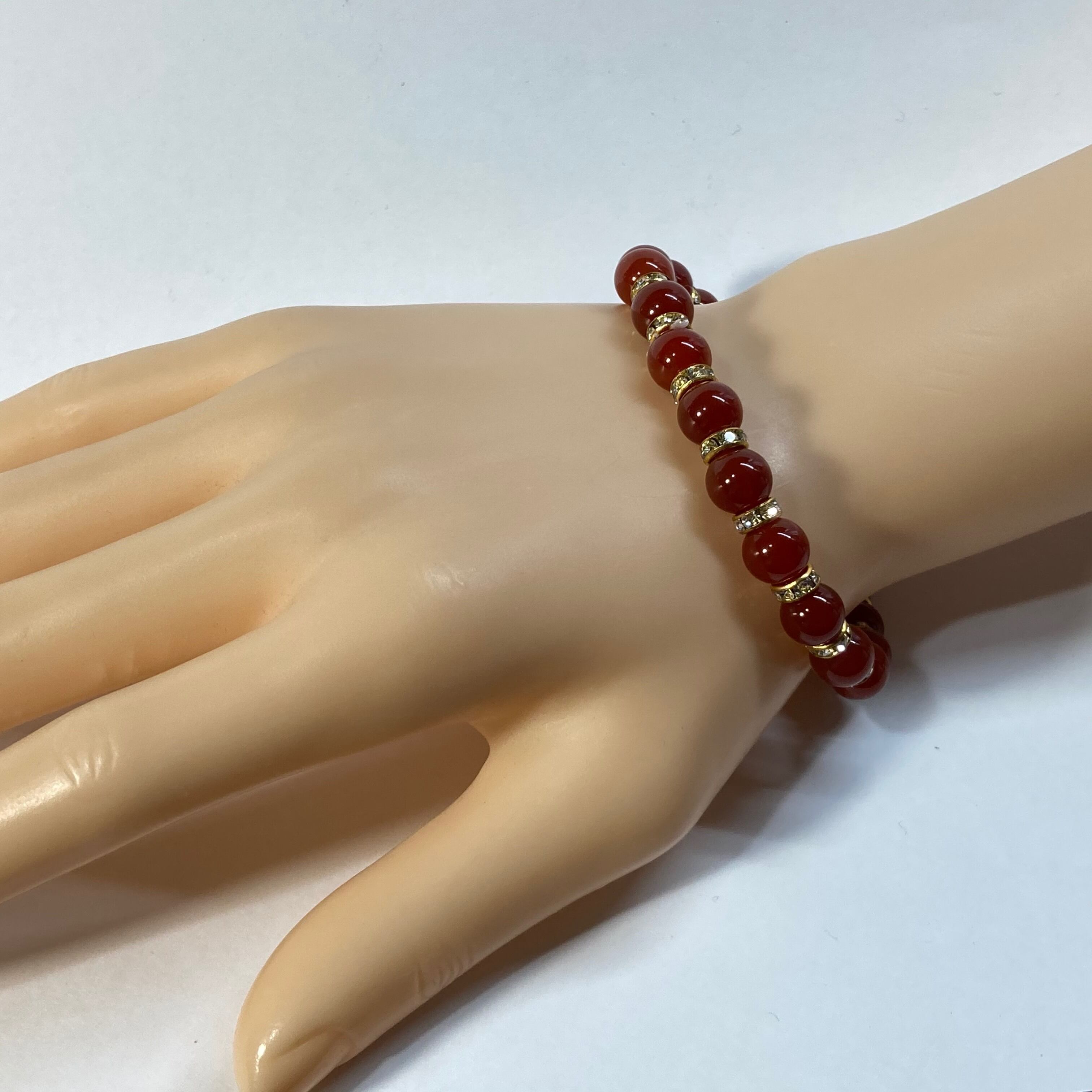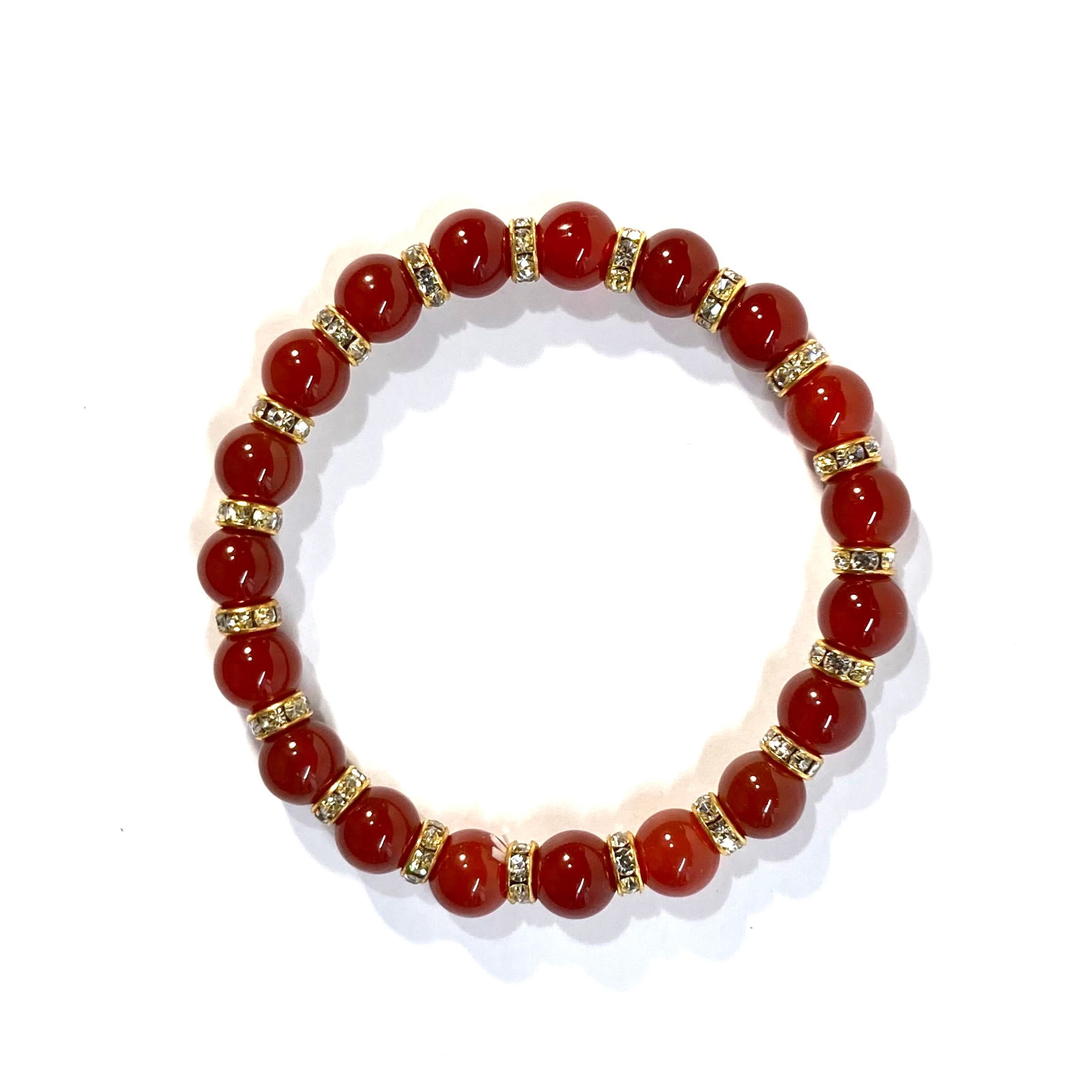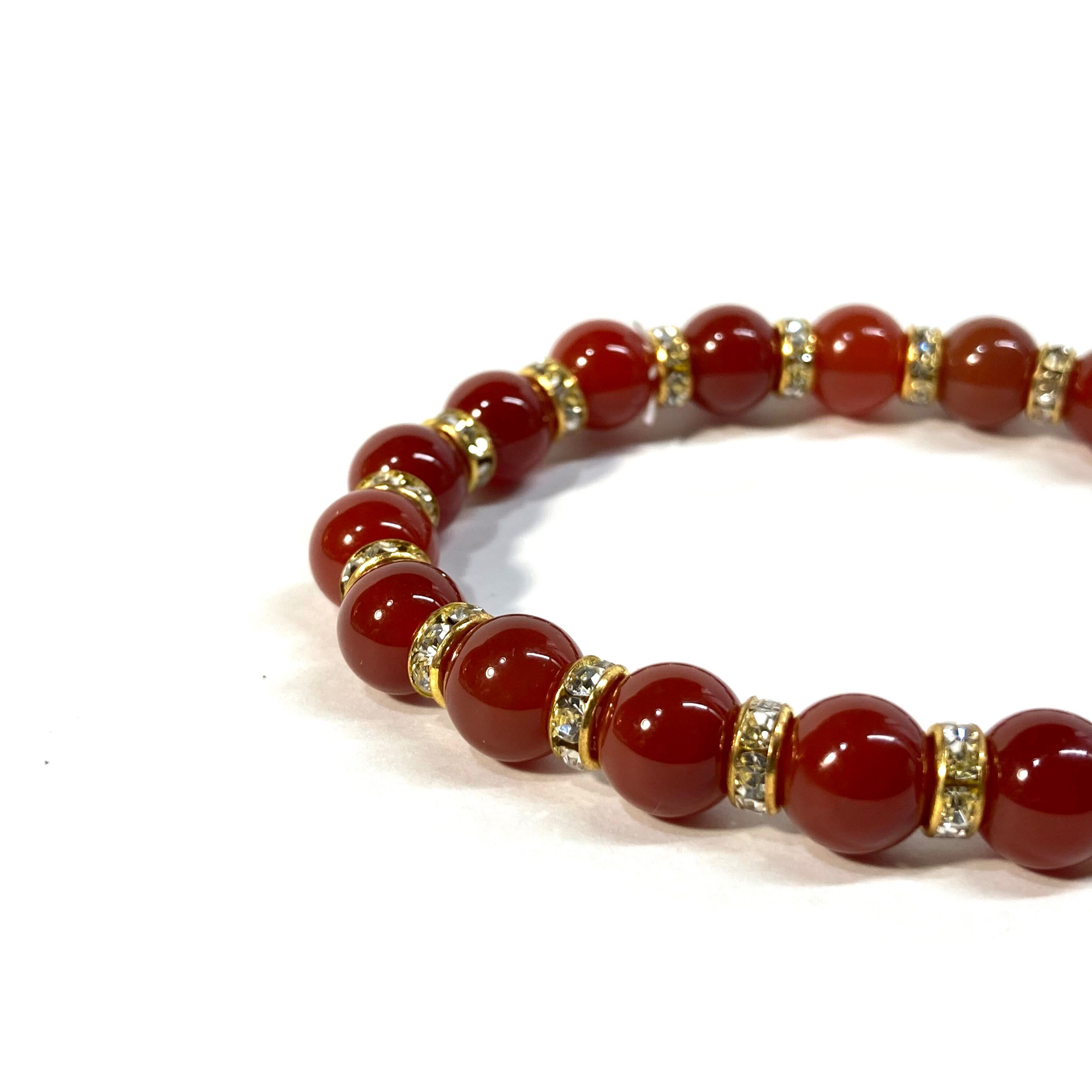 こちらは、赤瑪瑙の8mm玉を使用したパワーストーンブレスレットです。石との間にはロンデルを挟み高級感を演出しております。シンプルなデザインは、シーン問わずどんなコーディネートとも合わせ易いブレスレットです。サイズは内周約15cm (手首周りを測り少し余裕をもってお買い求めくださいませ。)です。当社の中でも一番人気の実績があるデザインとなっております。気になる方はお早めにどうぞ。