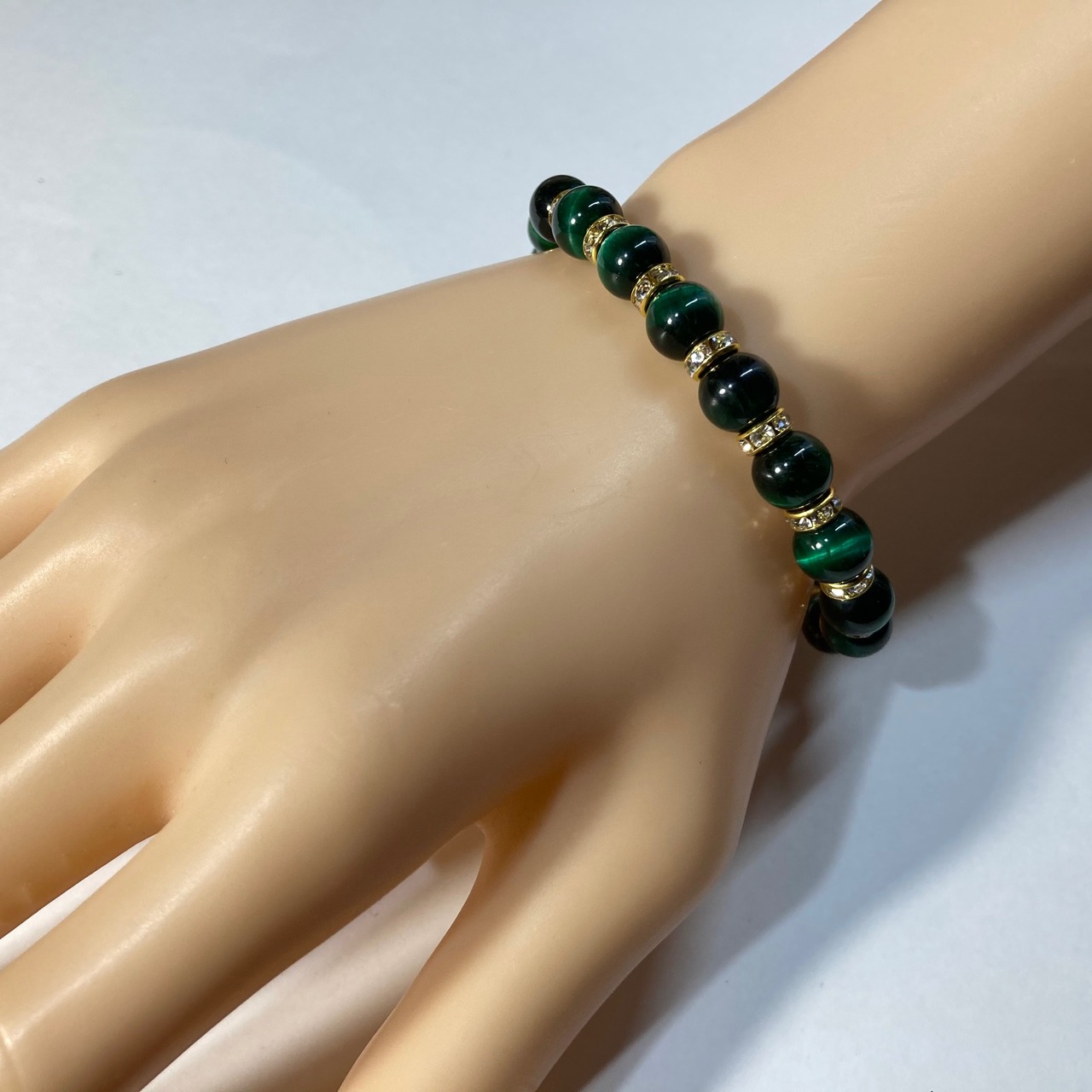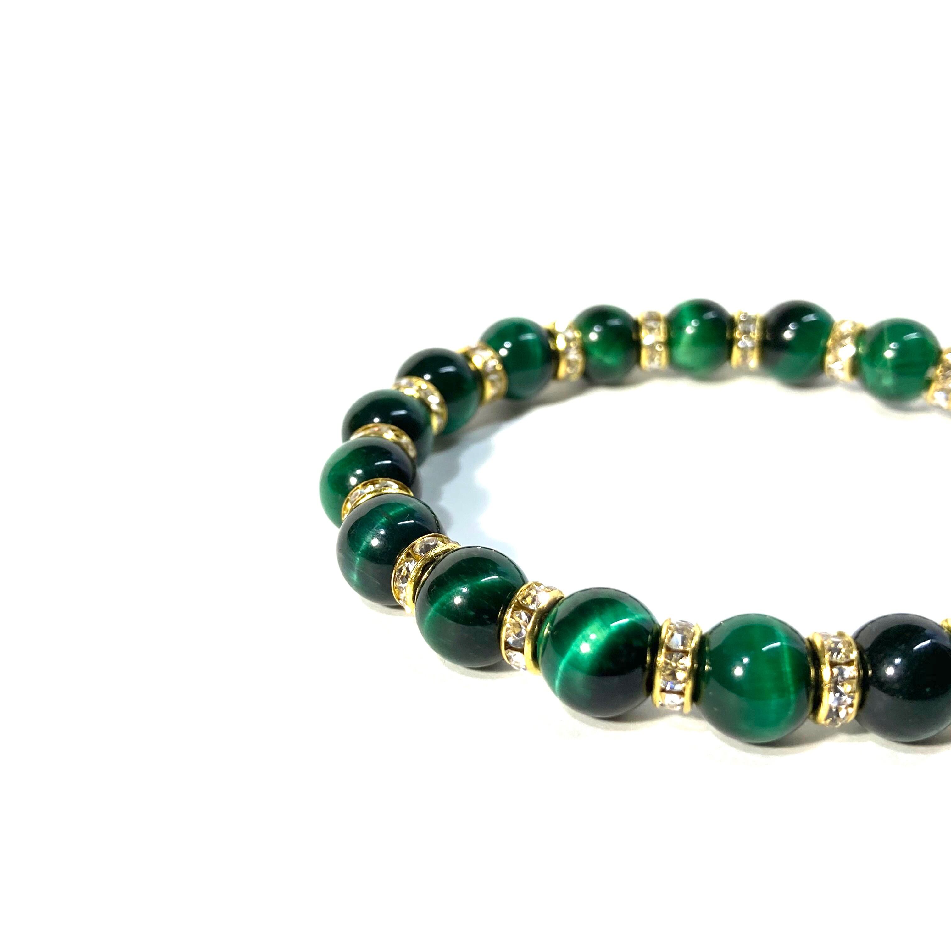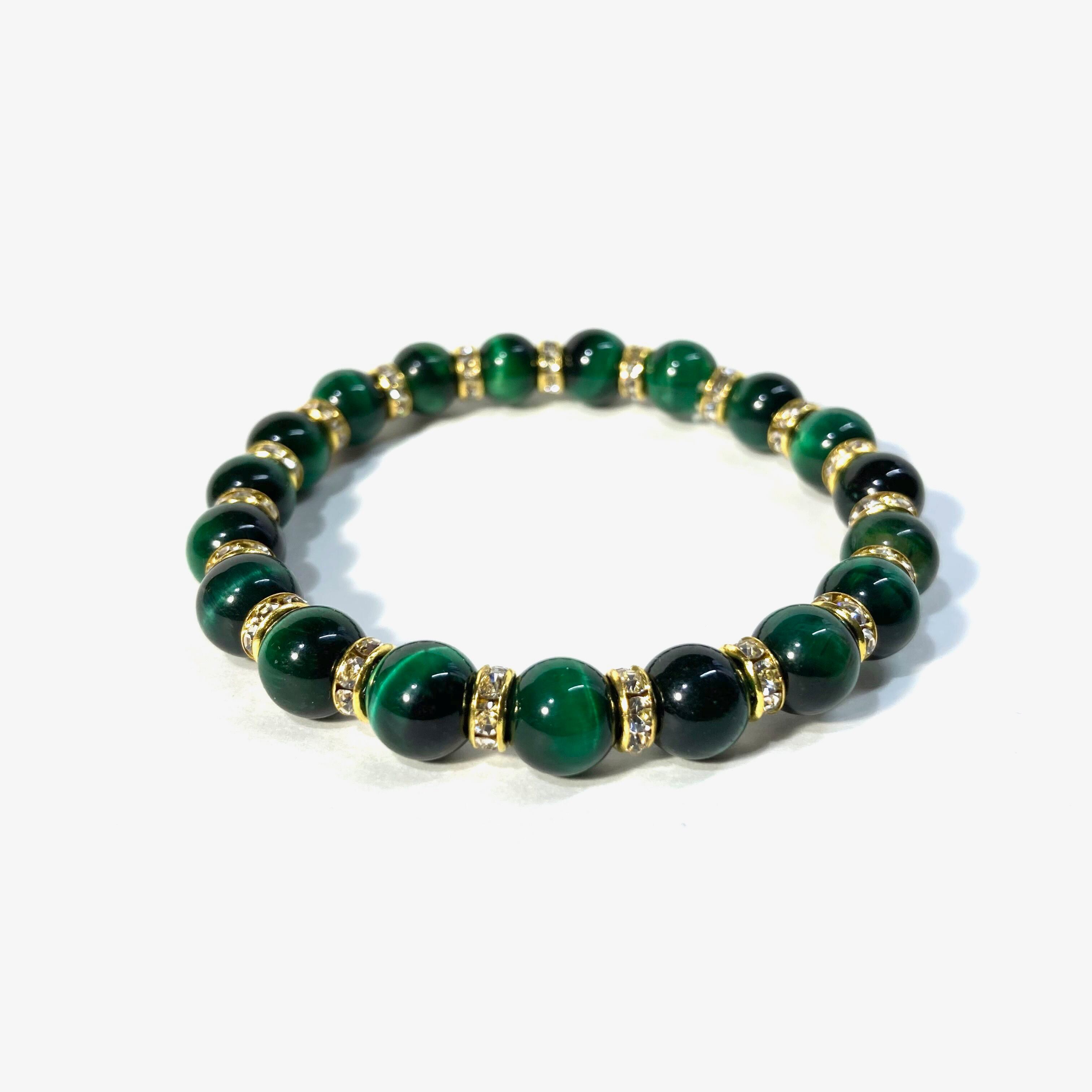 こちらは、グリーンタイガーアイの8mm玉を使用したパワーストーンブレスレットです。石との間にはロンデルを挟み高級感を演出しております。シンプルなデザインは、シーン問わずどんなコーディネートとも合わせ易いブレスレットです。サイズは内周約15cm (手首周りを測り少し余裕をもってお買い求めくださいませ。)です。当社の中でも一番人気の実績があるデザインとなっております。気になる方はお早めにどうぞ。