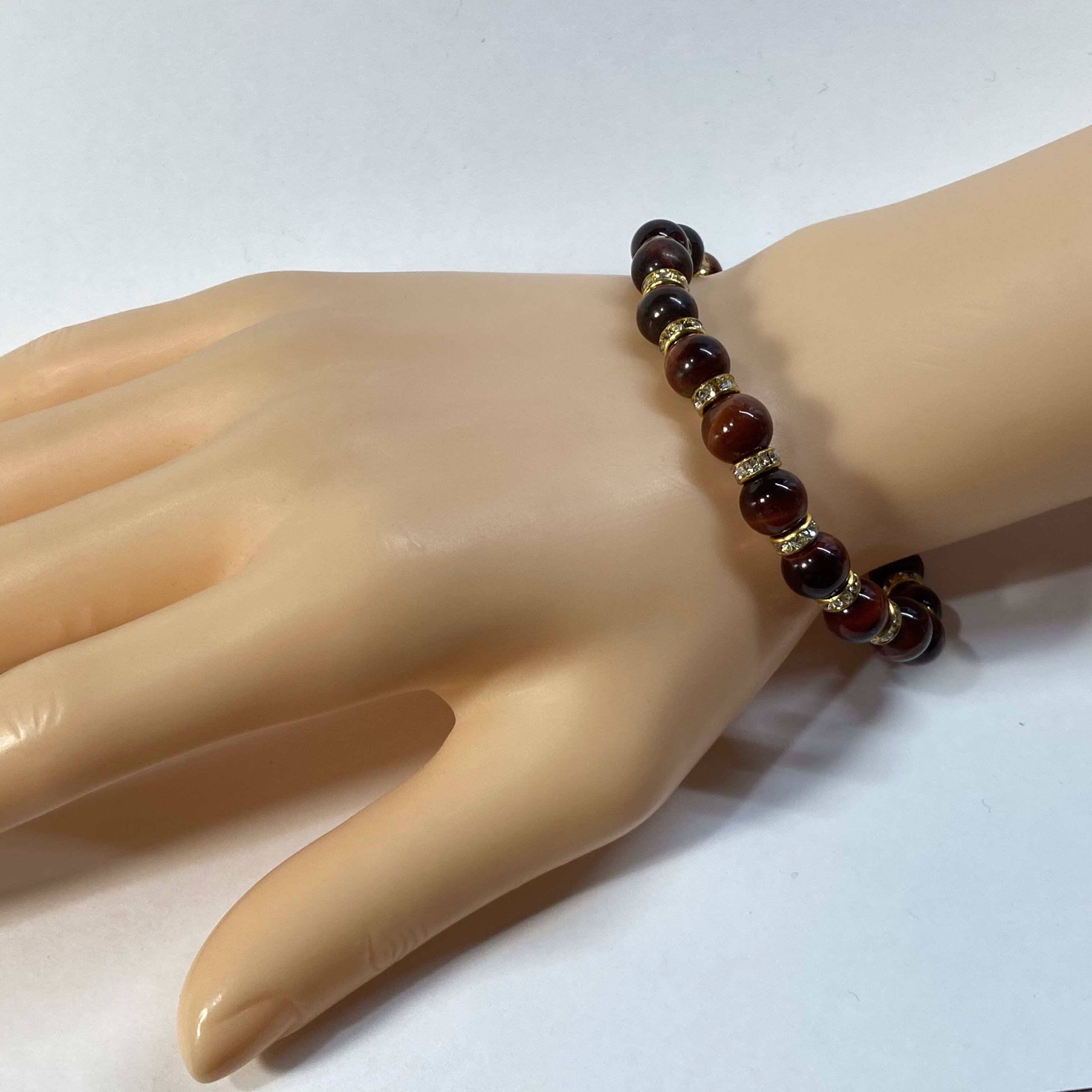 こちらは、レッドタイガーアイの8mm玉を使用したパワーストーンブレスレットです。石との間にはロンデルを挟み高級感を演出しております。シンプルなデザインは、シーン問わずどんなコーディネートとも合わせ易いブレスレットです。サイズは内周約15cm (手首周りを測り少し余裕をもってお買い求めくださいませ。)です。当社の中でも一番人気の実績があるデザインとなっております。気になる方はお早めにどうぞ。