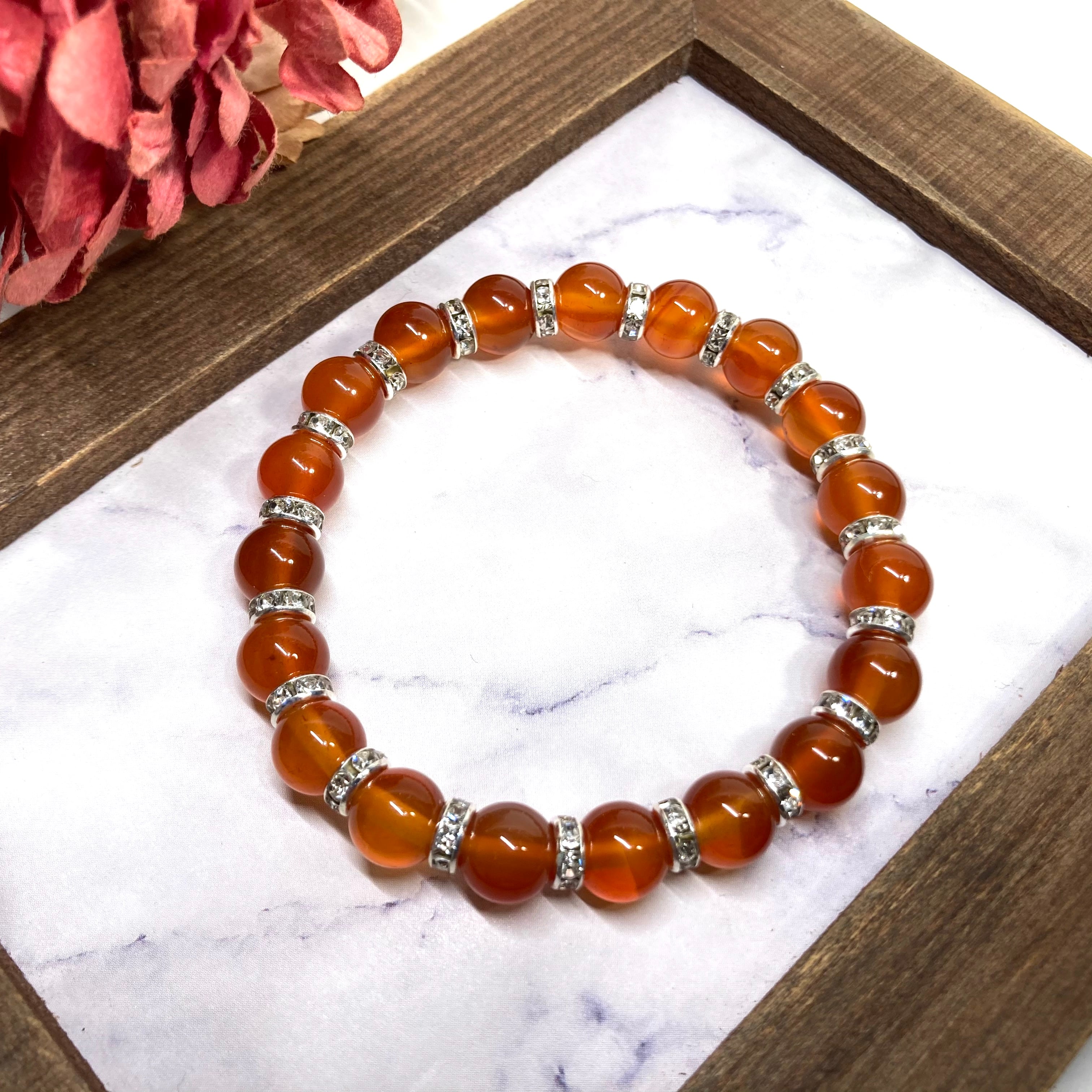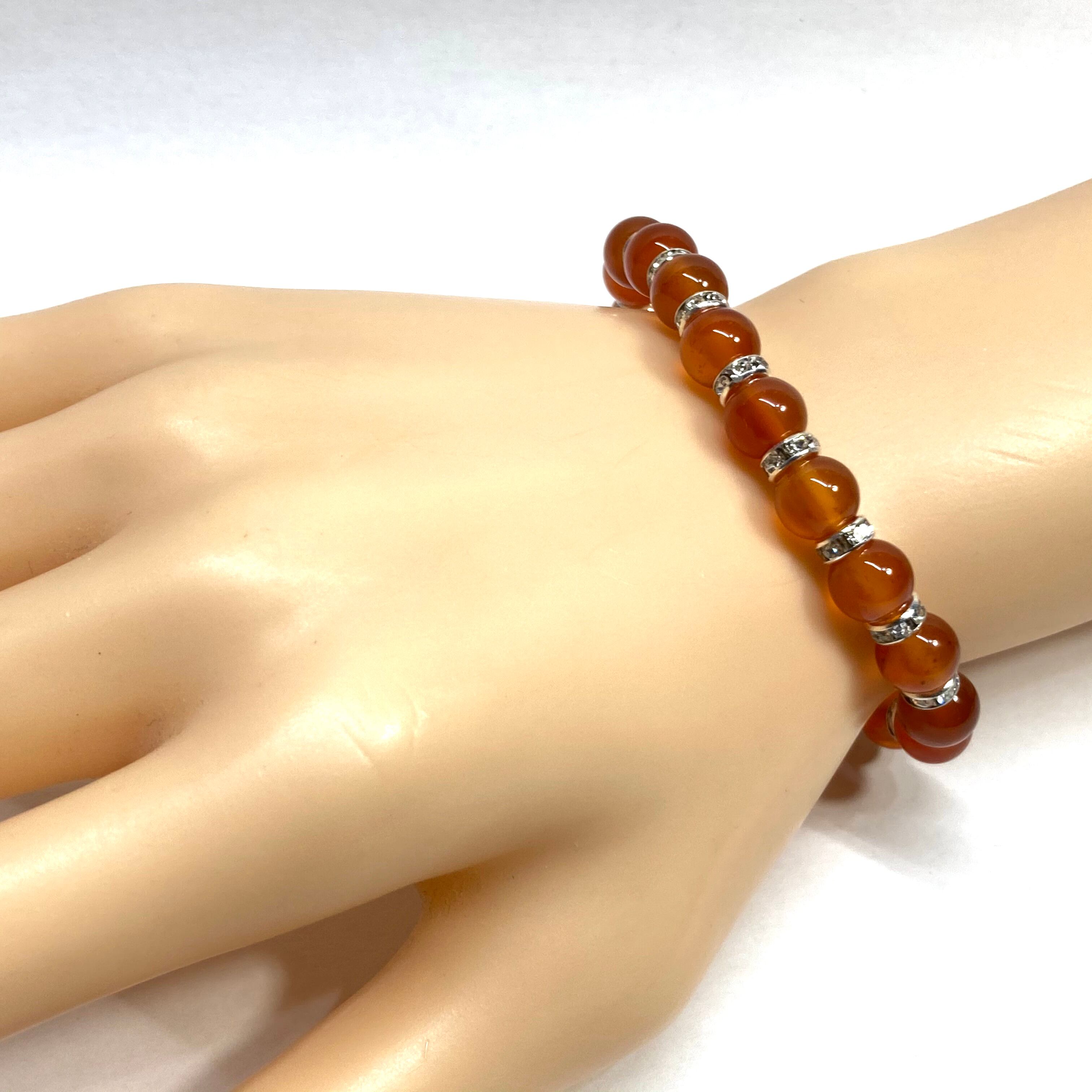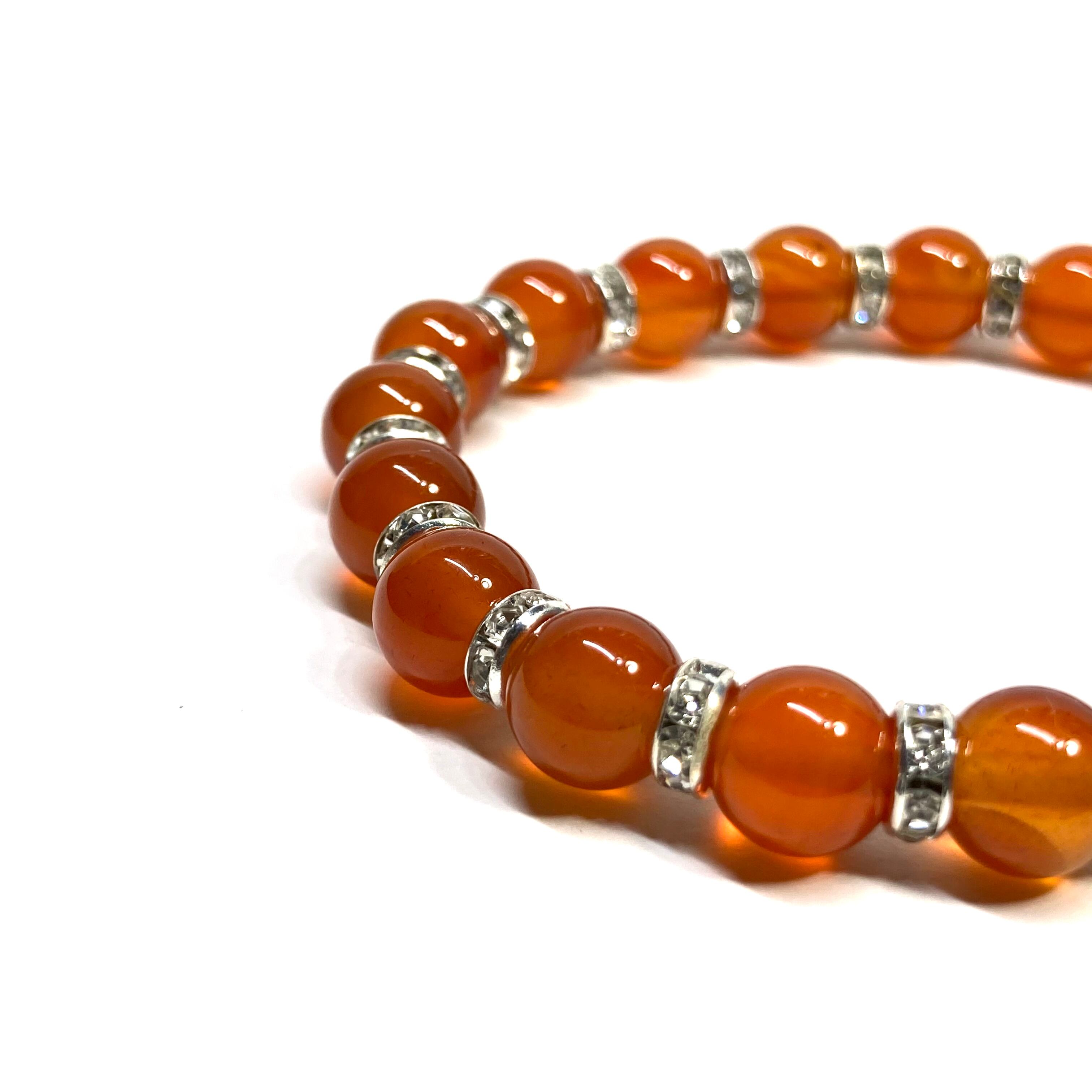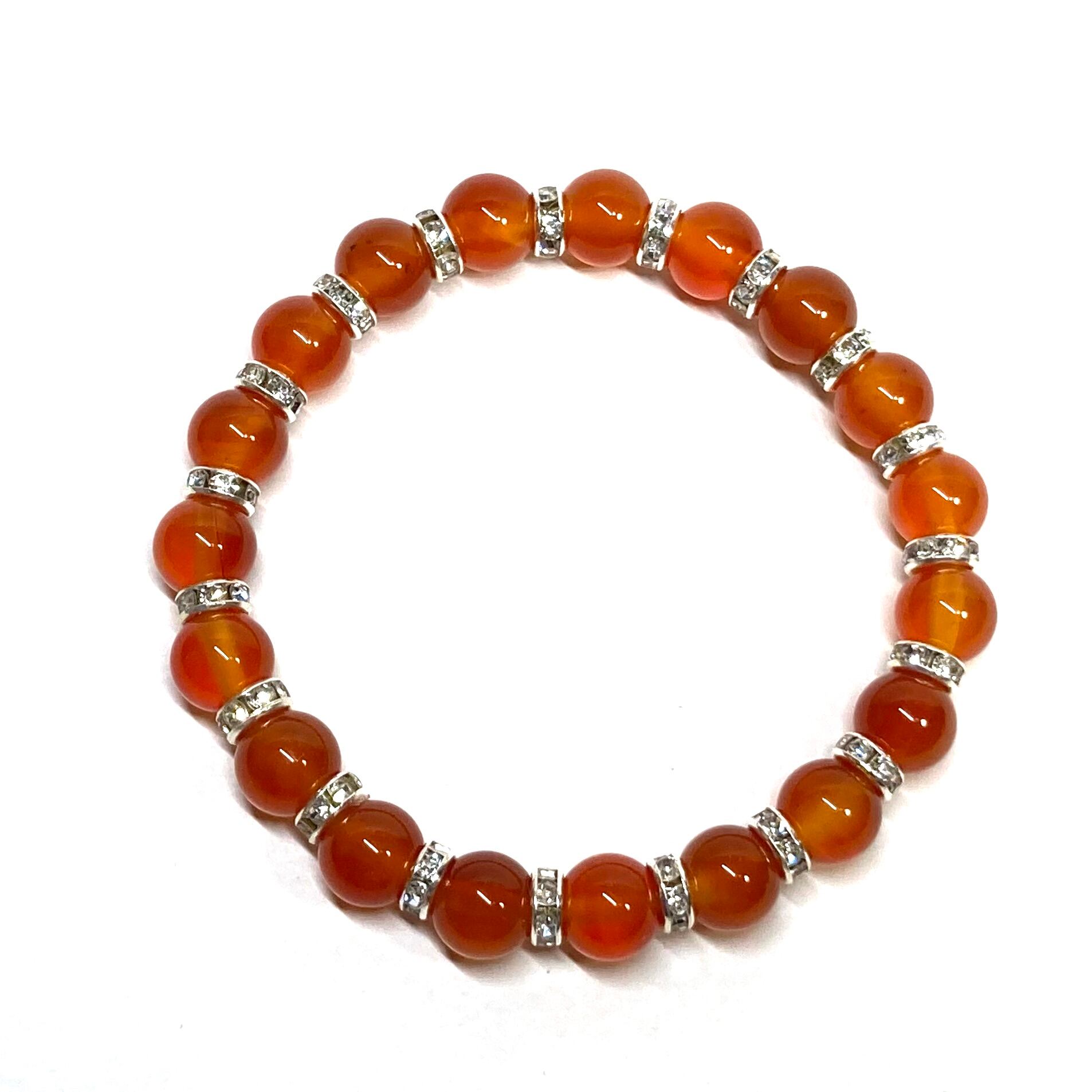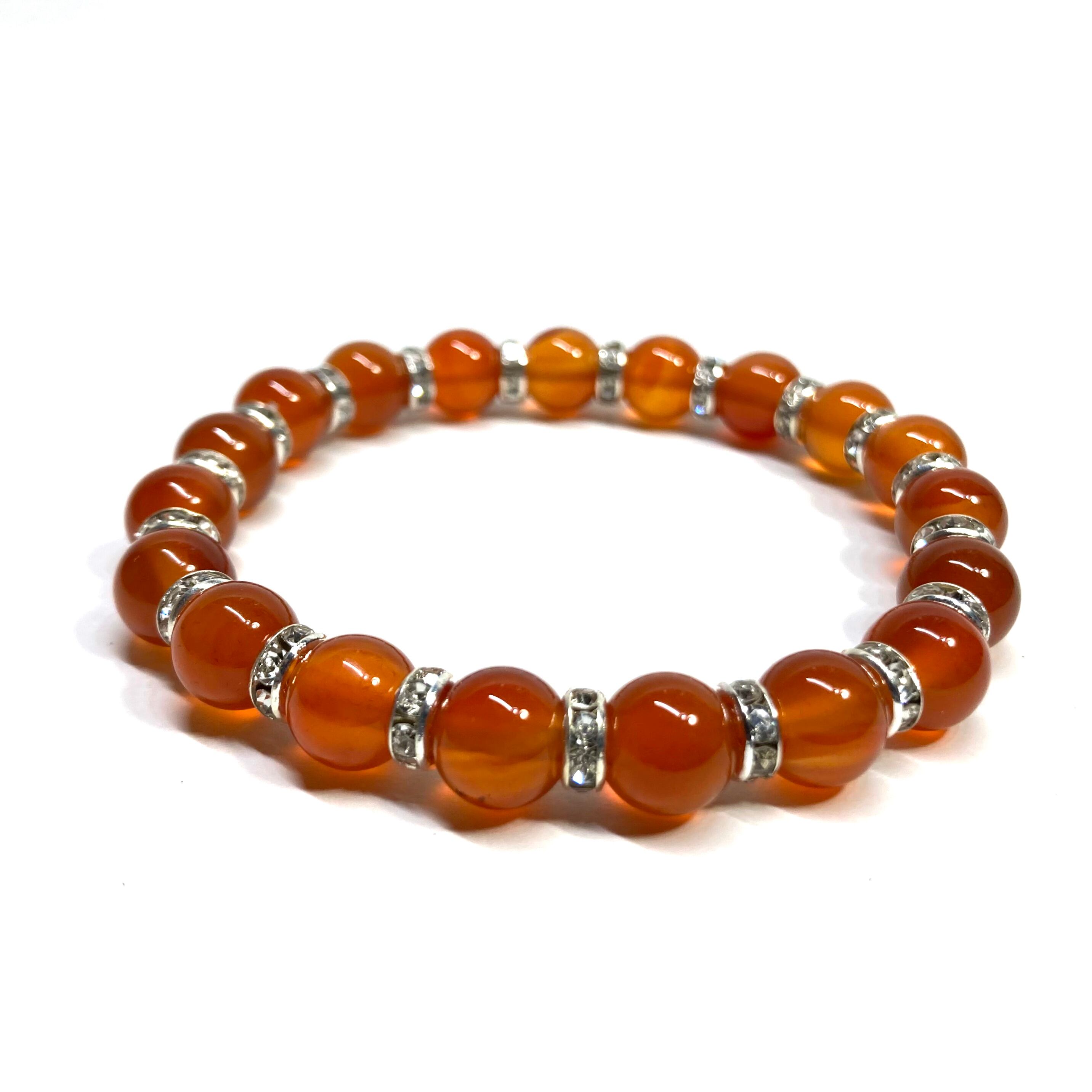 こちらは、カーネリアンの8mm玉を使用したパワーストーンブレスレットです。石との間にはロンデルを挟み高級感を演出しております。シンプルなデザインは、シーン問わずどんなコーディネートとも合わせ易いブレスレットです。サイズは内周約15cm (手首周りを測り少し余裕をもってお買い求めくださいませ。)です。当社の中でも一番人気の実績があるデザインとなっております。気になる方はお早めにどうぞ。