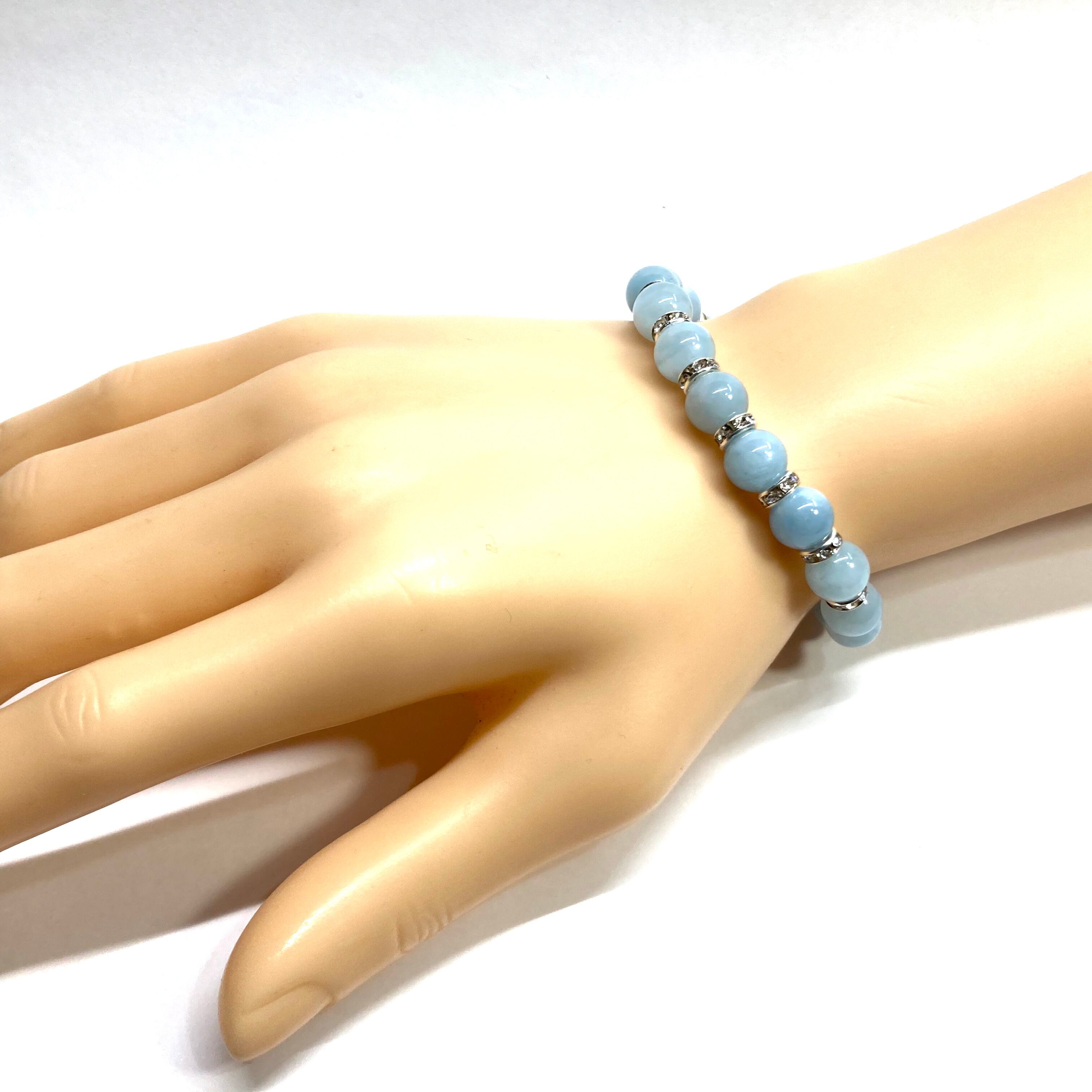 こちらは、アクアマリンの8mm玉を使用したパワーストーンブレスレットです。石との間にはロンデルを挟み高級感を演出しております。シンプルなデザインは、シーン問わずどんなコーディネートとも合わせ易いブレスレットです。サイズは内周約15cm (手首周りを測り少し余裕をもってお買い求めくださいませ。)です。当社の中でも一番人気の実績があるデザインとなっております。気になる方はお早めにどうぞ。