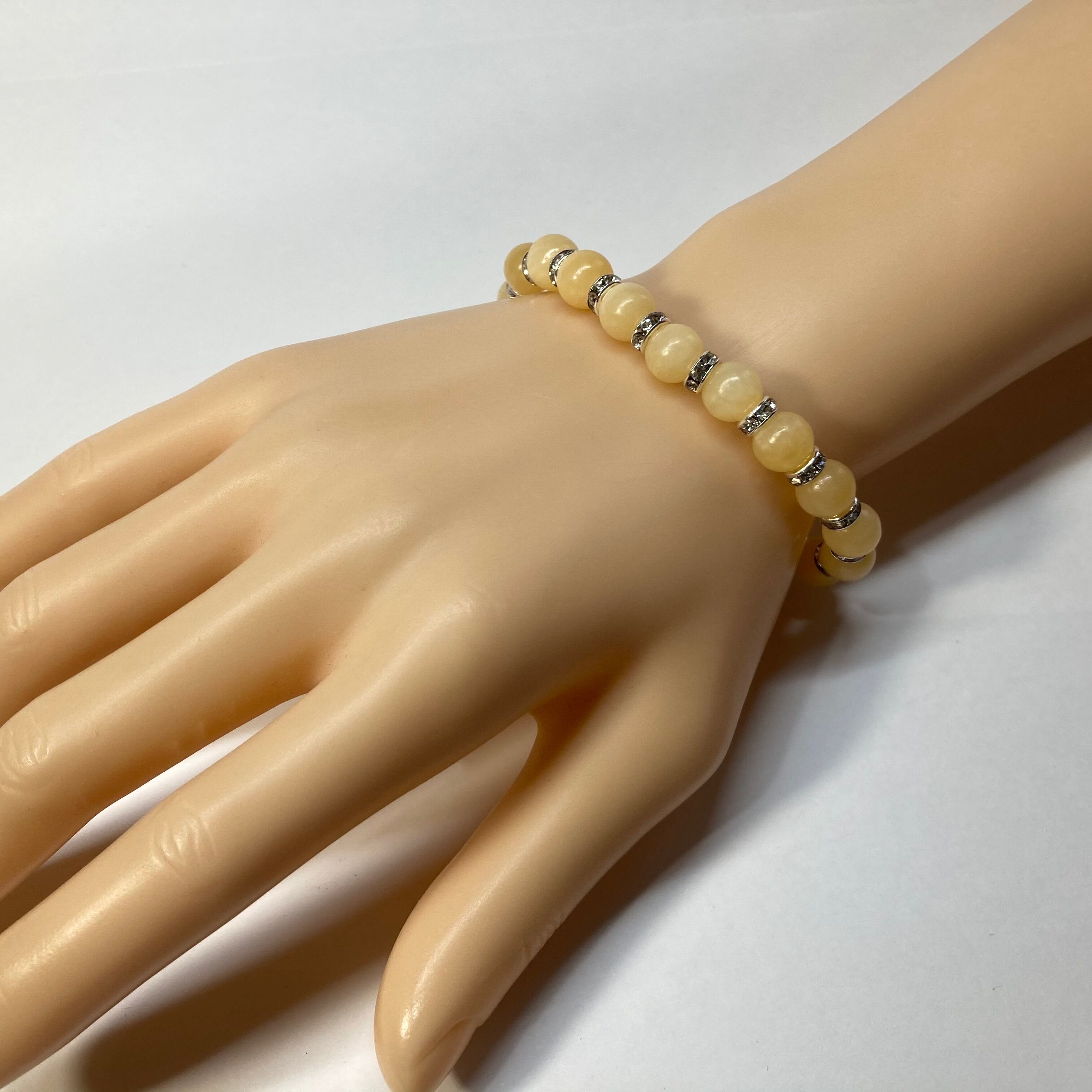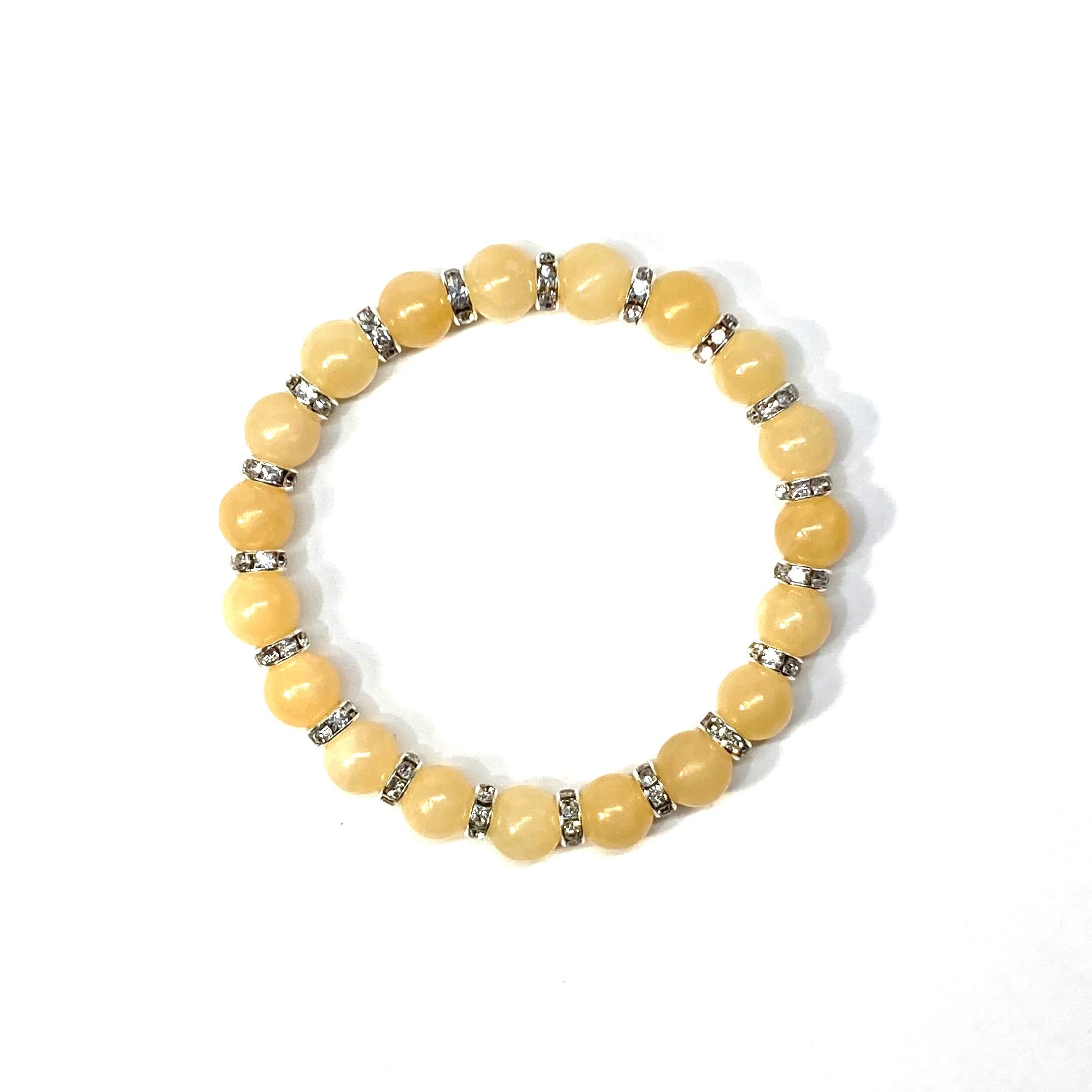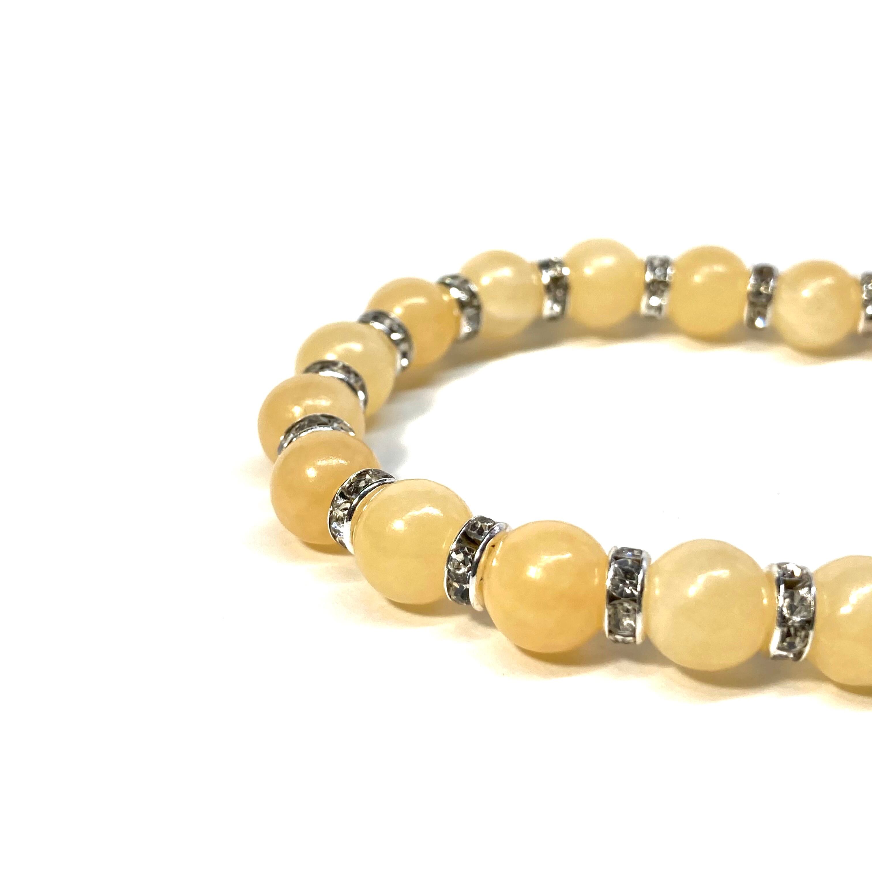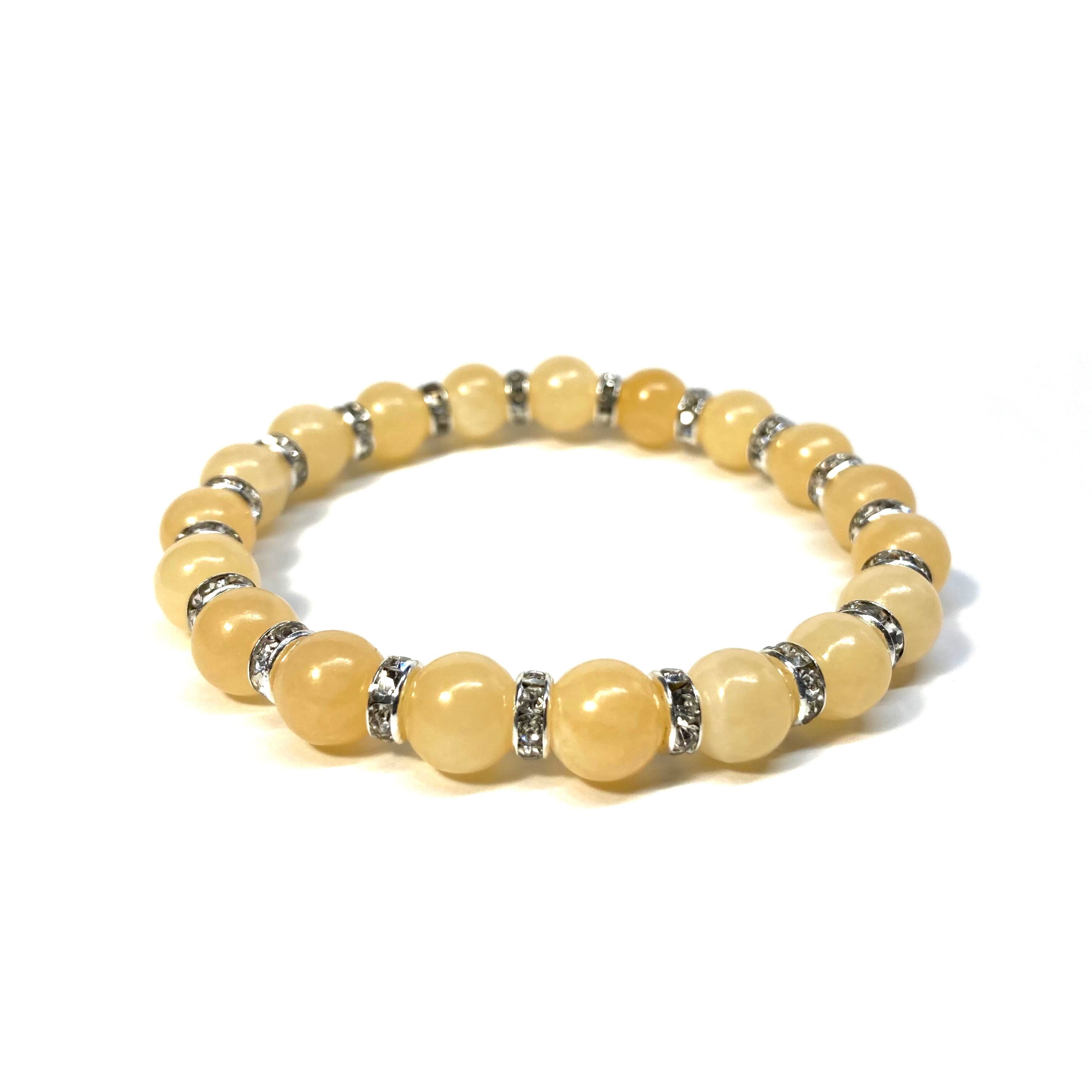 こちらは、アラゴナイトの8mm玉を使用したパワーストーンブレスレットです。石との間にはロンデルを挟み高級感を演出しております。シンプルなデザインは、シーン問わずどんなコーディネートとも合わせ易いブレスレットです。サイズは内周約15cm (手首周りを測り少し余裕をもってお買い求めくださいませ。)です。当社の中でも一番人気の実績があるデザインとなっております。気になる方はお早めにどうぞ。