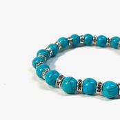 こちらは、ターコイズの8mm玉を使用したパワーストーンブレスレットです。石との間にはロンデルを挟み高級感を演出しております。シンプルなデザインは、シーン問わずどんなコーディネートとも合わせ易いブレスレットです。サイズは内周約15cm (手首周りを測り少し余裕をもってお買い求めくださいませ。)です。当社の中でも一番人気の実績があるデザインとなっております。気になる方はお早めにどうぞ。