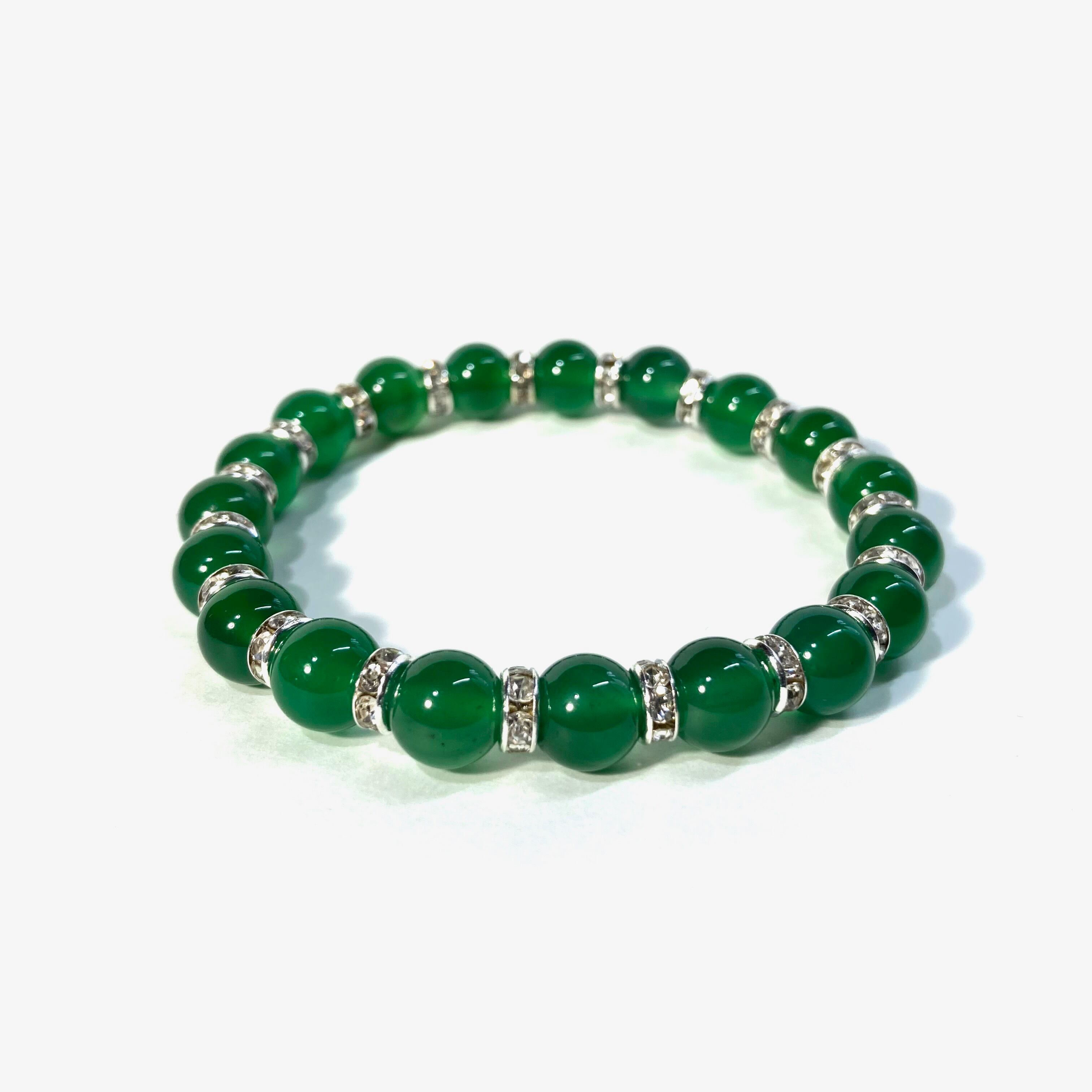 こちらは、緑瑪瑙の8mm玉を使用したパワーストーンブレスレットです。石との間にはロンデルを挟み高級感を演出しております。シンプルなデザインは、シーン問わずどんなコーディネートとも合わせ易いブレスレットです。サイズは内周約15cm (手首周りを測り少し余裕をもってお買い求めくださいませ。)です。当社の中でも一番人気の実績があるデザインとなっております。気になる方はお早めにどうぞ。