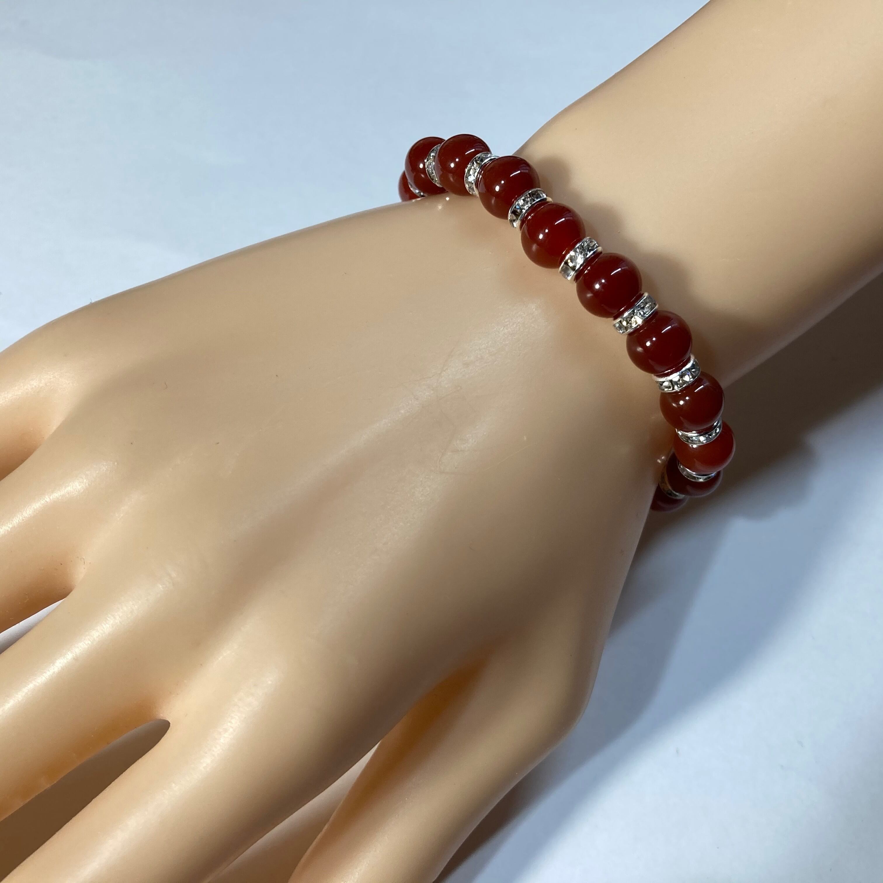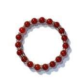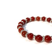 こちらは、赤瑪瑙の8mm玉を使用したパワーストーンブレスレットです。石との間にはロンデルを挟み高級感を演出しております。シンプルなデザインは、シーン問わずどんなコーディネートとも合わせ易いブレスレットです。サイズは内周約15cm (手首周りを測り少し余裕をもってお買い求めくださいませ。)です。当社の中でも一番人気の実績があるデザインとなっております。気になる方はお早めにどうぞ。