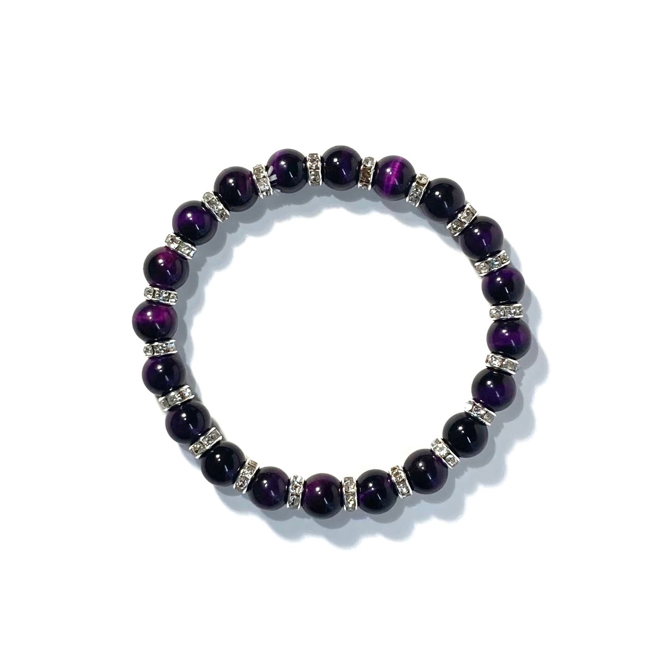 こちらは、パープルタイガーアイの8mm玉を使用したパワーストーンブレスレットです。石との間にはロンデルを挟み高級感を演出しております。シンプルなデザインは、シーン問わずどんなコーディネートとも合わせ易いブレスレットです。サイズは内周約15cm (手首周りを測り少し余裕をもってお買い求めくださいませ。)です。当社の中でも一番人気の実績があるデザインとなっております。気になる方はお早めにどうぞ。