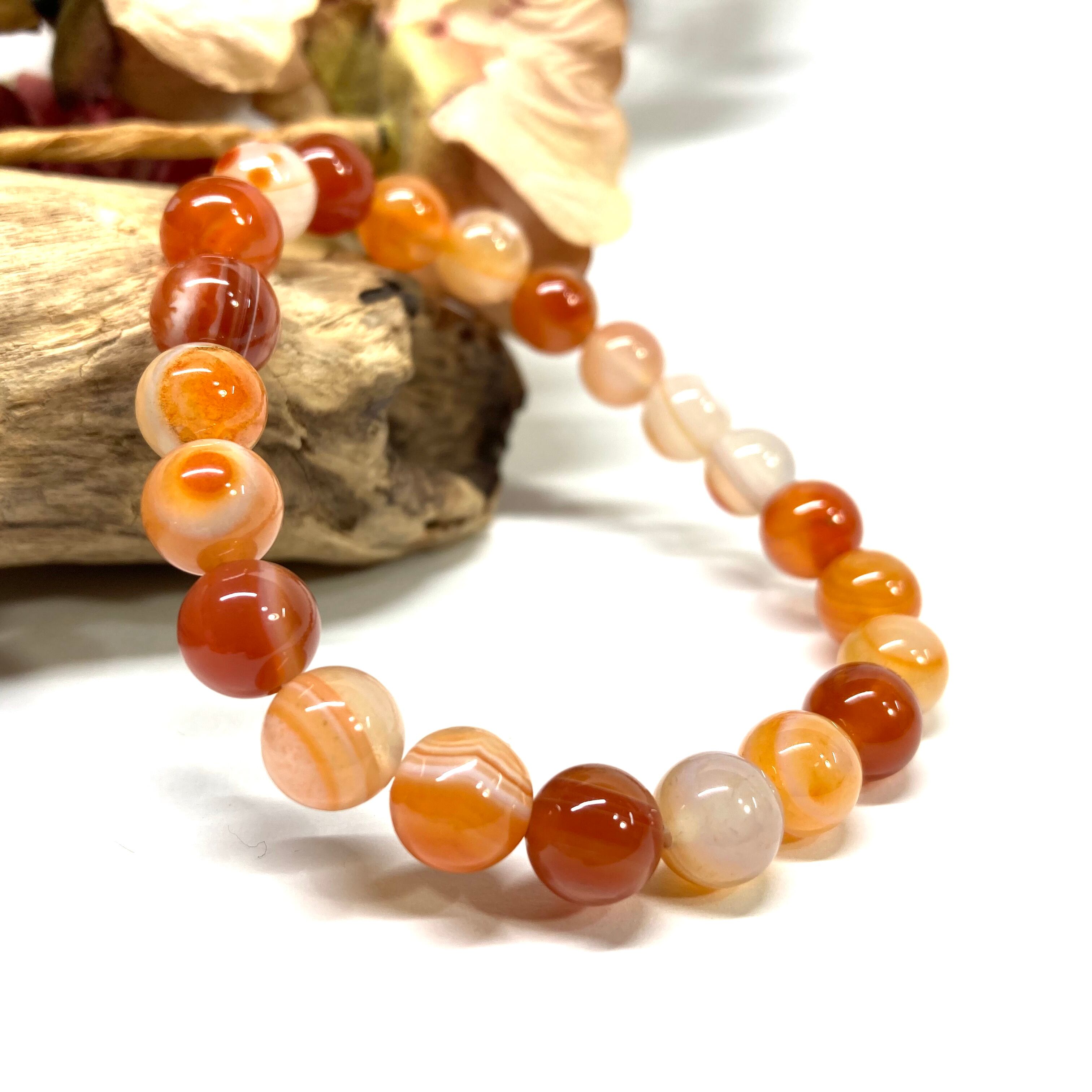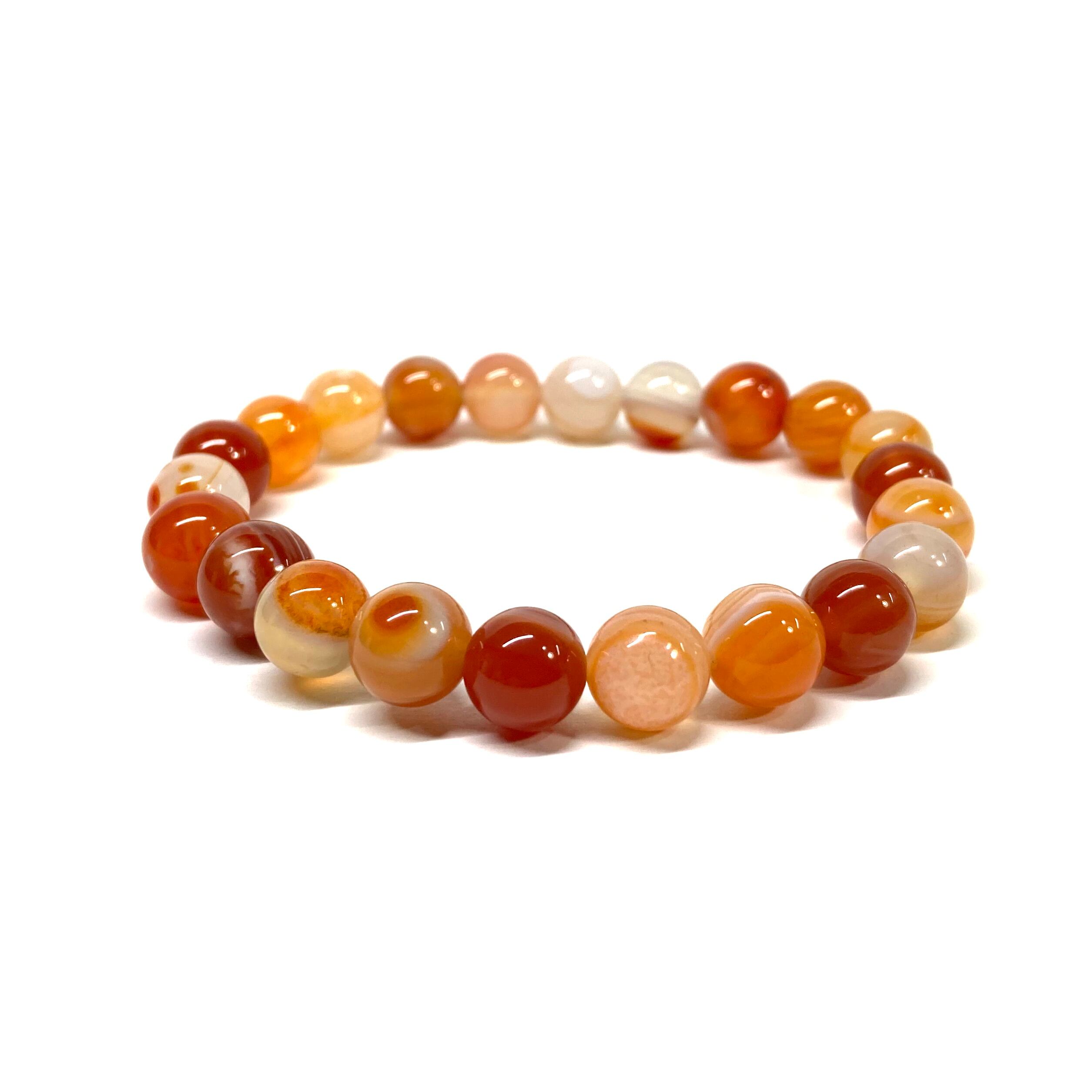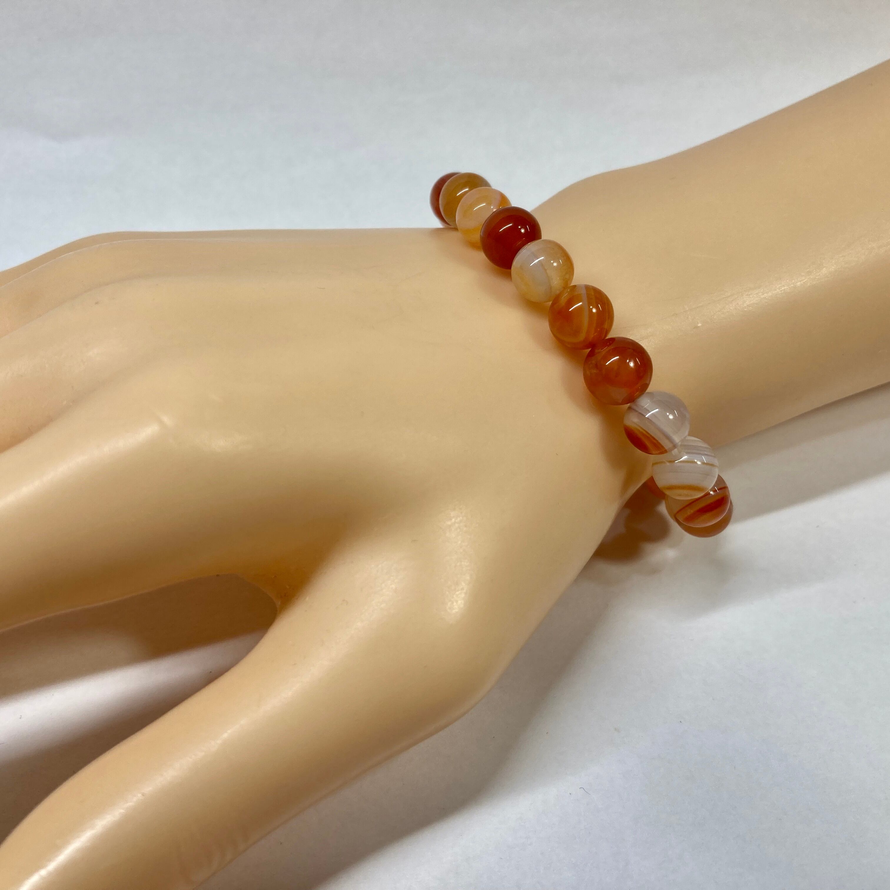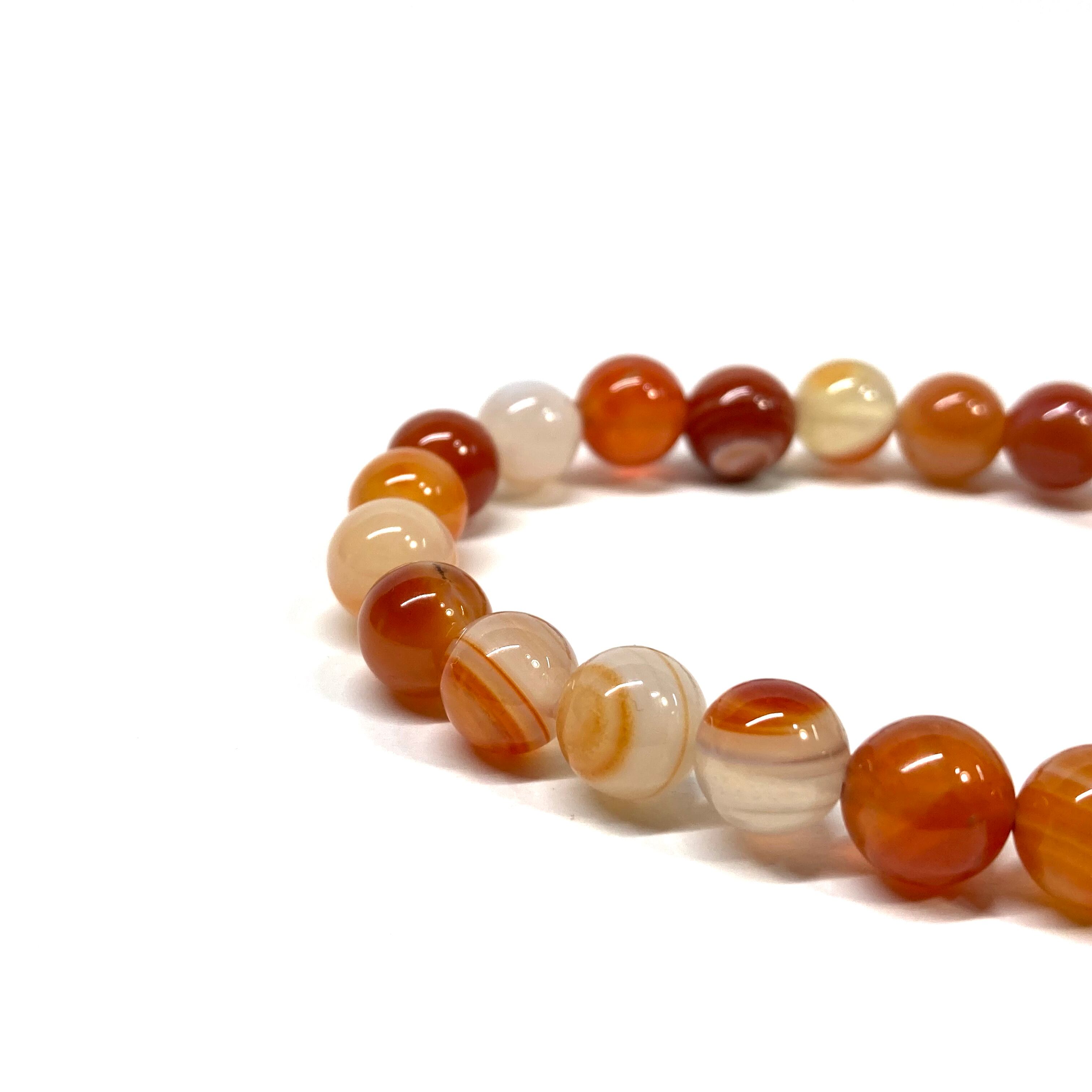 こちらは、カーネリアン・サードニクスの8mm玉を使用したパワーストーンブレスレットです。石との間にはロンデルを挟み高級感を演出しております。シンプルなデザインは、シーン問わずどんなコーディネートとも合わせ易いブレスレットです。サイズは内周約15cm (手首周りを測り少し余裕をもってお買い求めくださいませ。)です。当社の中でも一番人気の実績があるデザインとなっております。気になる方はお早めにどうぞ。