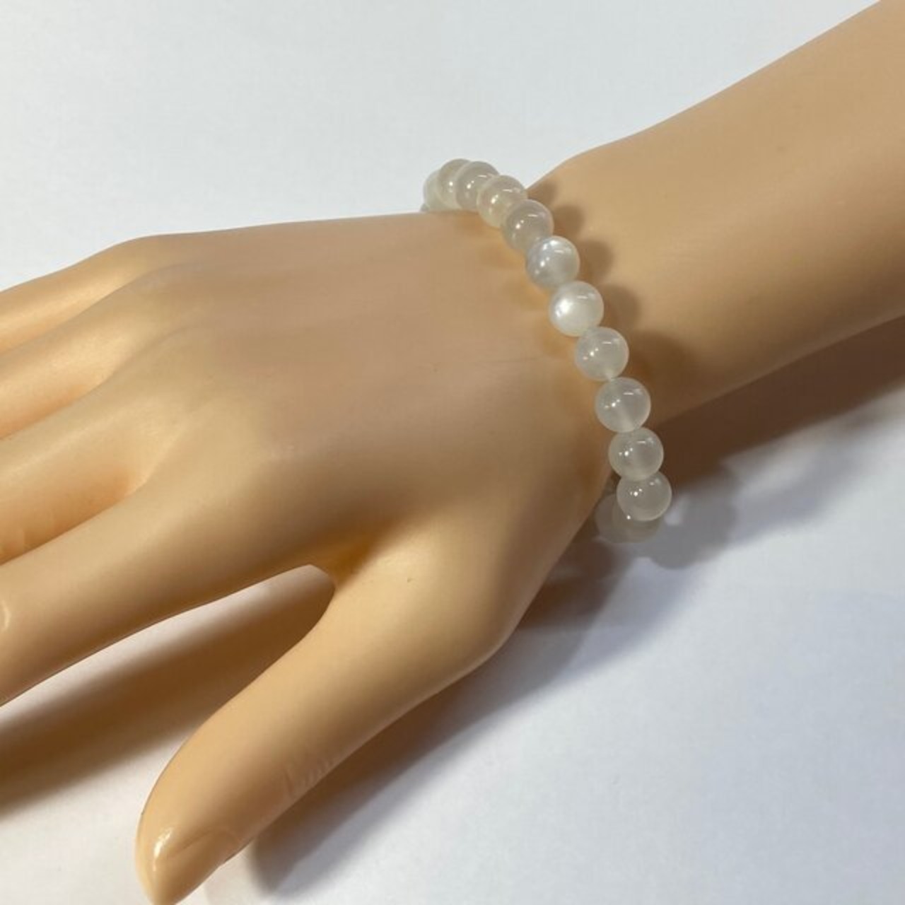 こちらは、ムーンストーンの8mm玉を使用したパワーストーンブレスレットです。シンプルなデザインは、シーン問わずどんなコーディネートとも合わせ易いブレスレットです。内周15cmです。(サイズ変更は1cmあたり100円で承っております。サイズ変更の場合は金額変更しますのでメッセージにてご連絡くださいませ。)気になる方はお早めにどうぞ。