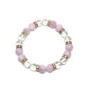 こちらは、8mm玉のクンツァイトと水晶を使用した天然石ブレスレットです。石との間に挟まれたロンデルがアクセントになったデザインです。サイズは内周約15cmです。