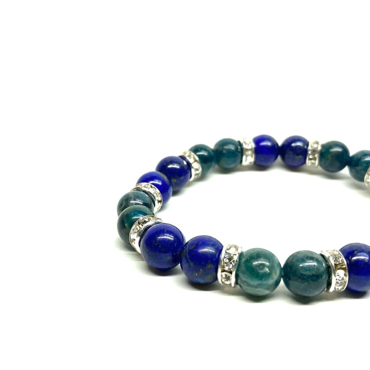 こちらは、8mm玉のラピスラズリとアパタイトを使ったパワーストーンブレスレットです。シンプルなデザインでどんなコーディネートにも合わせやすいデザインに仕上げています。サイズは内周 約15cmです。気になる方は是非この機会にどうぞ。