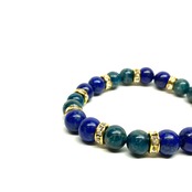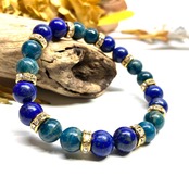 こちらは、8mm玉のラピスラズリとアパタイトを使ったパワーストーンブレスレットです。シンプルなデザインでどんなコーディネートにも合わせやすいデザインに仕上げています。サイズは内周 約15cmです。気になる方は是非この機会にどうぞ。