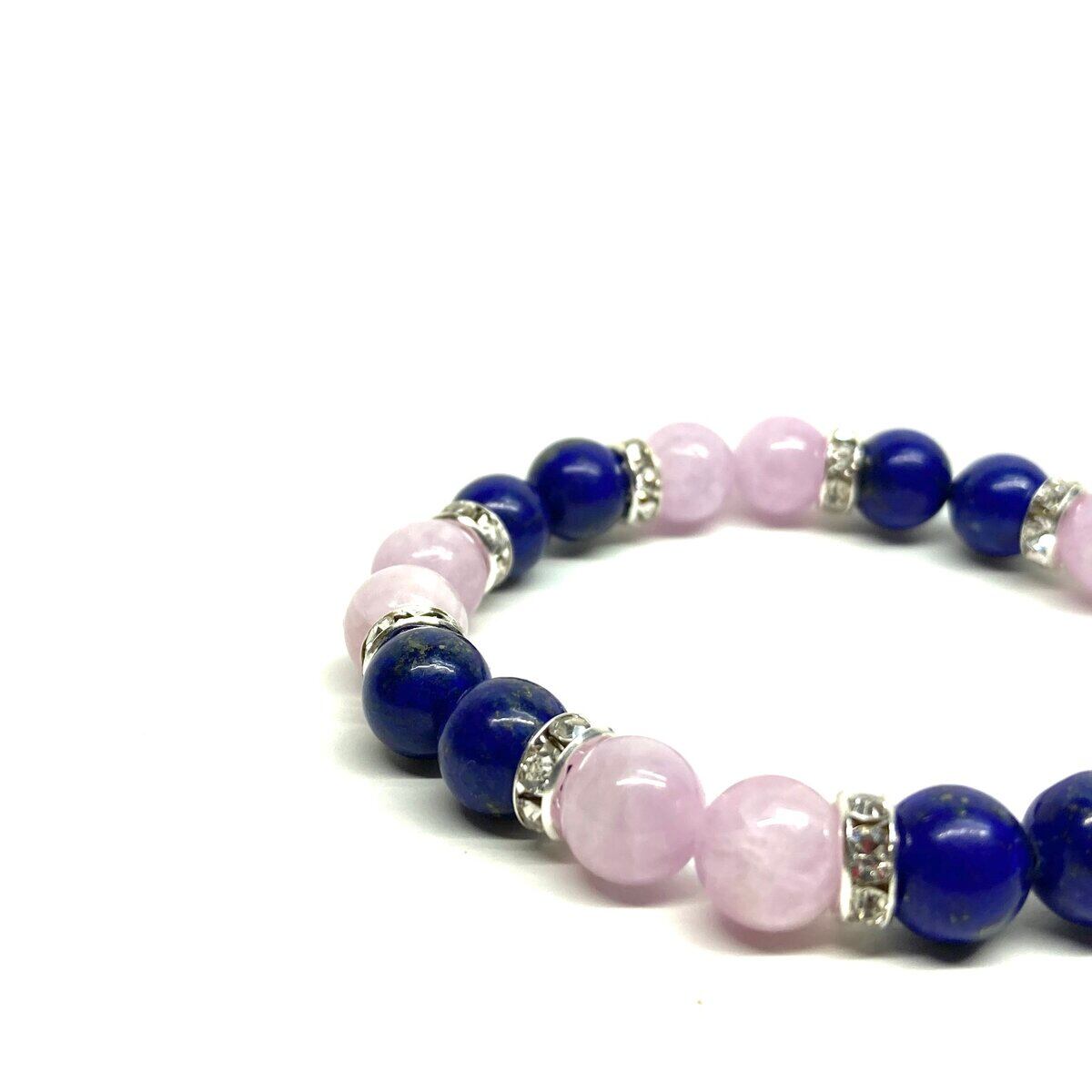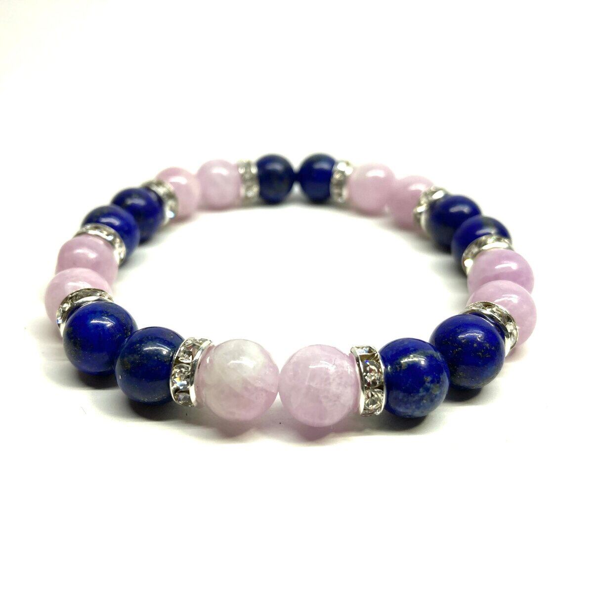 こちらは、8mm玉のラピスラズリとクンツァイトを使ったパワーストーンブレスレットです。シンプルなデザインでどんなコーディネートにも合わせやすいデザインに仕上げています。サイズは内周 約15cmです。気になる方は是非この機会にどうぞ。